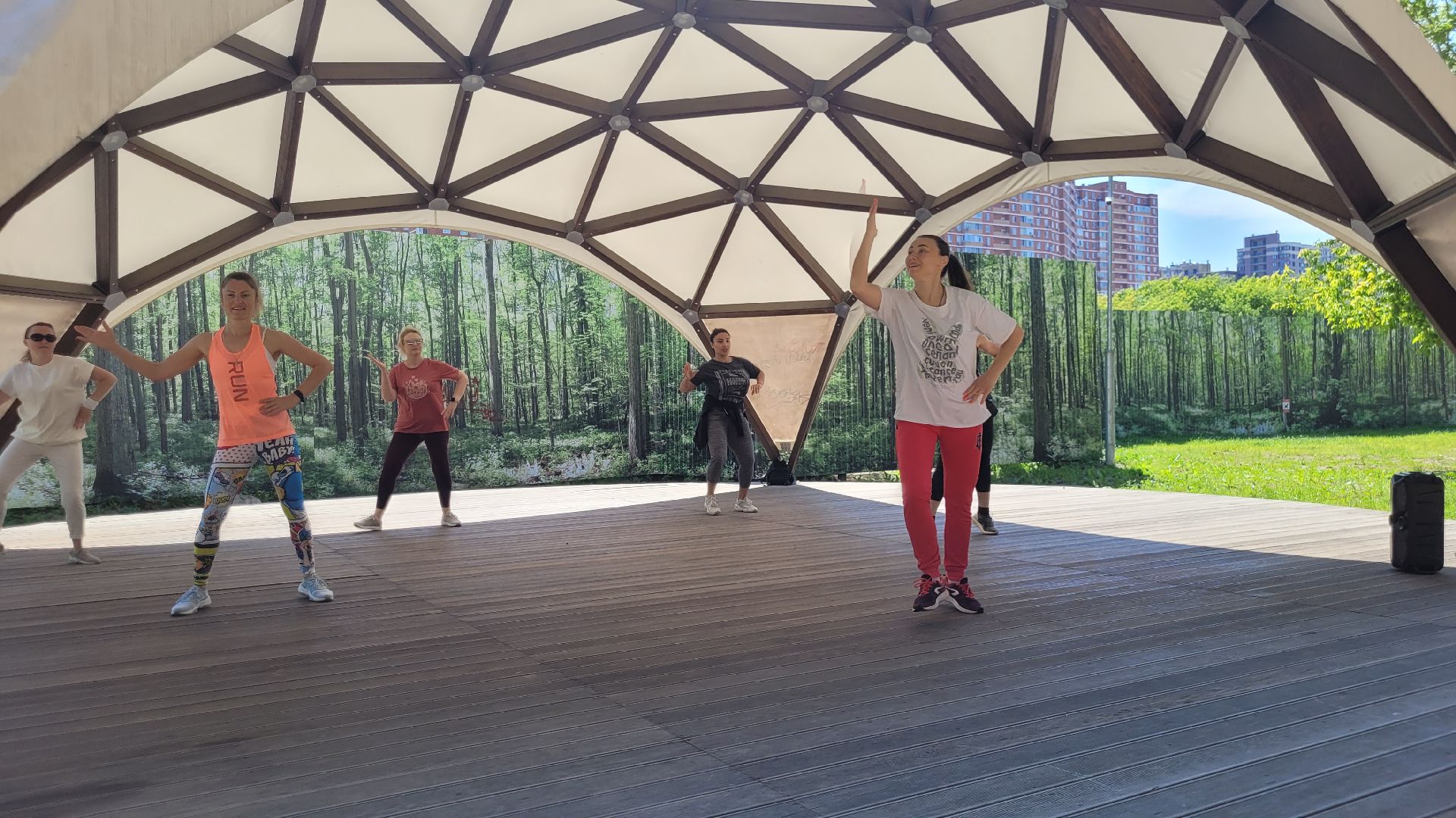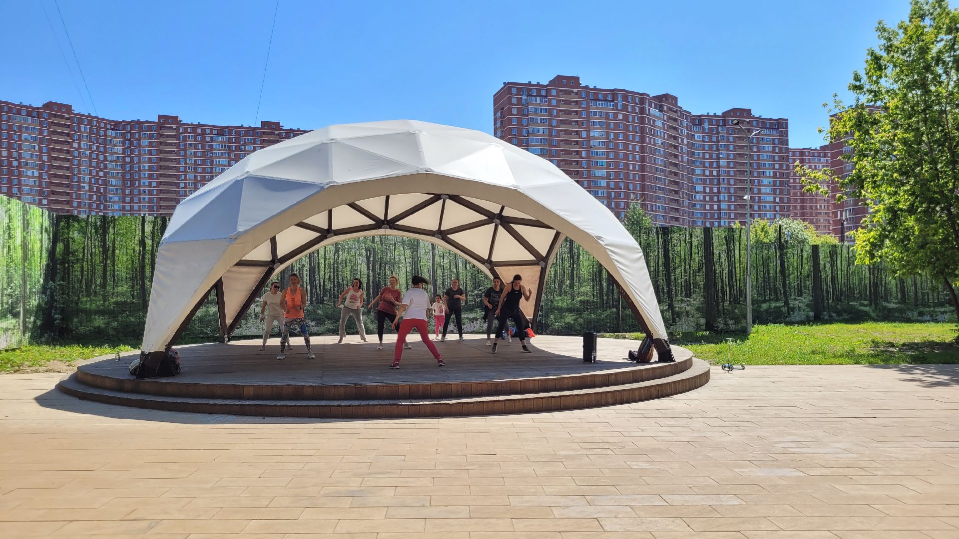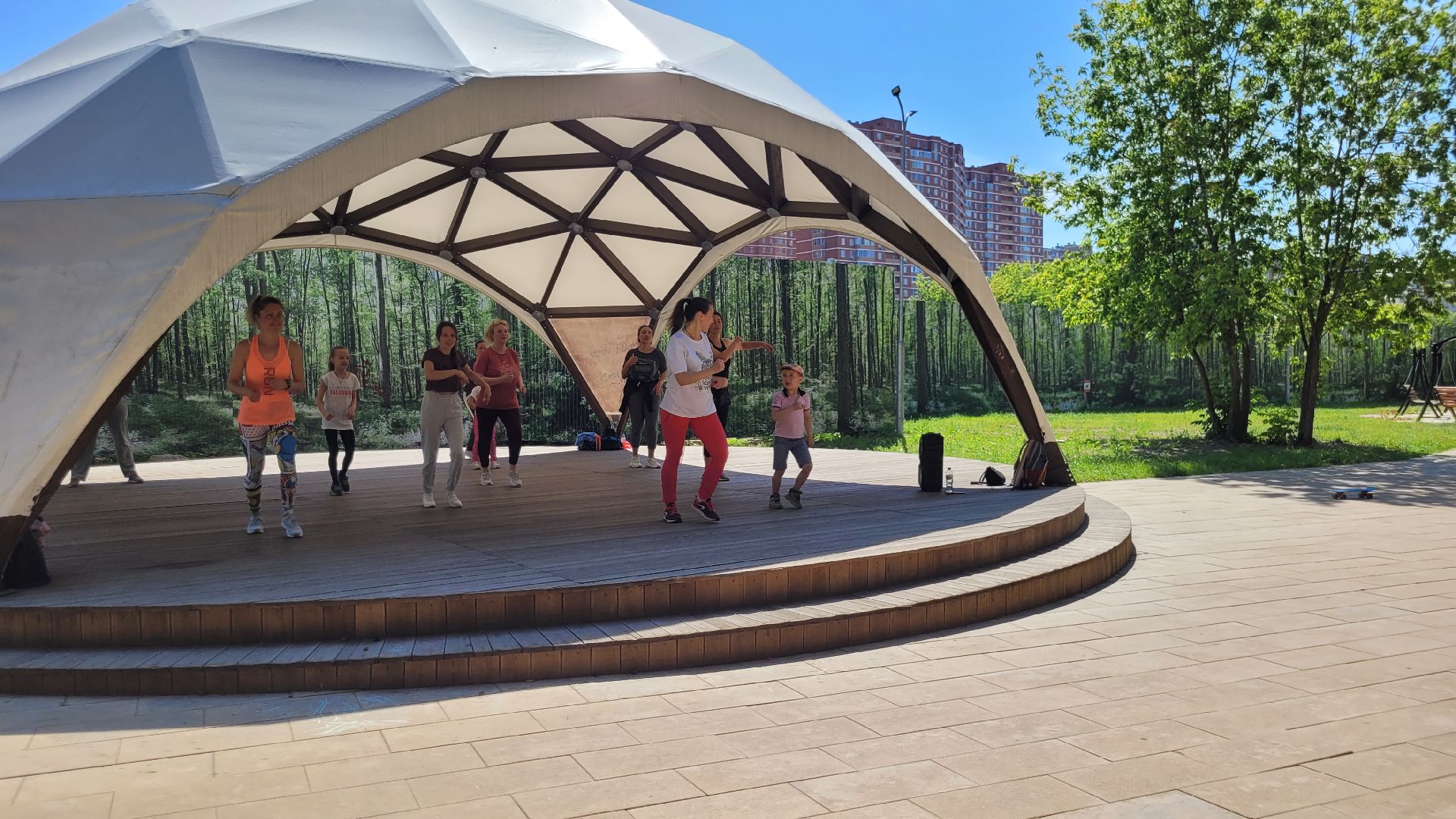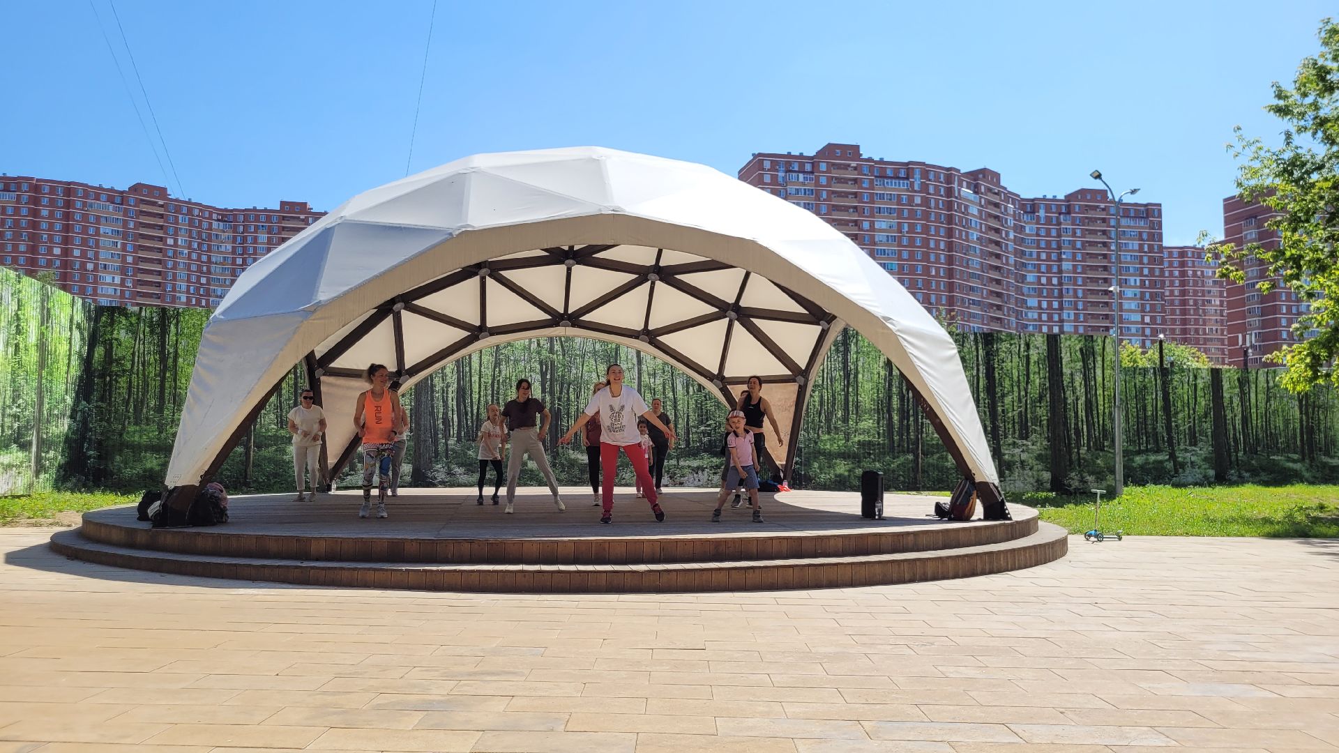 С середины июня несколько раз в неделю главный подиум в парке «Сосенки» в Видном наполняется танцорами. Вот и сегодня активные жительницы ближайших районов вновь собрались на площадке, чтобы зарядиться энергией и получить яркие эмоции на занятиях по зумбе. Инициатором активности стал спортивный клуб «Мегаполис».