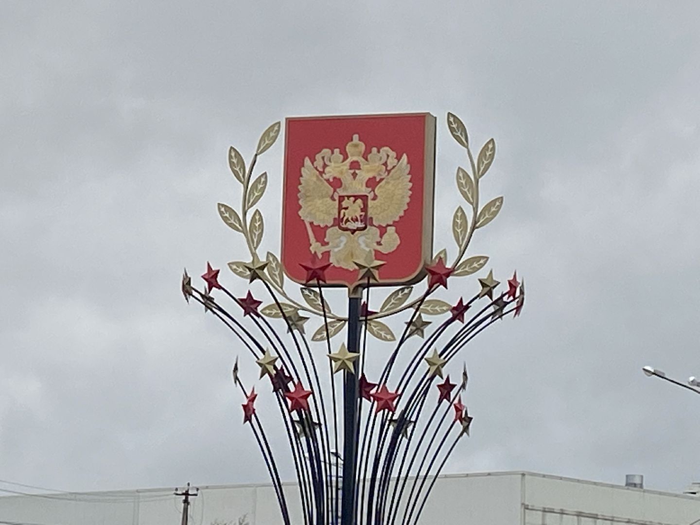 На стеле установлена звезда в кремлевском стиле, вокруг нее расположены более 60 мелких звёзд. Основание конструкции украшено баннером в виде триколора. Особенно красиво стела смотрится в вечернее и ночное время, когда включается неоновая подсветка.