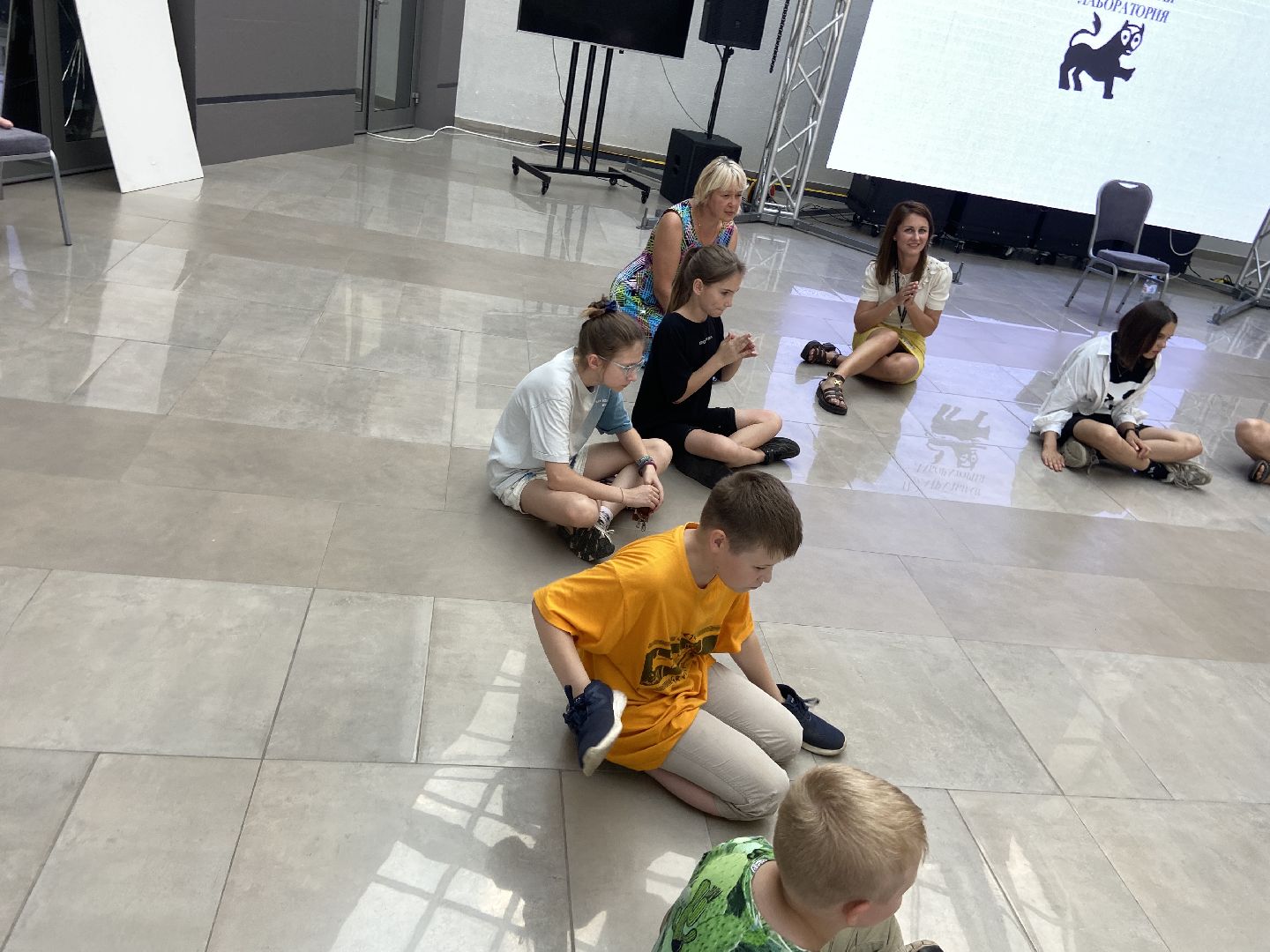 Вместе со студентами Российского института театрального искусства участники игры – а это были как взрослые, так и дети – выполняли различные упражнения, которые используют артисты для концентрации перед выходом на сцену. Несмотря на серьёзность темы, в процессе игры всем было весело. В начале участники зеркально отображали действия ведущего, подпрыгивали, слыша команду «коса» или приседали, услышав «бревно». Далее работали в кругу и по парам, стараясь сконцентрировать внимание не столько на себе, сколько на партнёре, прочесть его намерения.
