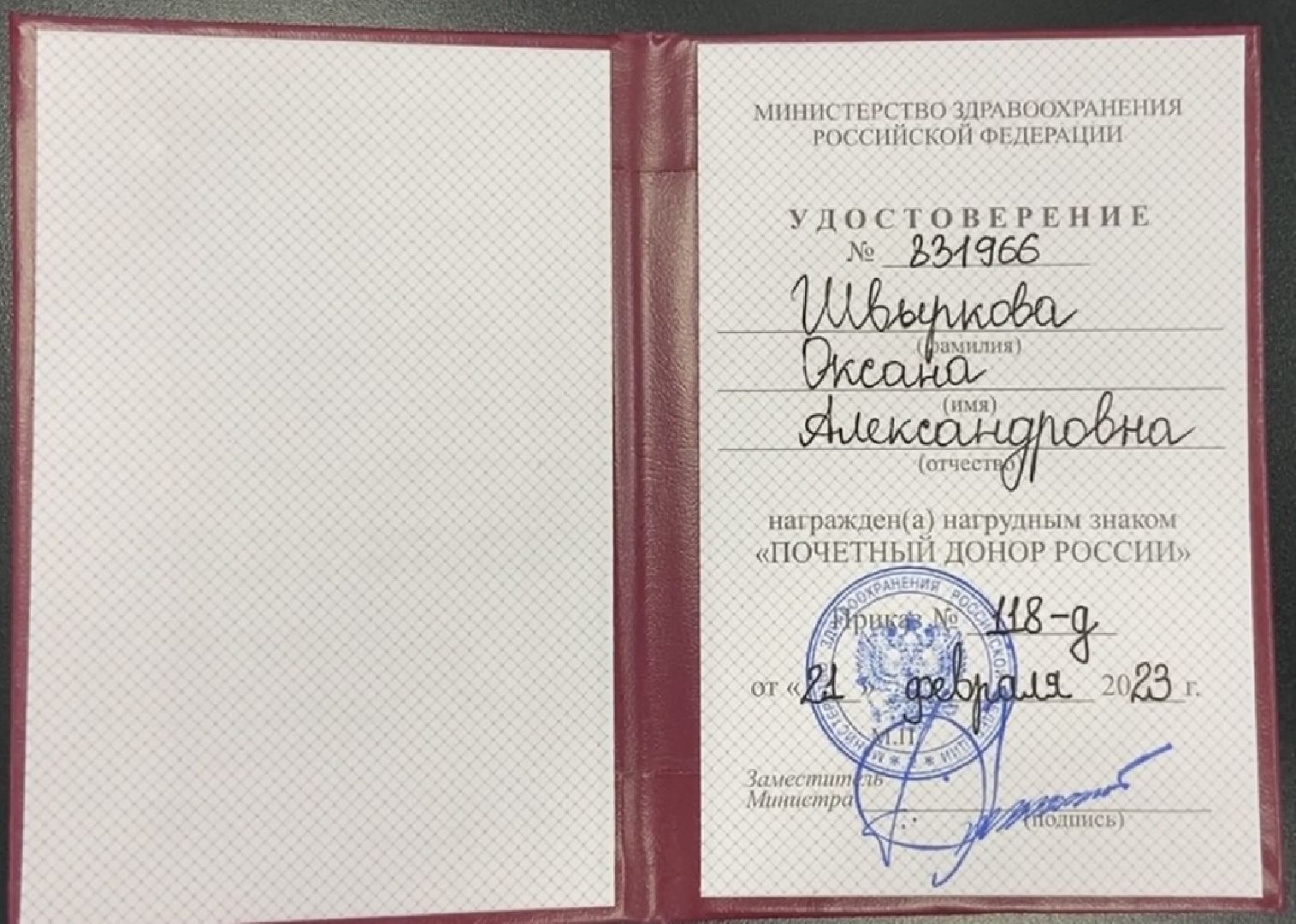 С тех пор прошло более 10 лет. За спиной у Оксаны Швырковой уже 45 донаций, на руках книжка Почётного донора, а сдавать кровь 4 раза в год (чаще нельзя) стало частью её жизни. «Вреда для здоровья я точно не ощутила никакого. У меня достаточно высокий свой гемоглобин, и после кровосдач мне становится даже легче. Более того, если долго кровь не сдаю, организм как будто сам этого требует, настолько это вошло в норму».