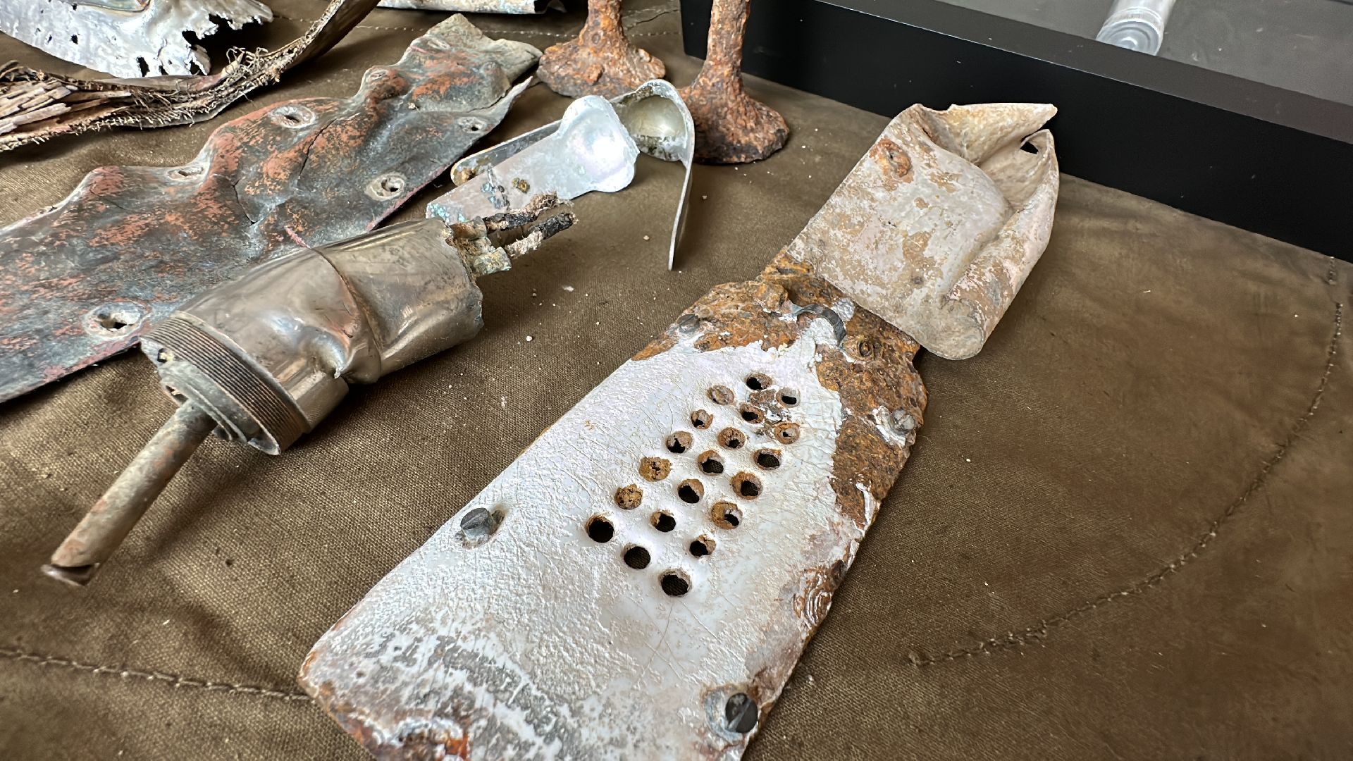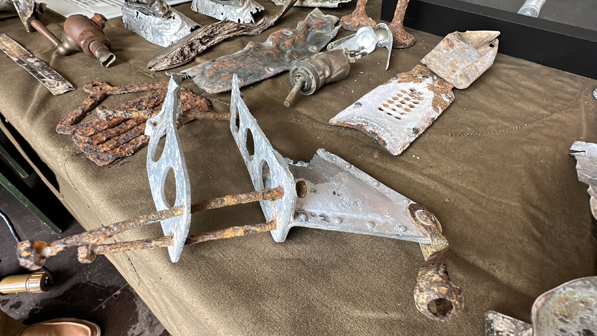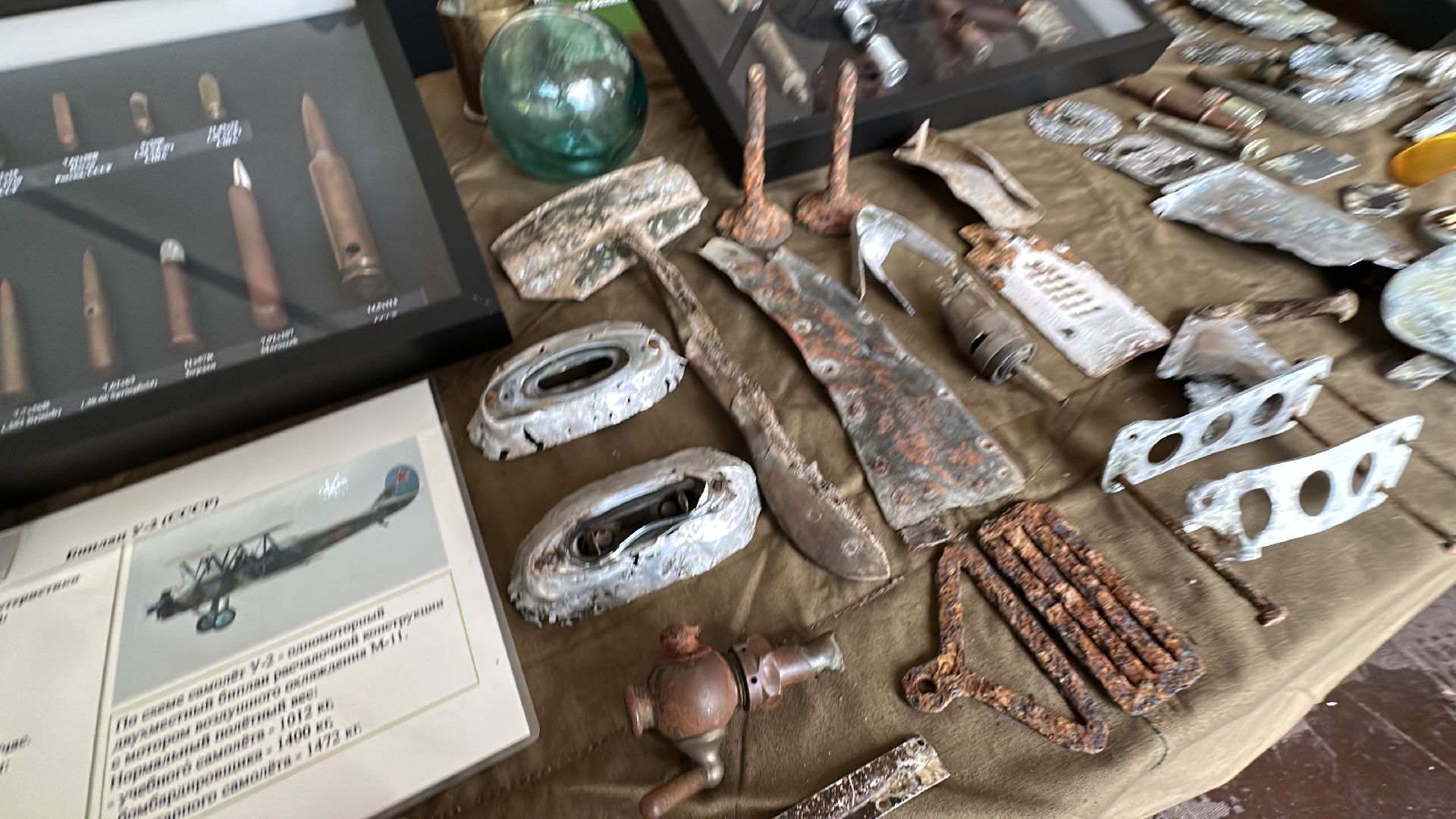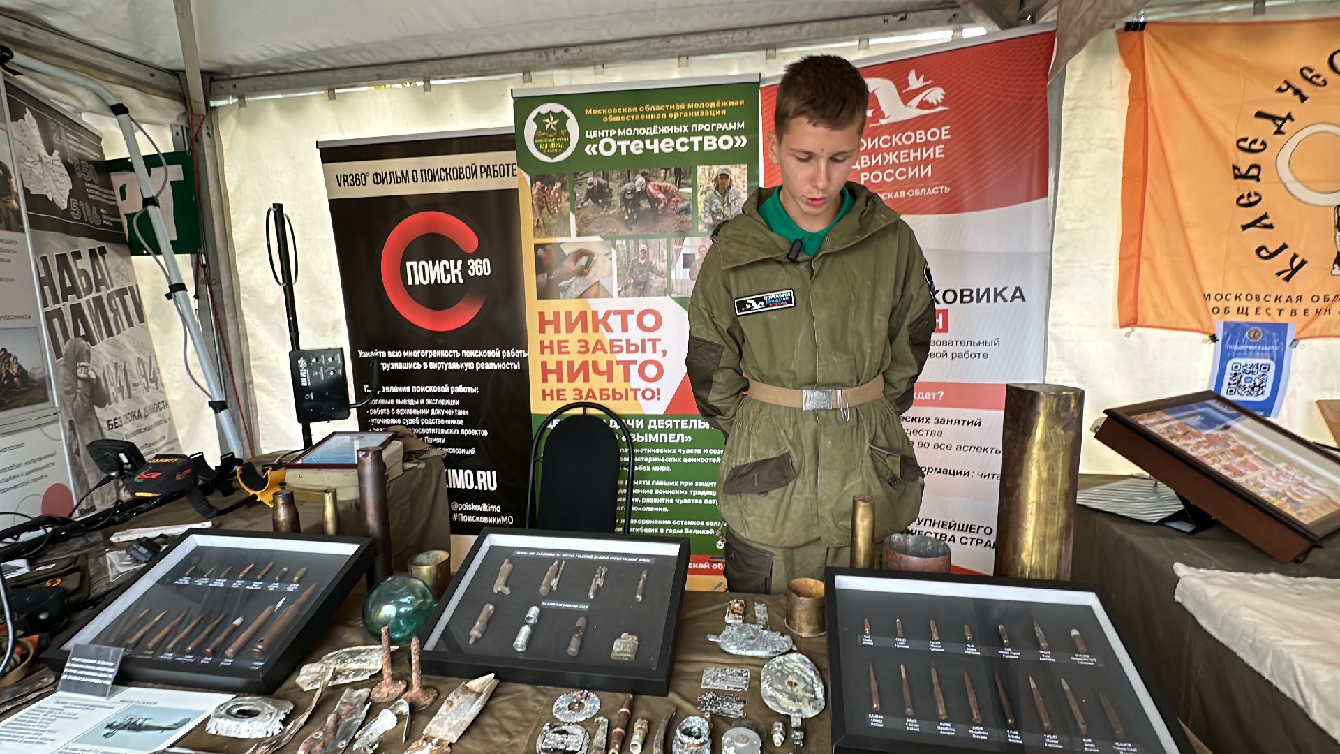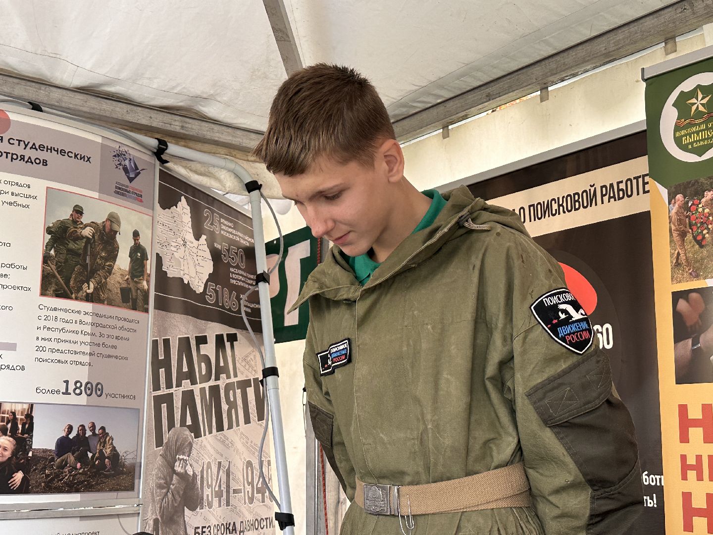 Поисковик Никита Кузьменко в отряд «Вымпел» вступил недавно, всего полгода назад. Сегодня он экскурсовод, рассказывает о каждом предмете, который представлен на стенде, среди находок есть вещи, которые он нашёл в своих первых поисковых экспедициях.