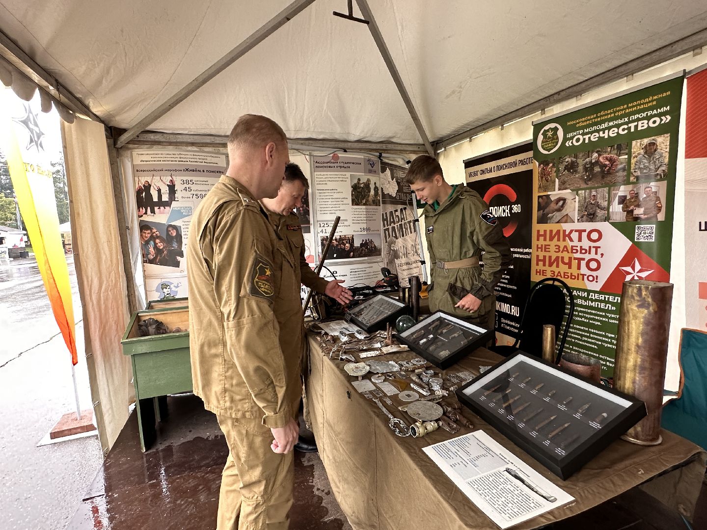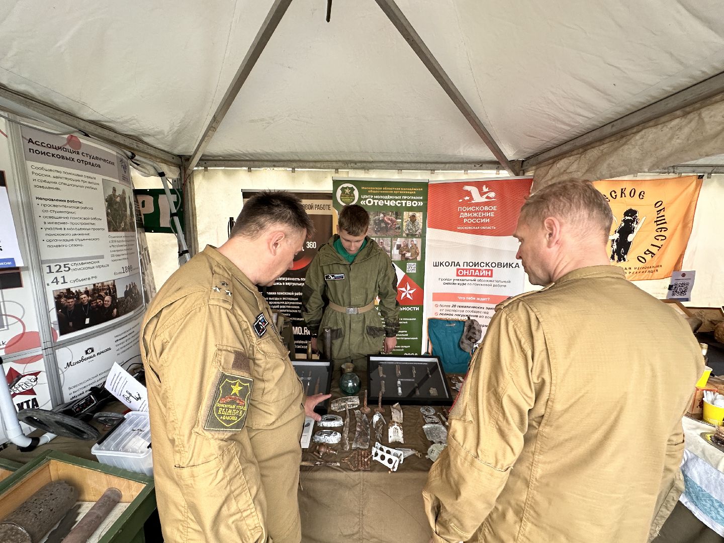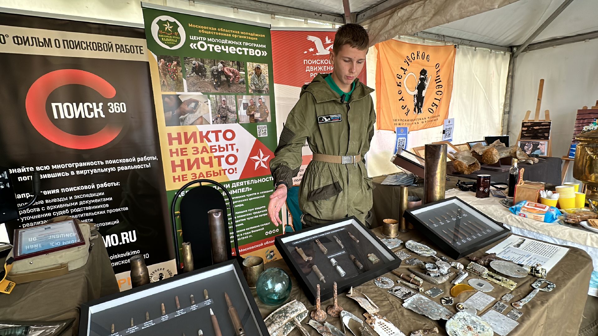 «Мы сегодня представляем стенд поискового отряда «Вымпел». Наш поисковый отряд создан в 1997 году офицерами штаба Ракетных войск стратегического назначения. Нас все эти годы связывала тесная дружба с поисковиками города Одинцово. Традиционно в день рождения мы приезжаем сюда, в центр города и проводим интерактивную выставку. Все экспонаты, которые представлены здесь — найдены нашими поисковиками во время совместных поисковых экспедиций. Здесь мы представляем сконцентрированный результат нашей работы за несколько лет. Посетители могут познакомится с деятельностью нашего отряда, с нашими знаковыми находками», — рассказал Сергей Саранцев, заместитель командира поискового отряда «Вымпел» (город Власиха).