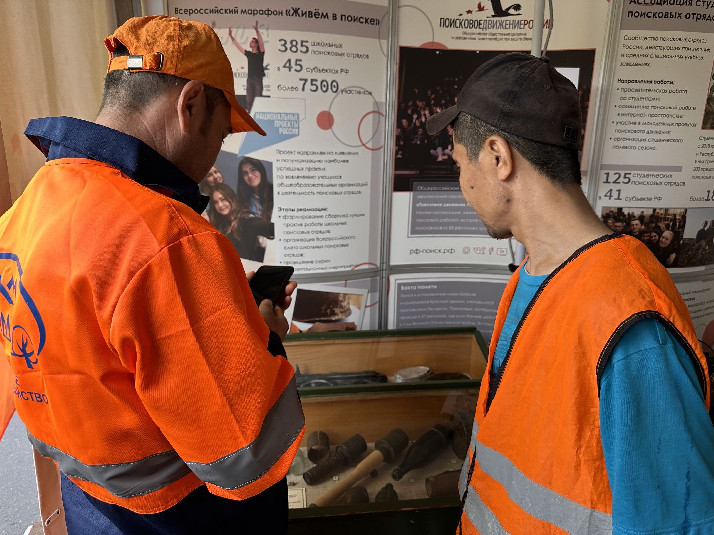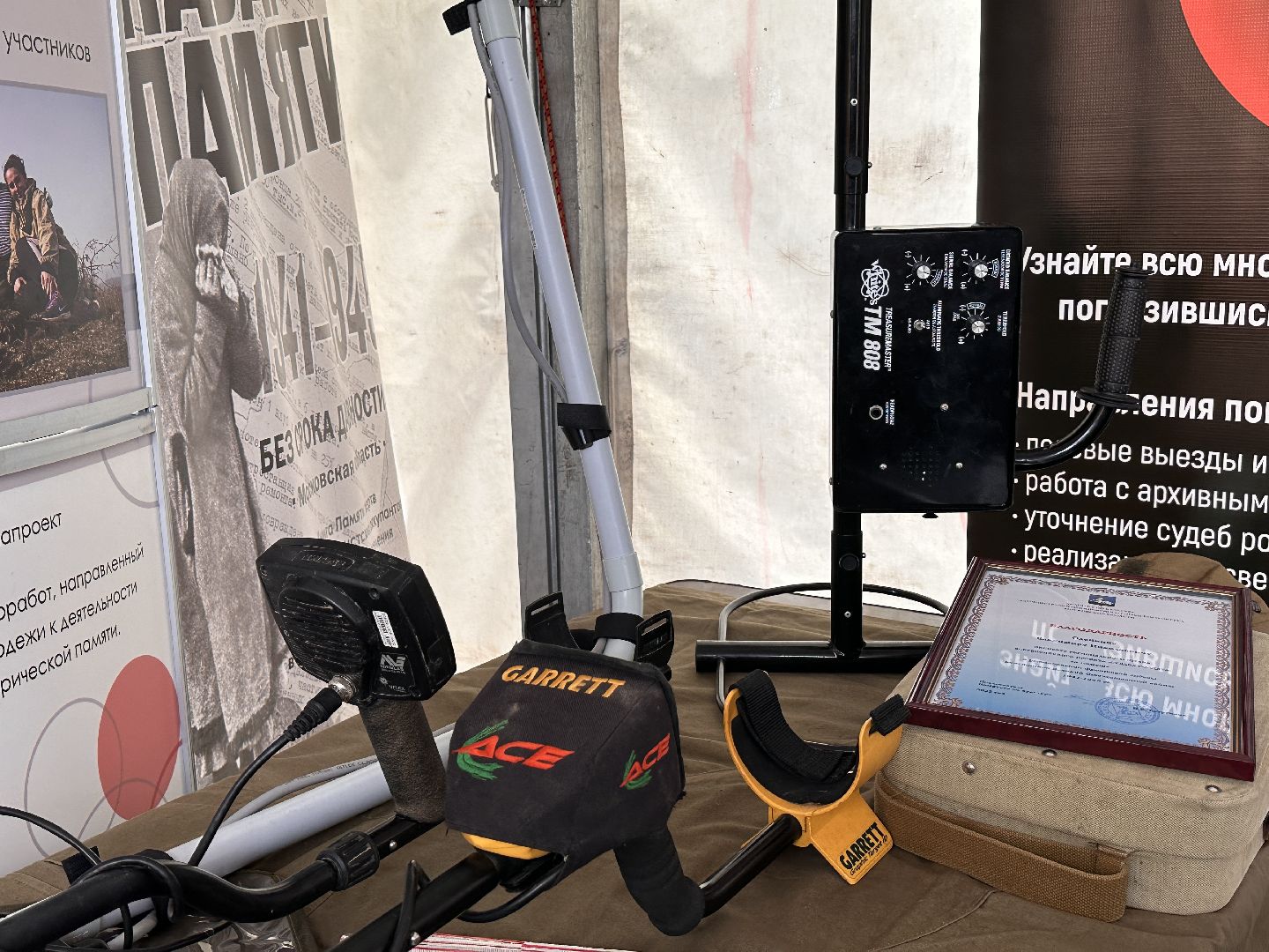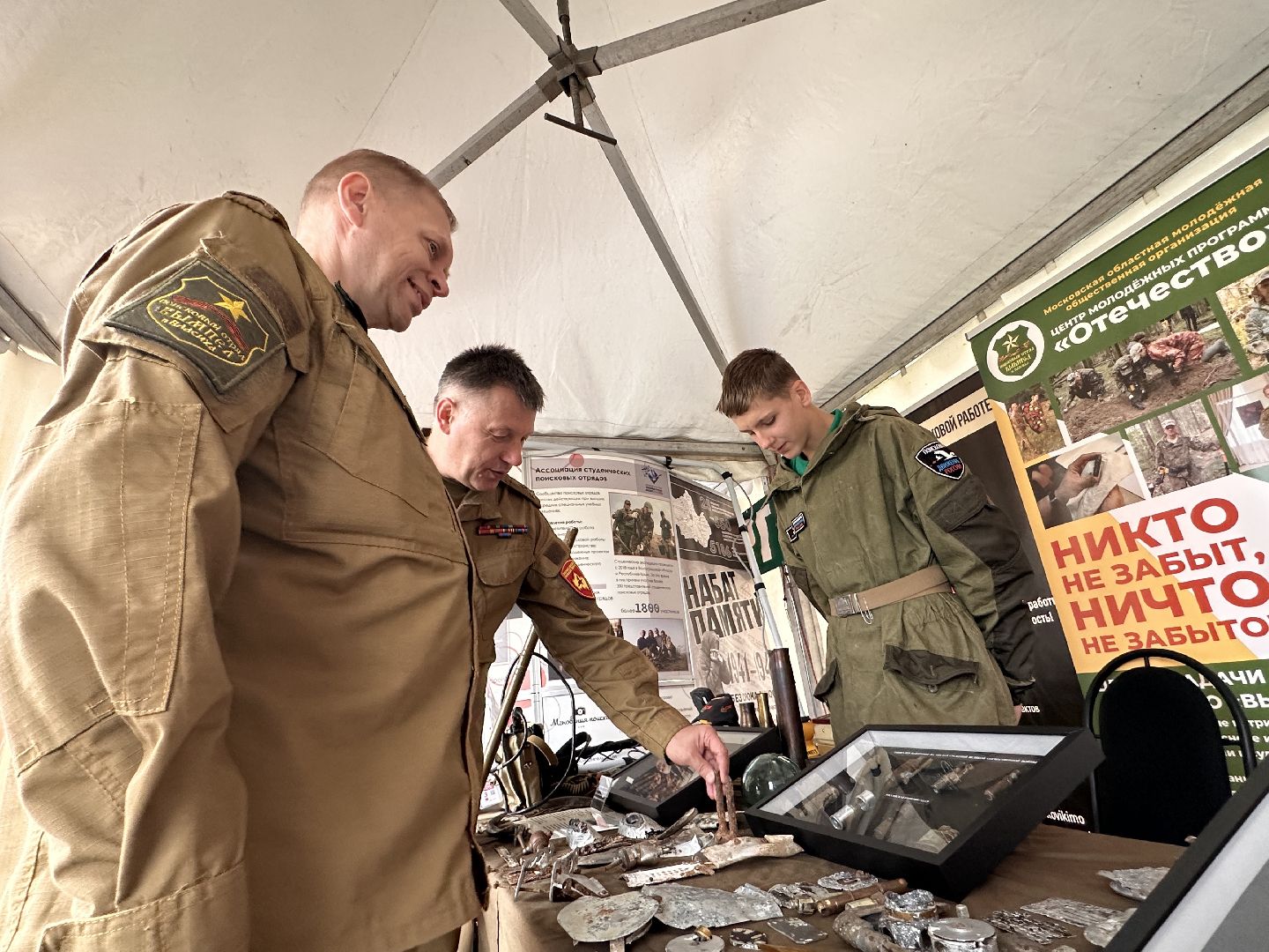 «Мы сегодня представляем стенд поискового отряда «Вымпел». Наш поисковый отряд создан в 1997 году офицерами штаба Ракетных войск стратегического назначения. Нас все эти годы связывала тесная дружба с поисковиками города Одинцово. Традиционно в день рождения мы приезжаем сюда, в центр города и проводим интерактивную выставку. Все экспонаты, которые представлены здесь — найдены нашими поисковиками во время совместных поисковых экспедиций. Здесь мы представляем сконцентрированный результат нашей работы за несколько лет. Посетители могут познакомится с деятельностью нашего отряда, с нашими знаковыми находками», — рассказал Сергей Саранцев, заместитель командира поискового отряда «Вымпел» (город Власиха).