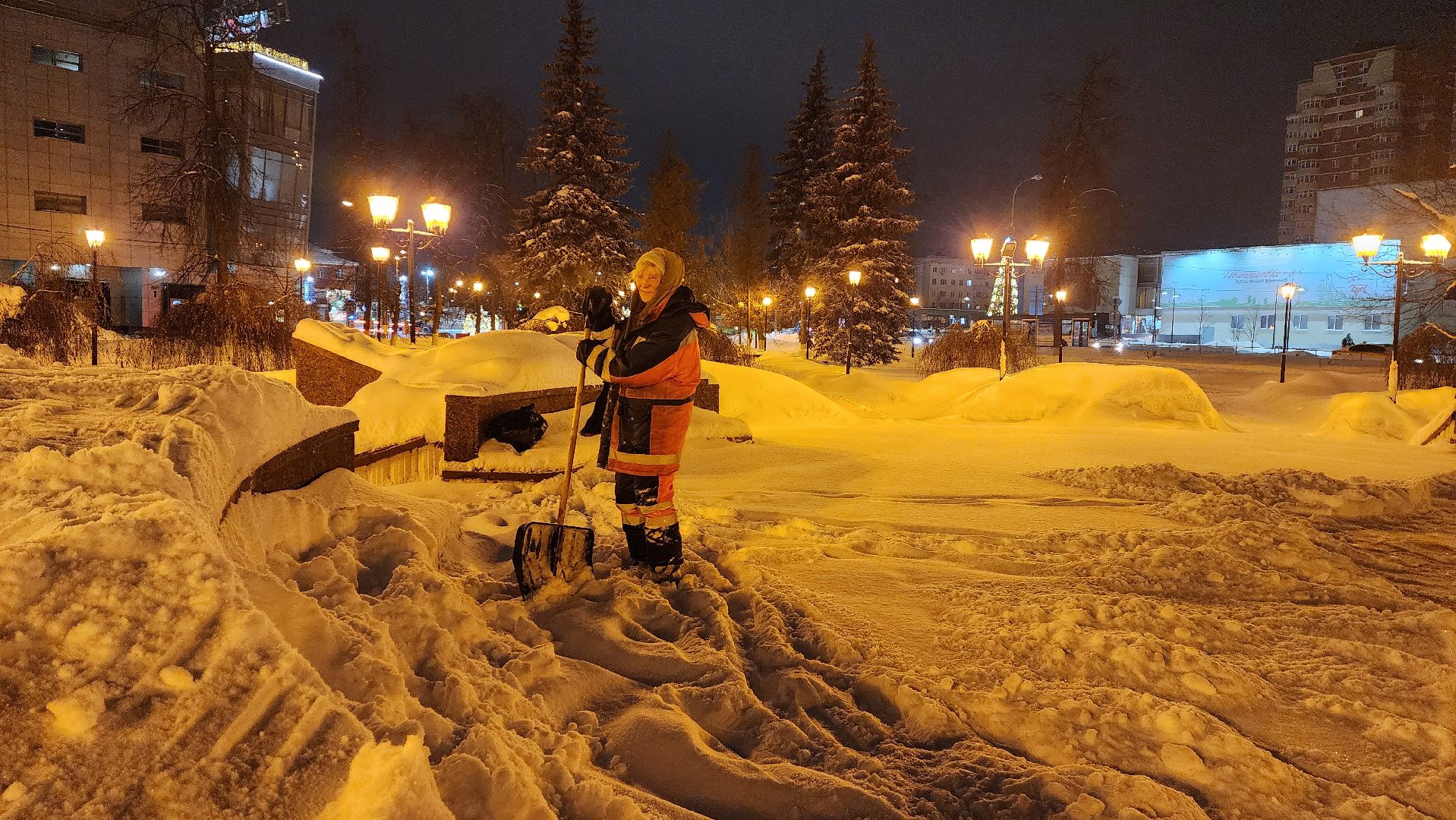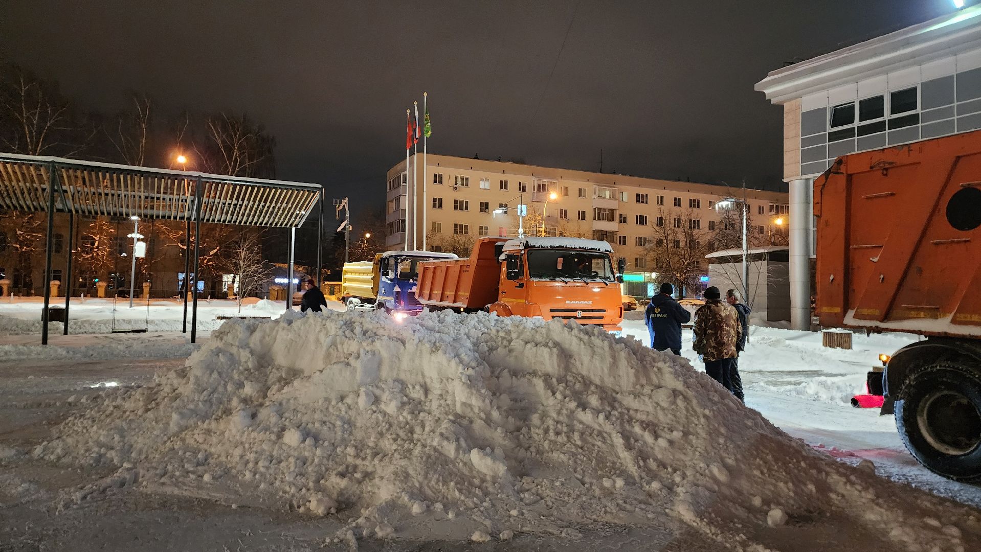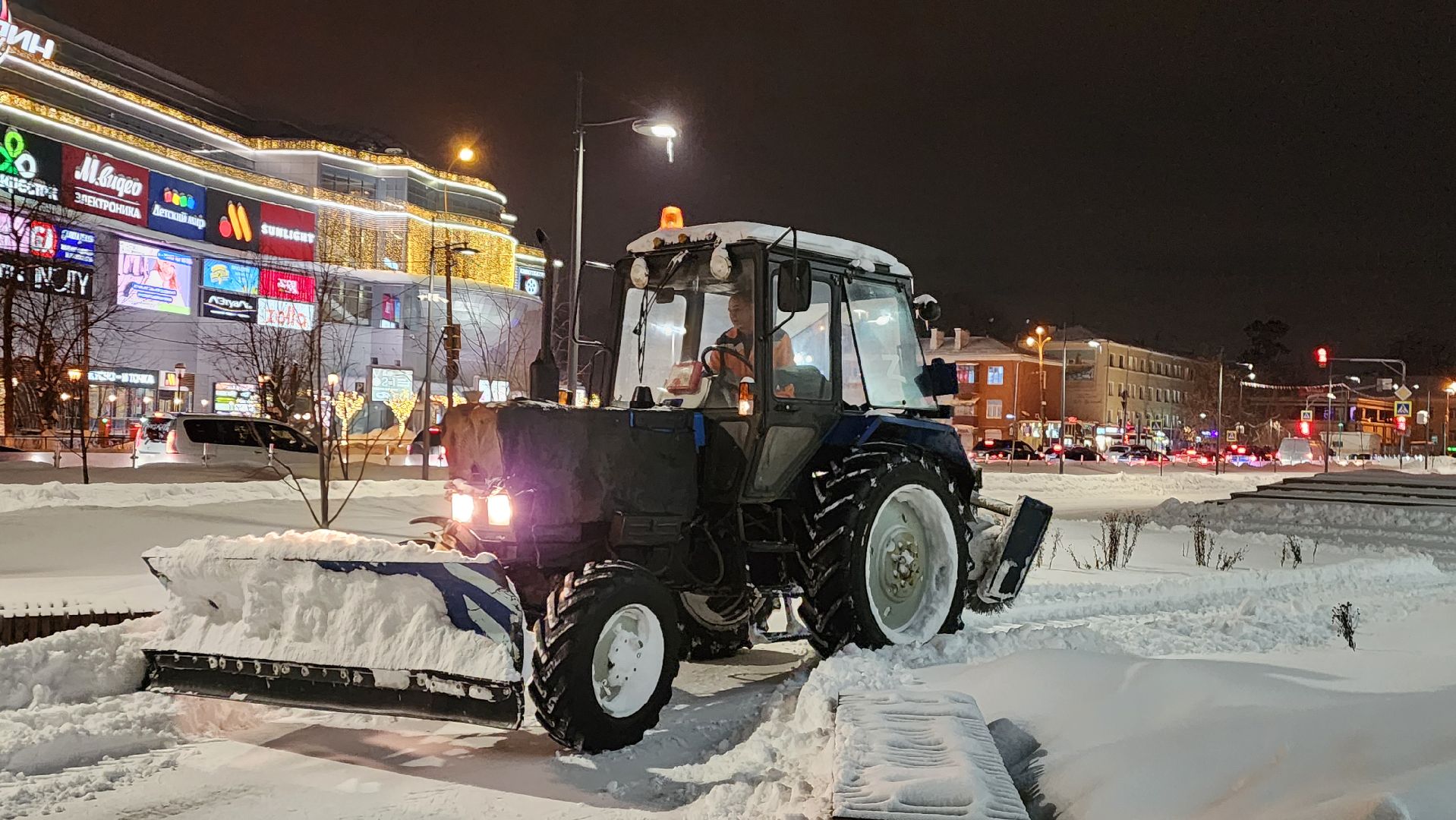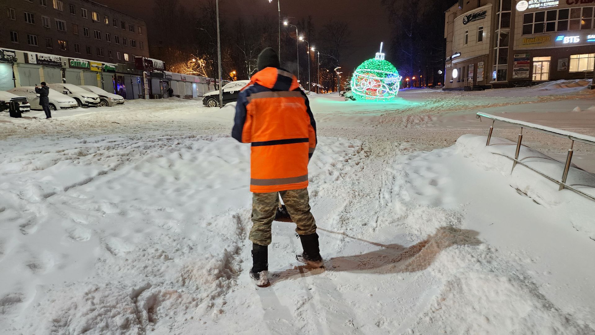 В центре города работало 7 единиц техники и 10 рабочих с лопатами. С 7 утра приступили к вывозу снега. По самым скромным подсчётам отсюда придётся убрать 200 кубометров снега — 10 машин, которые вывозят по 20 кубометров за один рейс.