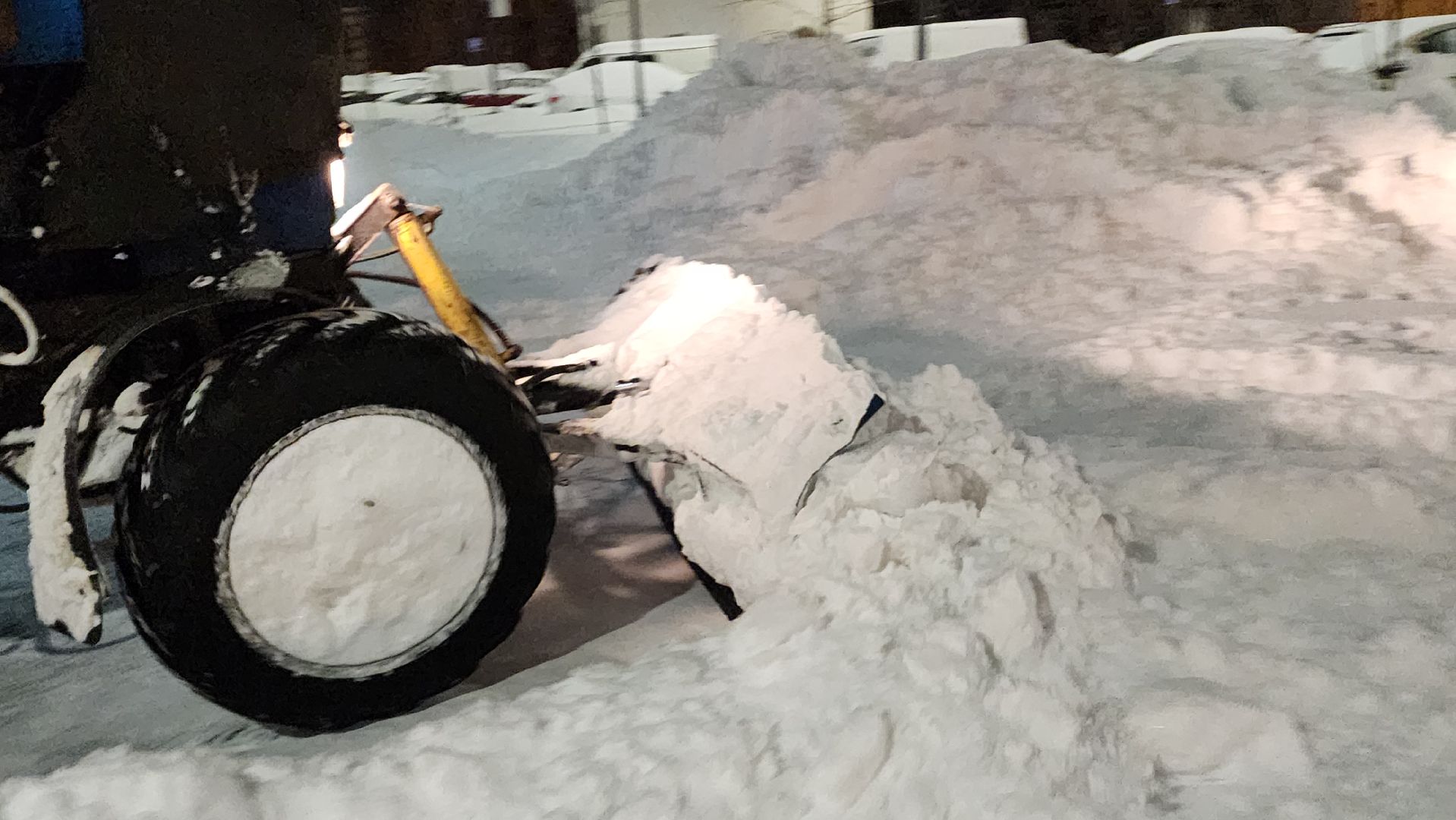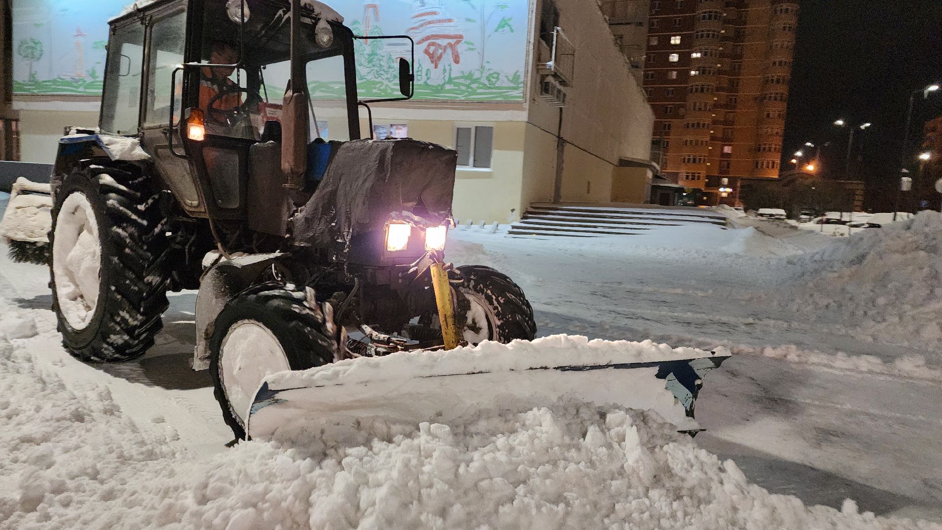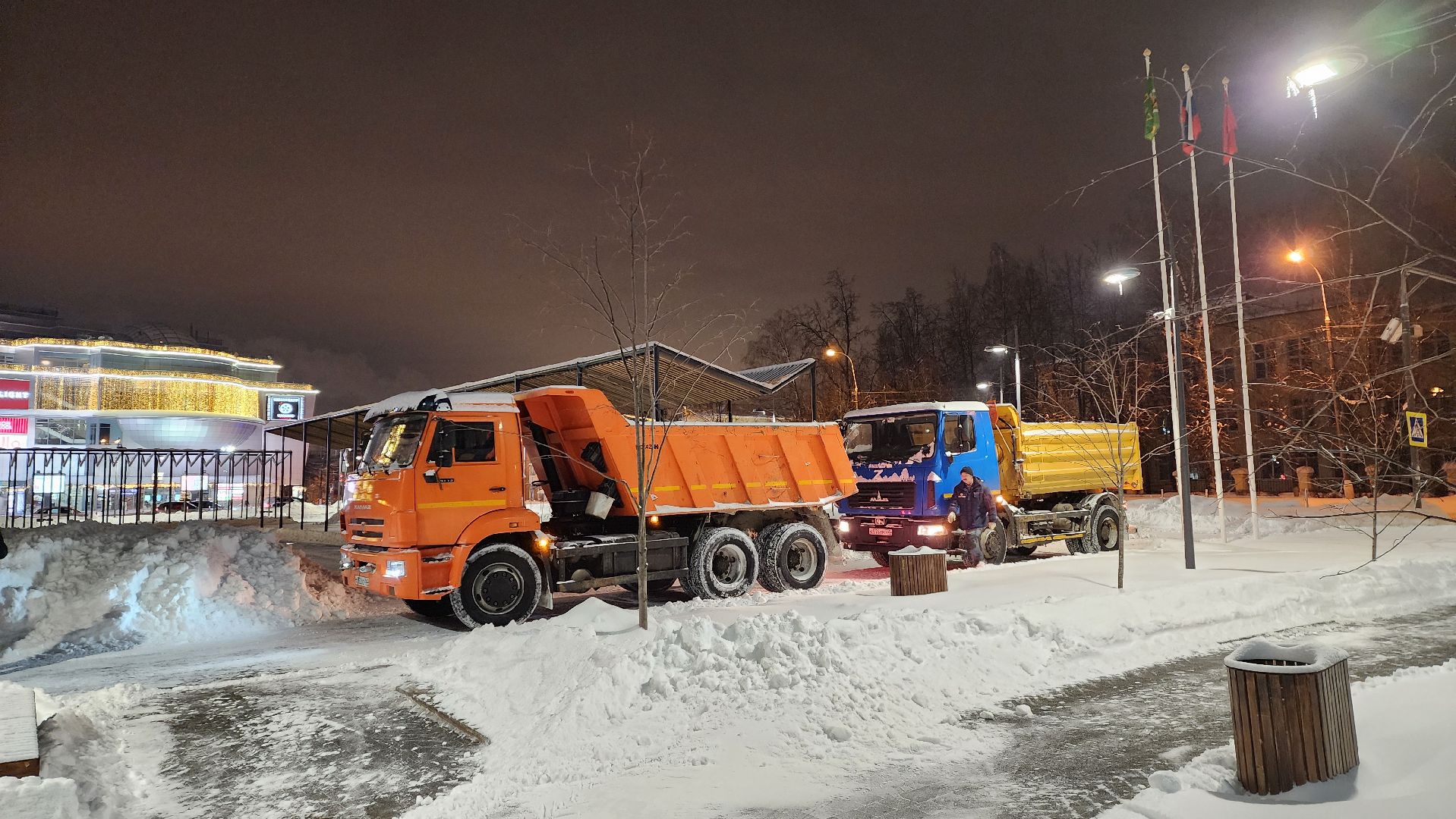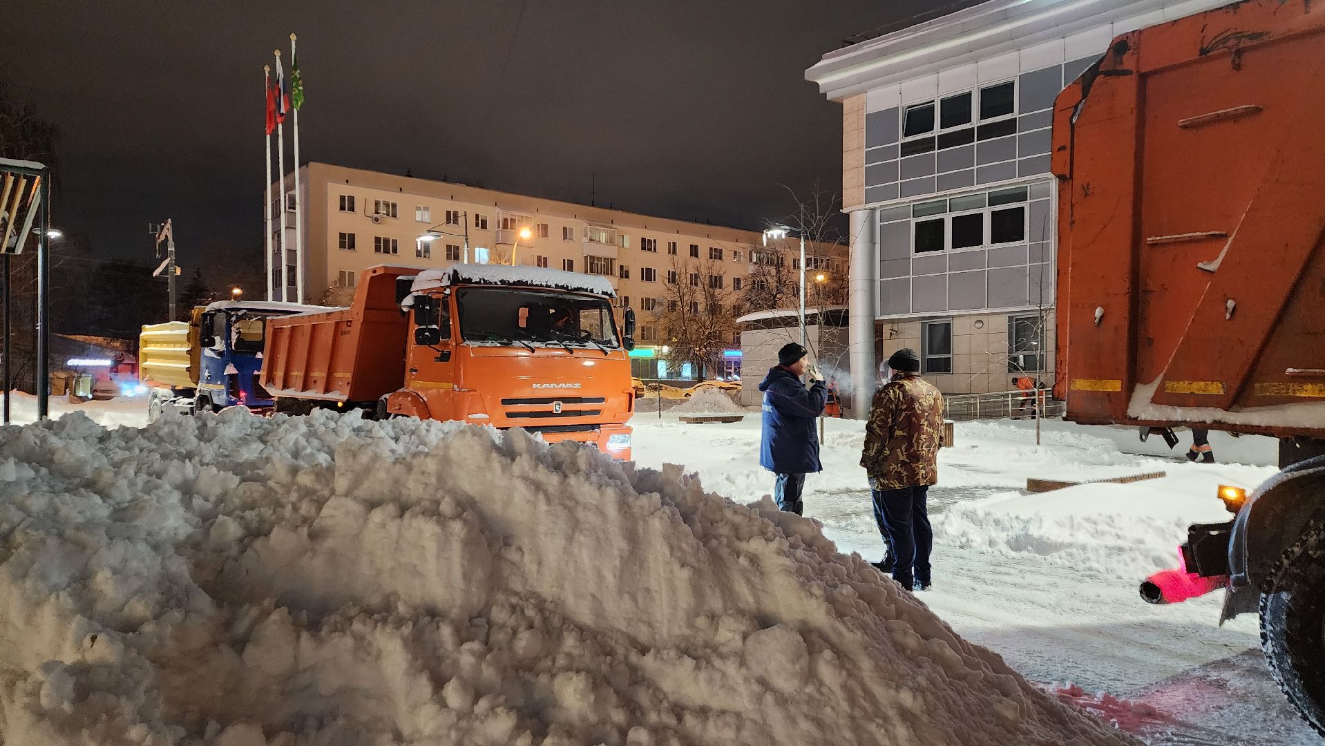 В центре города работало 7 единиц техники и 10 рабочих с лопатами. С 7 утра приступили к вывозу снега. По самым скромным подсчётам отсюда придётся убрать 200 кубометров снега — 10 машин, которые вывозят по 20 кубометров за один рейс.