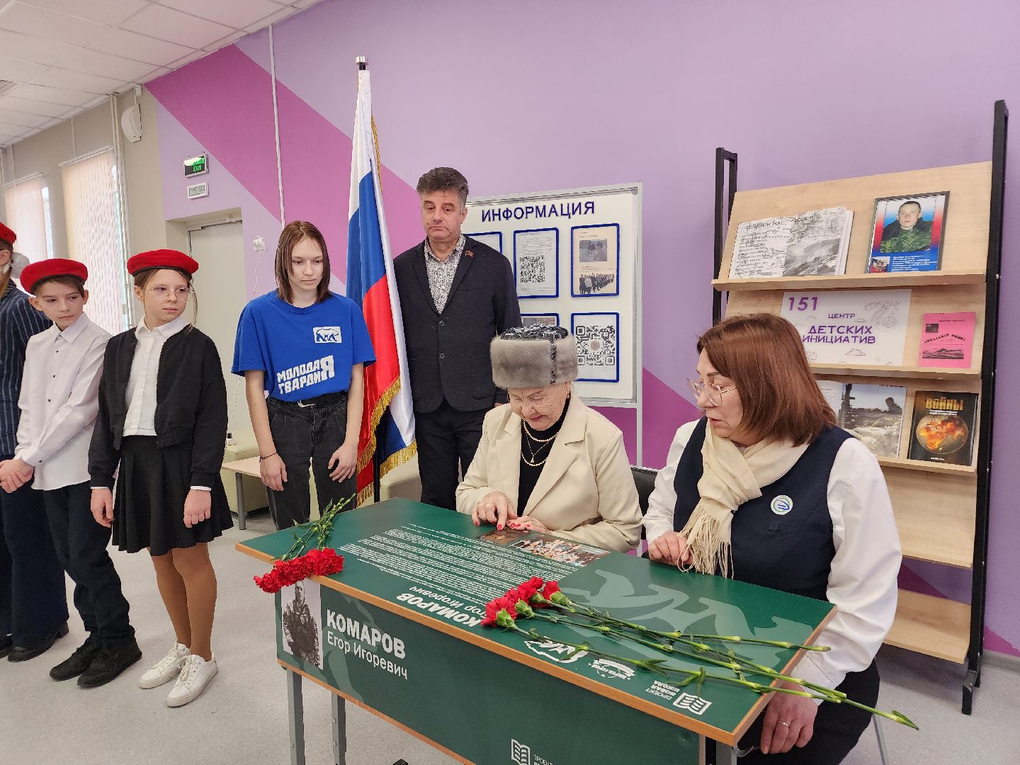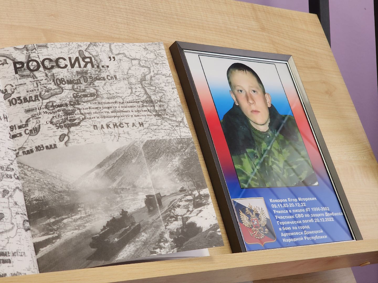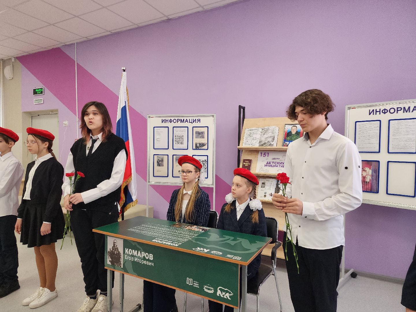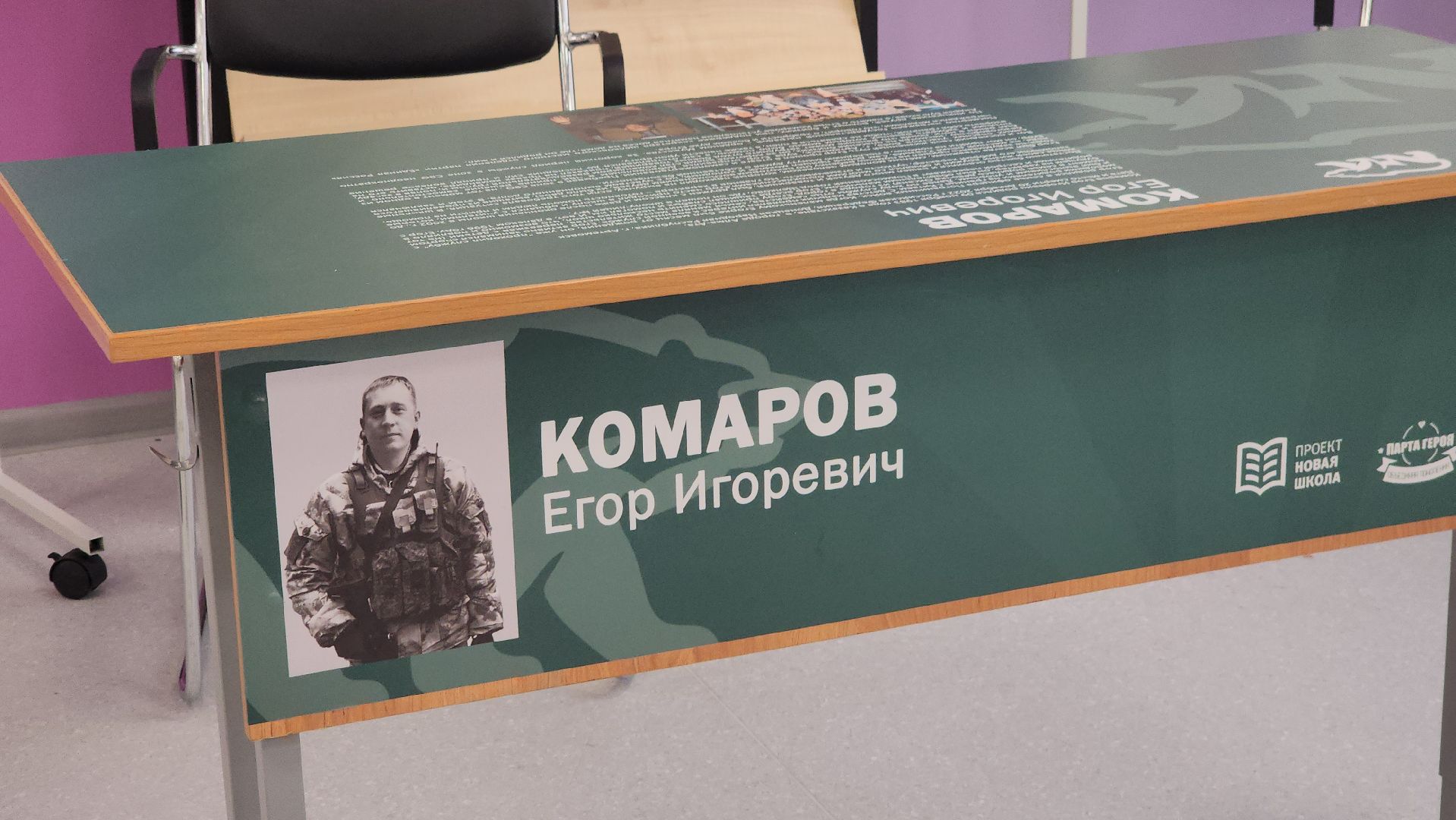 Акция по установке таких ученических парт проходит в рамках проекта «Историческая память». На парте – фотографии героя, а также история подвига Егора Комарова. Командир разведывательного отделения героически погиб в бою за Артёмовск в декабре 2022 года. Он прикрывал своих боевых товарищей от атаки противника. Указом Президента РФ Егор посмертно награждён орденом Мужества. В память о герое установлена доска на доме, где он жил.
