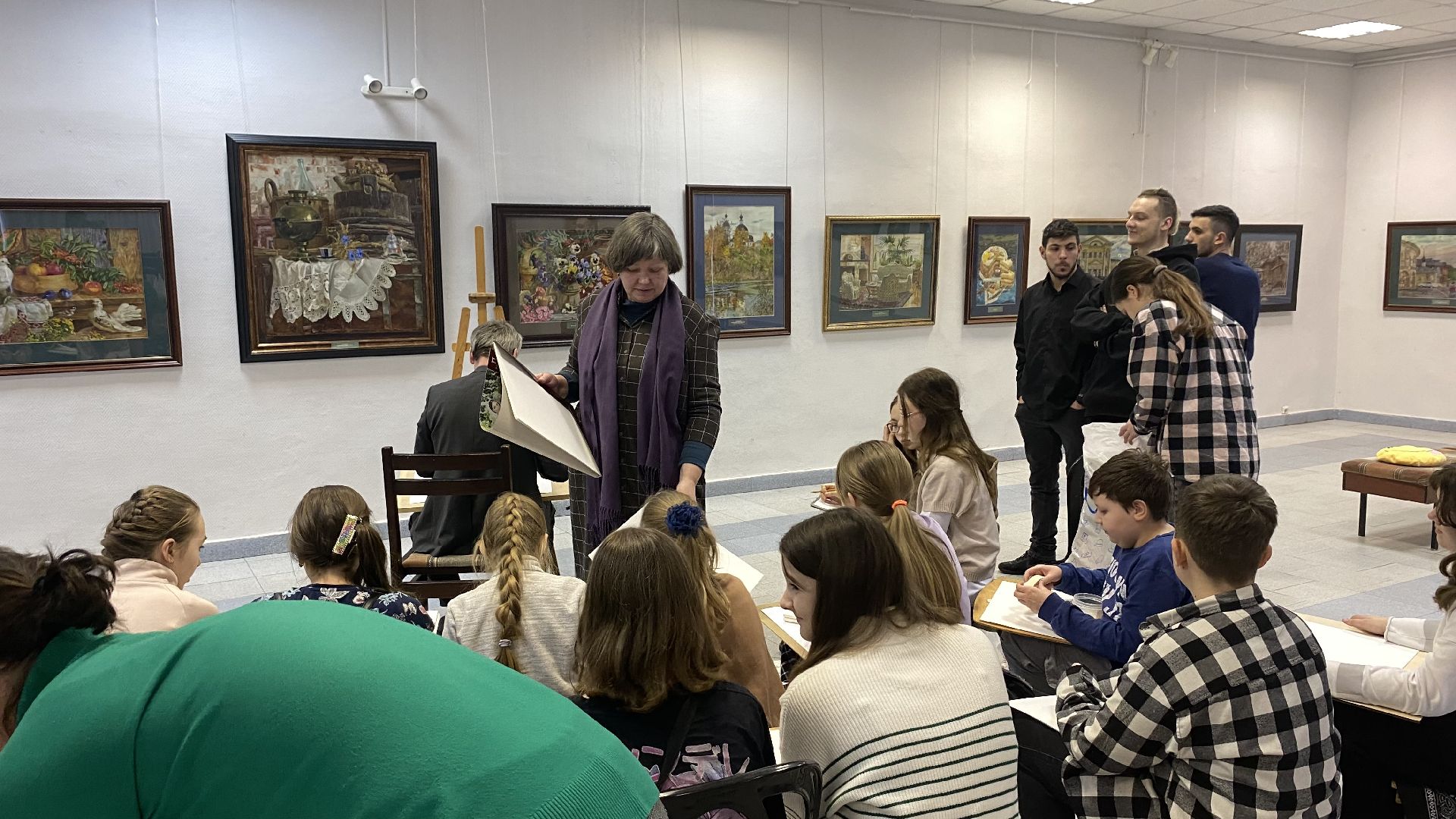 После открытия выставки Александр провёл мастер-класс для всех желающих. Вместе с художником участники занятия на листе бумаги акварелью рисовали храм на Невском проспекте, прислушиваясь к советам маэстро.