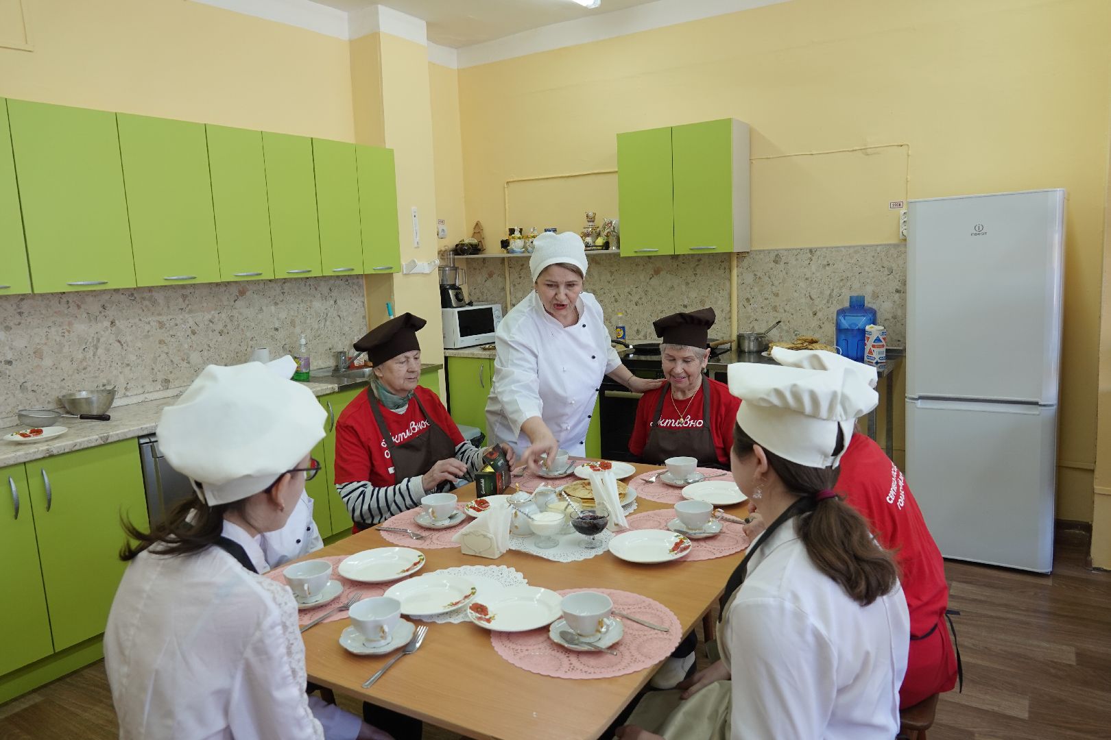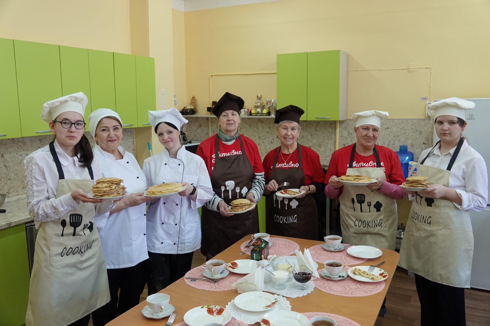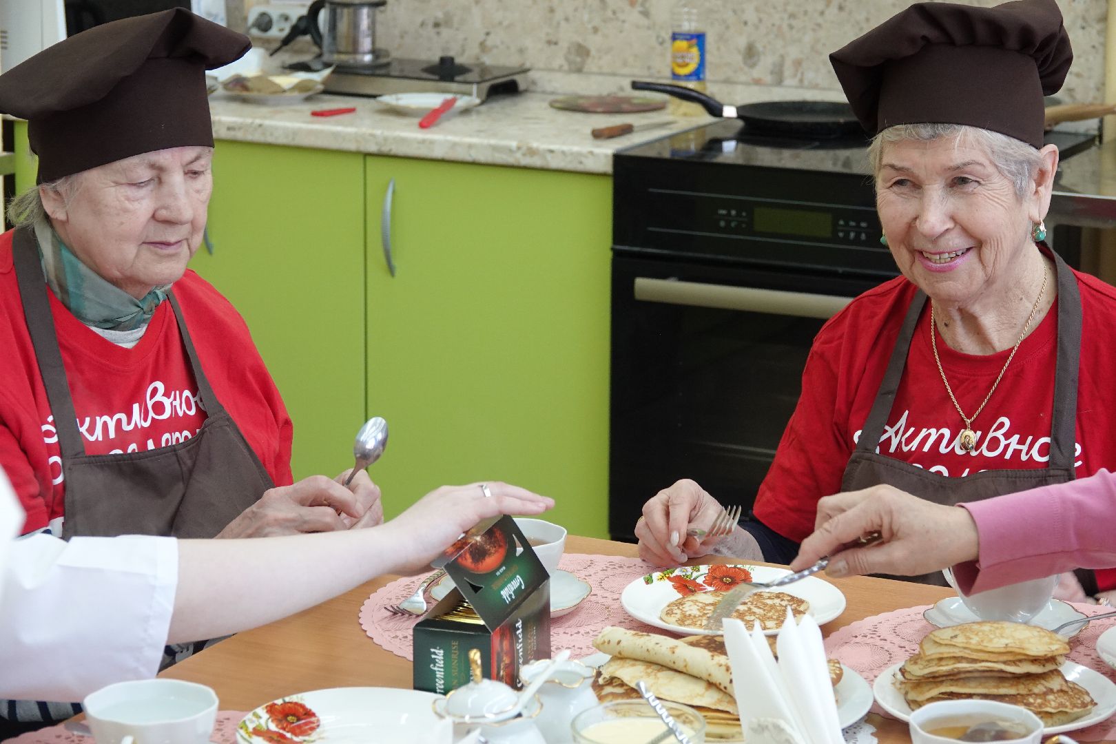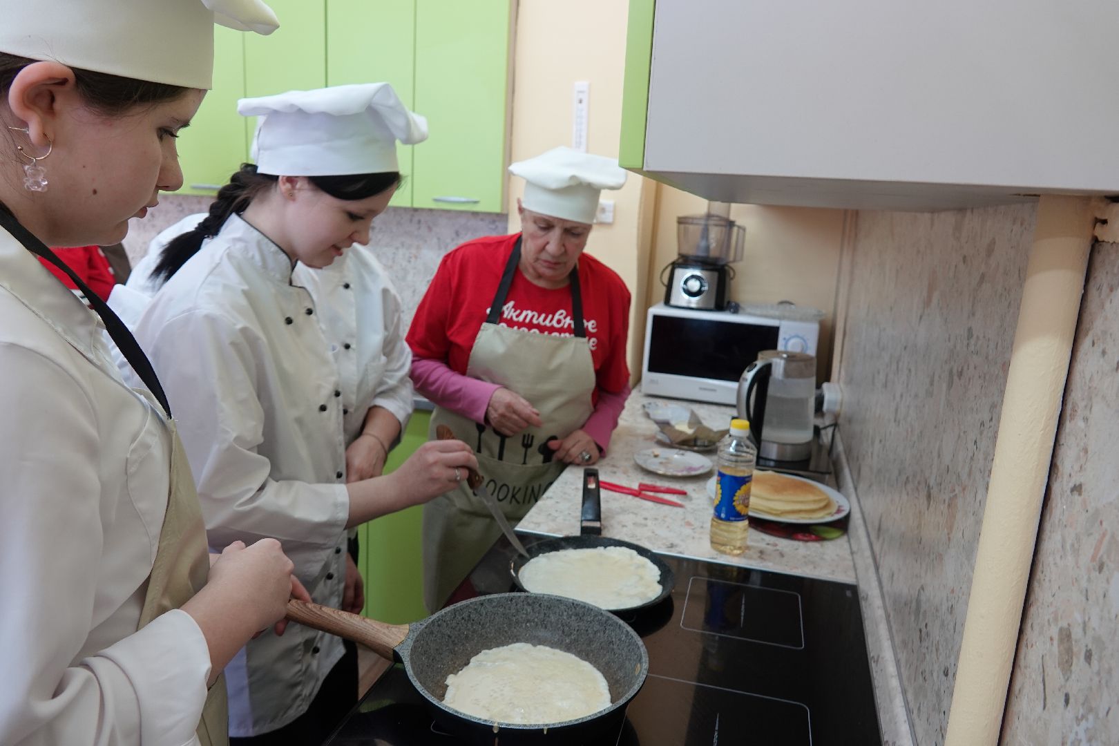 В четыре руки ученицы школы вместе с долголетами напекли целую гору блинов. Для девочек это привычное дело. Готовить учат на уроках труда.