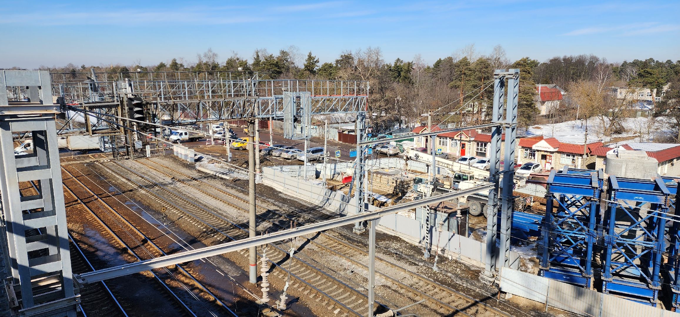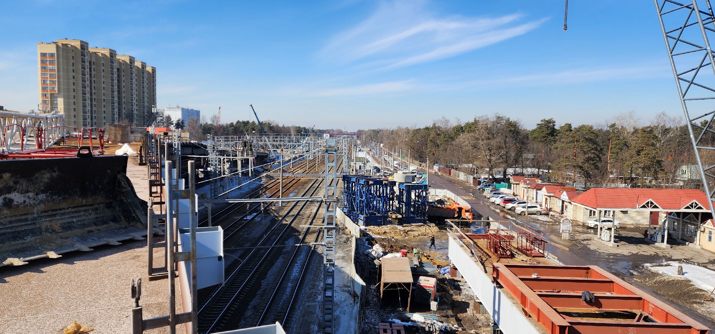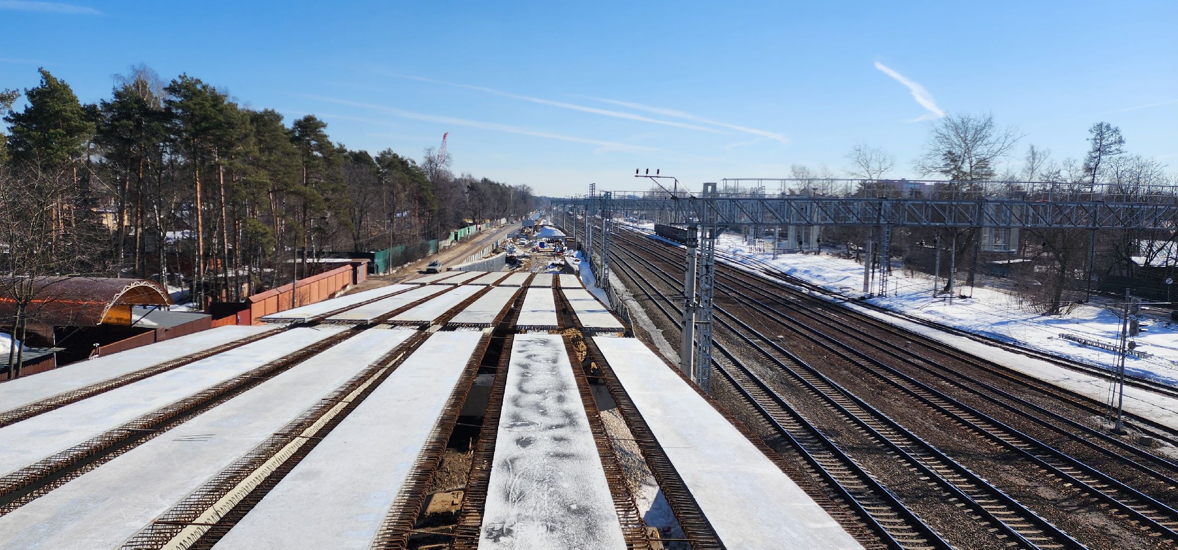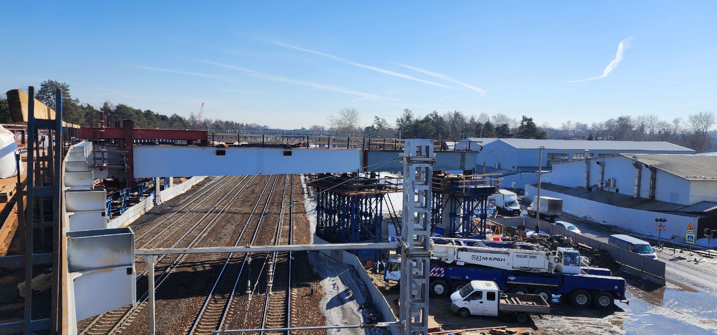 На площадке строительства путепровода «Быково» в Раменском округе установили боковую секцию ригеля шестой опоры над железной дорогой