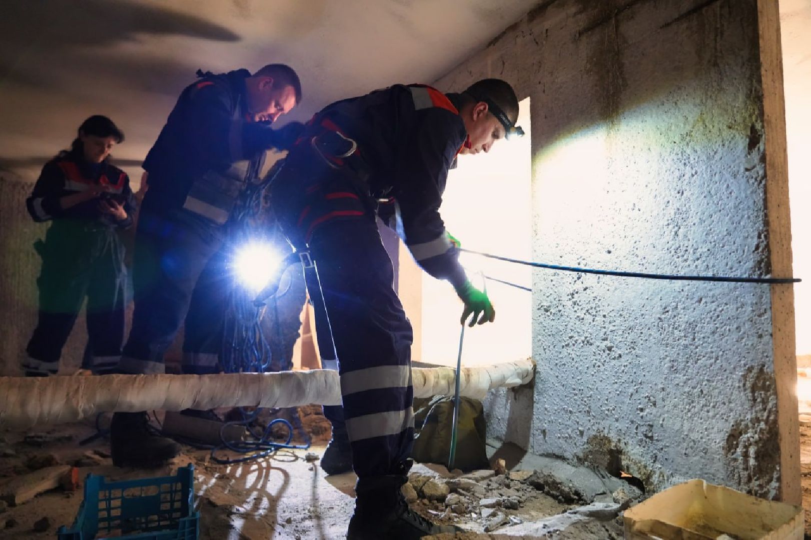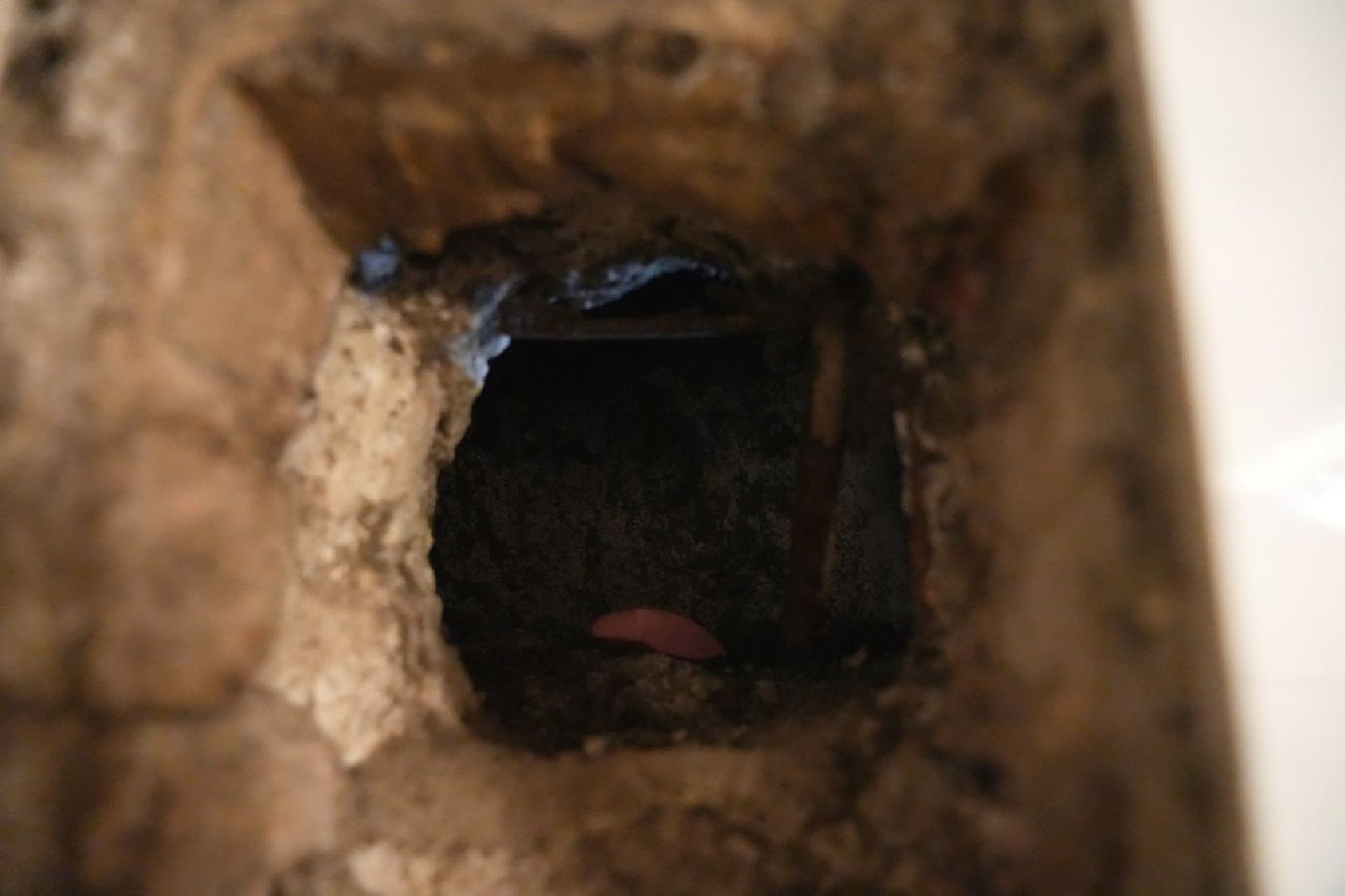 С разрешения владельцев квартиры спасатели проделали отверстие в стене ванной комнаты, чтобы освободить путь на волю попавшей в бетонный плен кошке. Но от пугающих звуков перфоратора животное залезло по вентиляционной шахте выше – на уровень второго этажа.