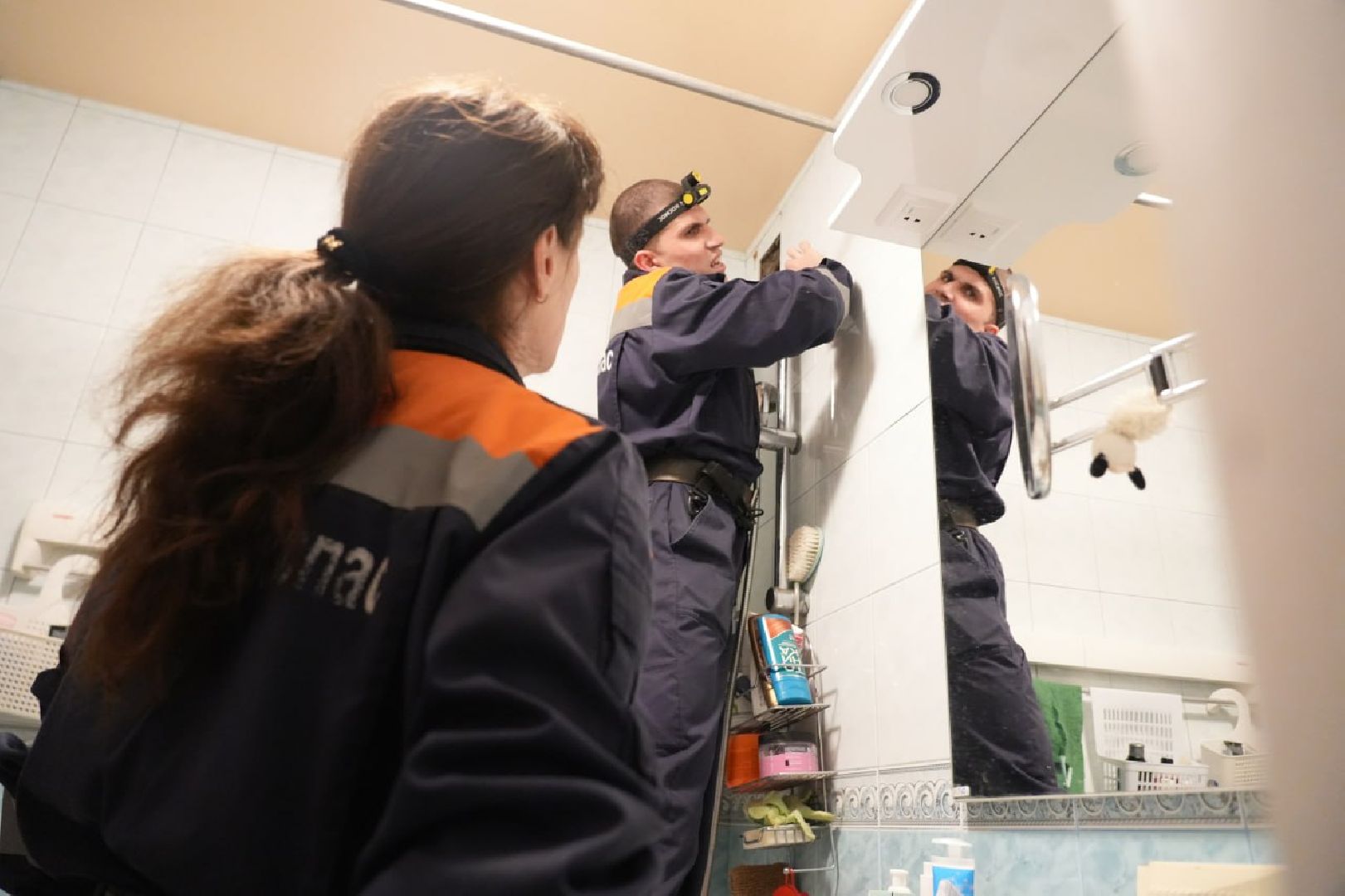«Когда мы вновь услышали мяуканье сегодня днём, поняли, что это не щенок и надо бить тревогу. Начали думать, как спасти мяукающего заточенца. Сначала вскрыли свою вентиляцию, но ничего не обнаружили. Пошли по соседям, которые также не смогли ничего увидеть. Начали более детально искать источник мяуканья», — рассказала Жанна Александрова, хозяйка квартиры.