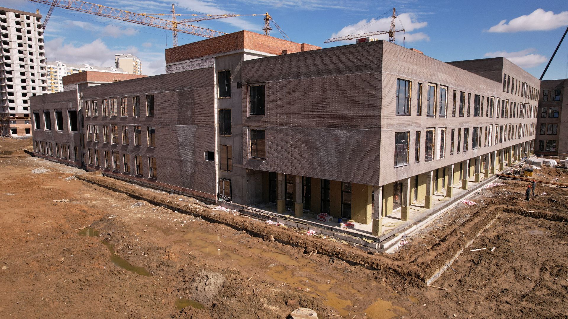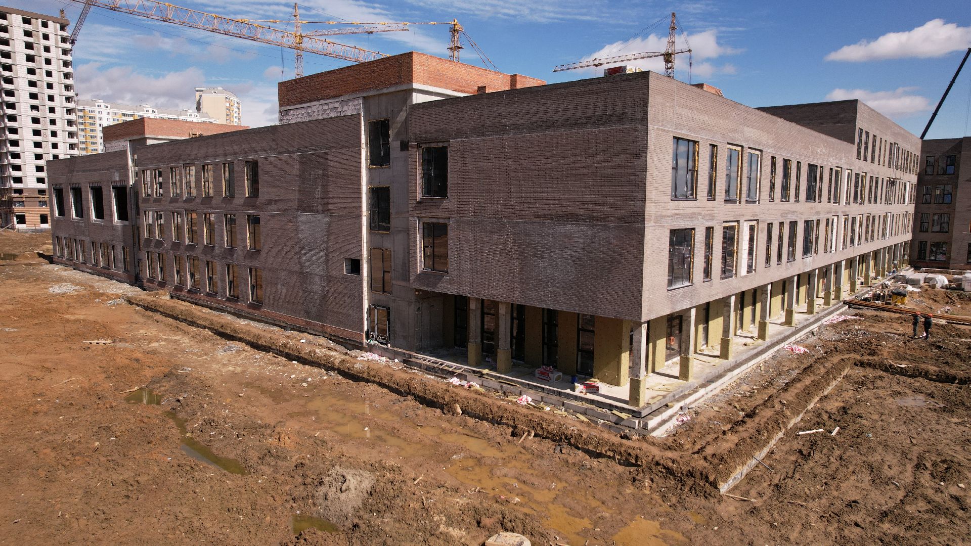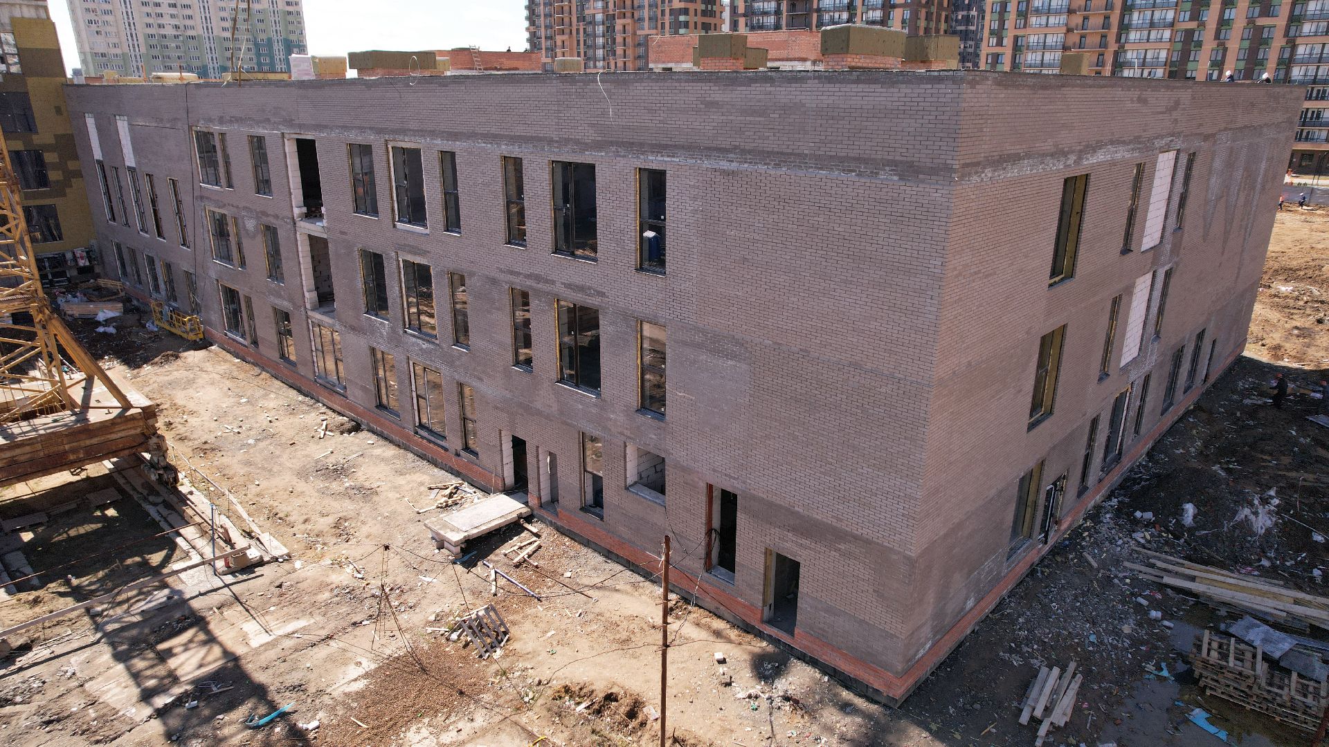 Здание школы построено, в нём установлены окна и перегородки, идут штукатурные работы