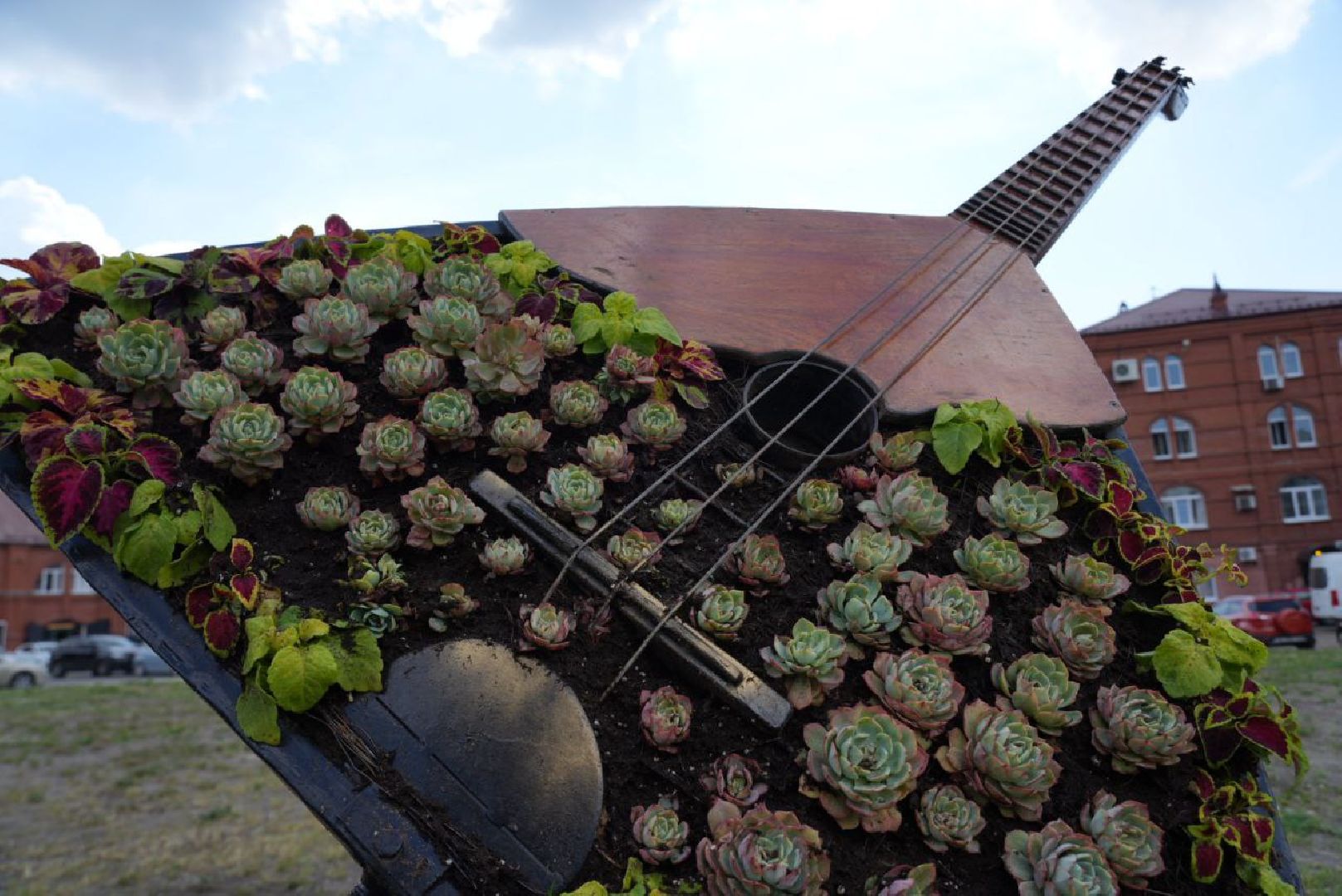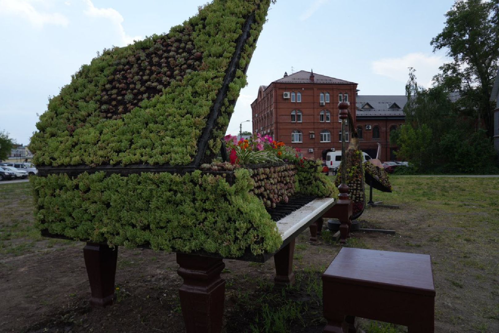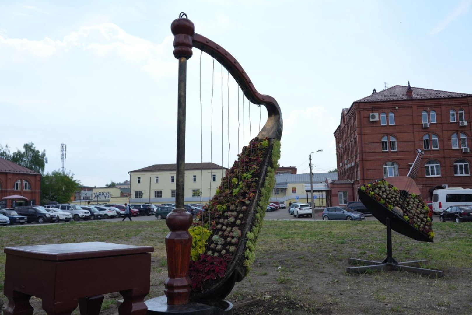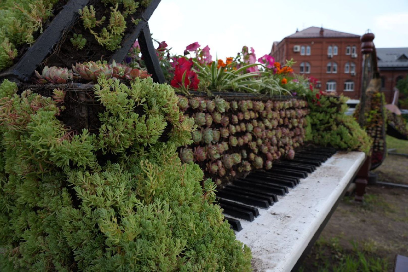 Территорию, где раньше стояло недостроенное здание фондохранилища, теперь украсили цветущие арт-объекты. Пианино, балалайка и арфа с высаженными на них цветами не только привлекают внимание прогуливающихся жителей и туристов, но и красиво дополняют местный ландшафт.