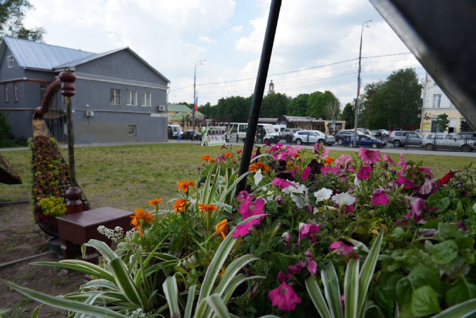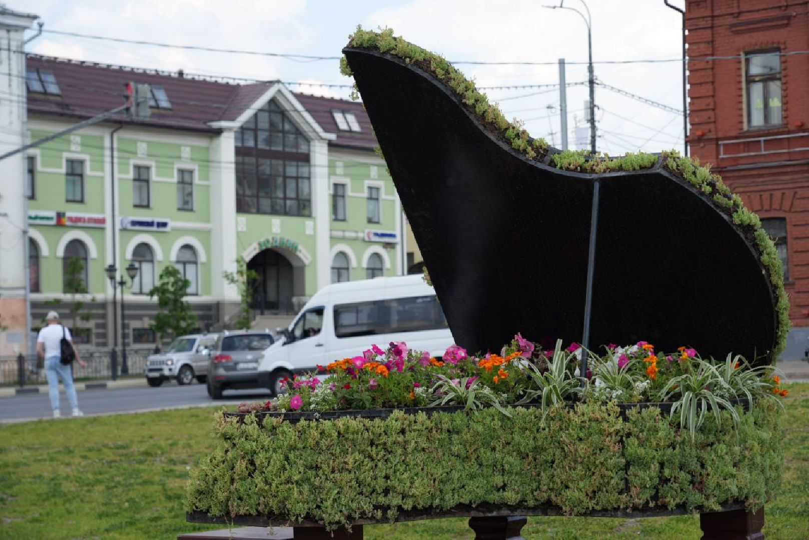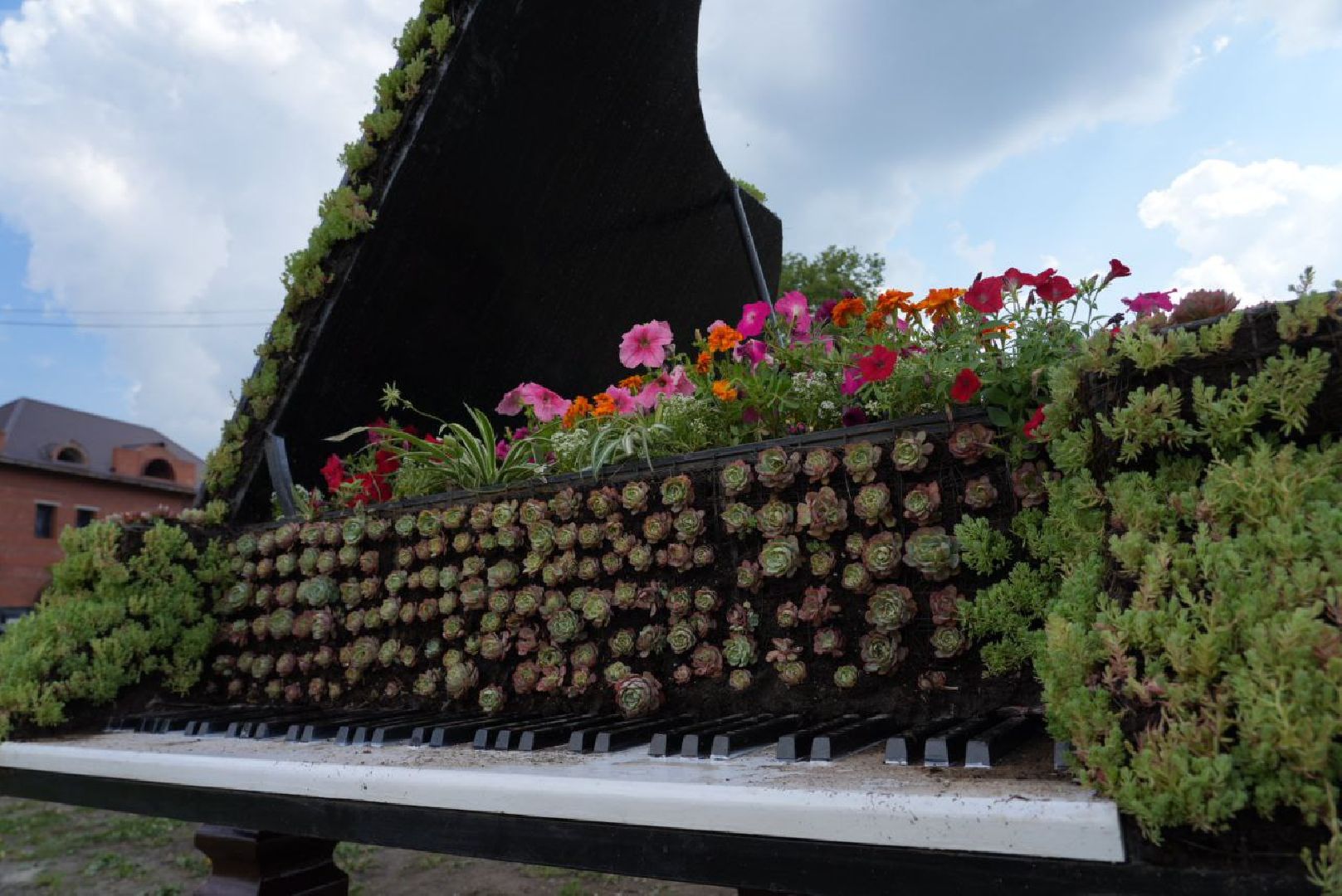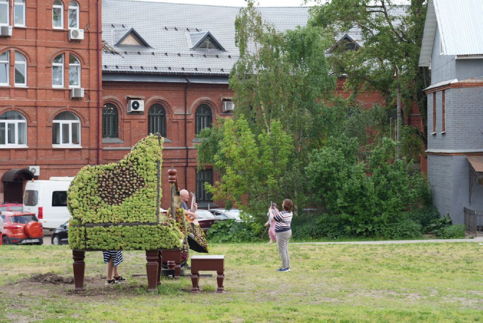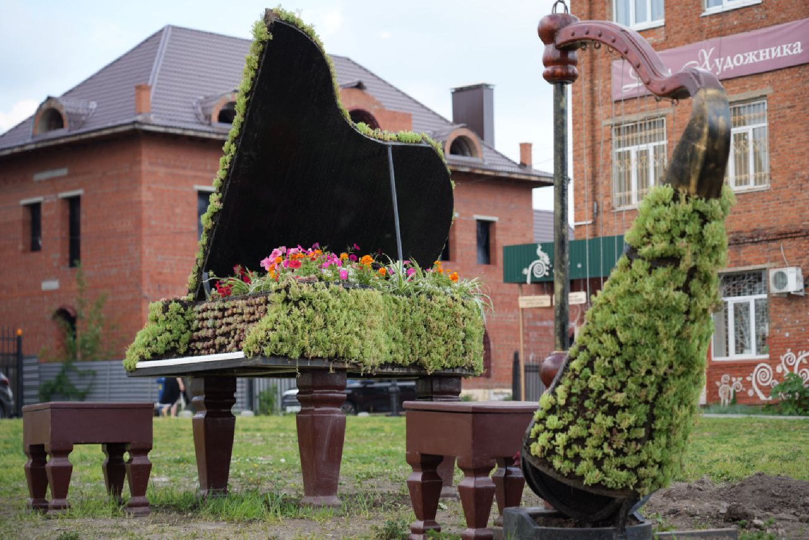Территорию, где раньше стояло недостроенное здание фондохранилища, теперь украсили цветущие арт-объекты. Пианино, балалайка и арфа с высаженными на них цветами не только привлекают внимание прогуливающихся жителей и туристов, но и красиво дополняют местный ландшафт.