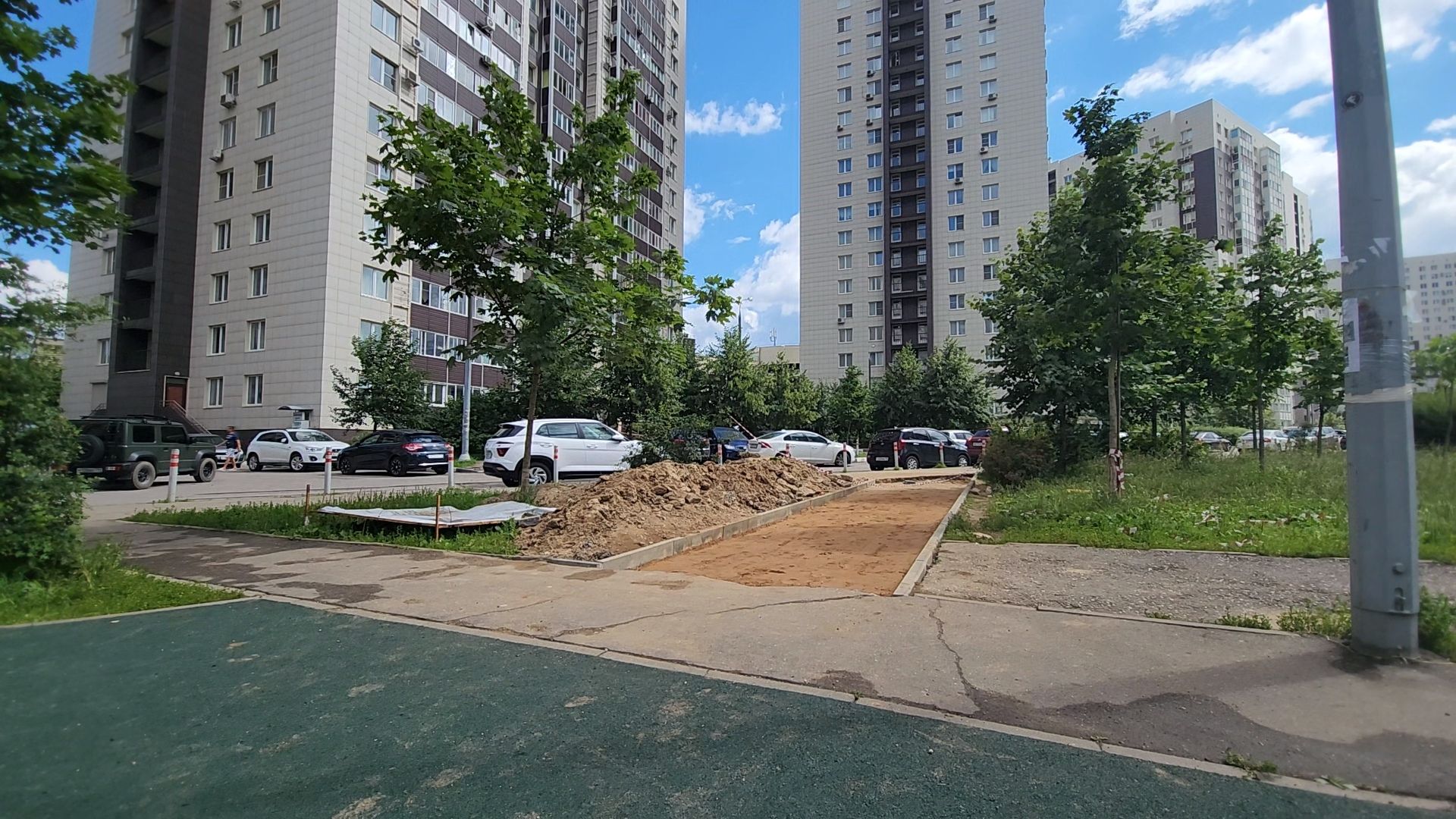 Благоустройство территории продолжается — две новые пешеходные дорожки к площадке уже подготовлены к укладыванию покрытия, установлены бордюры и уложен песок.