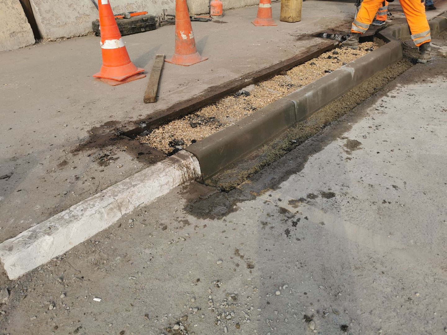 Так как для установки бордюрного камня пришлось вырезать часть старого асфальта, работники «Автобытдора» положили новый.