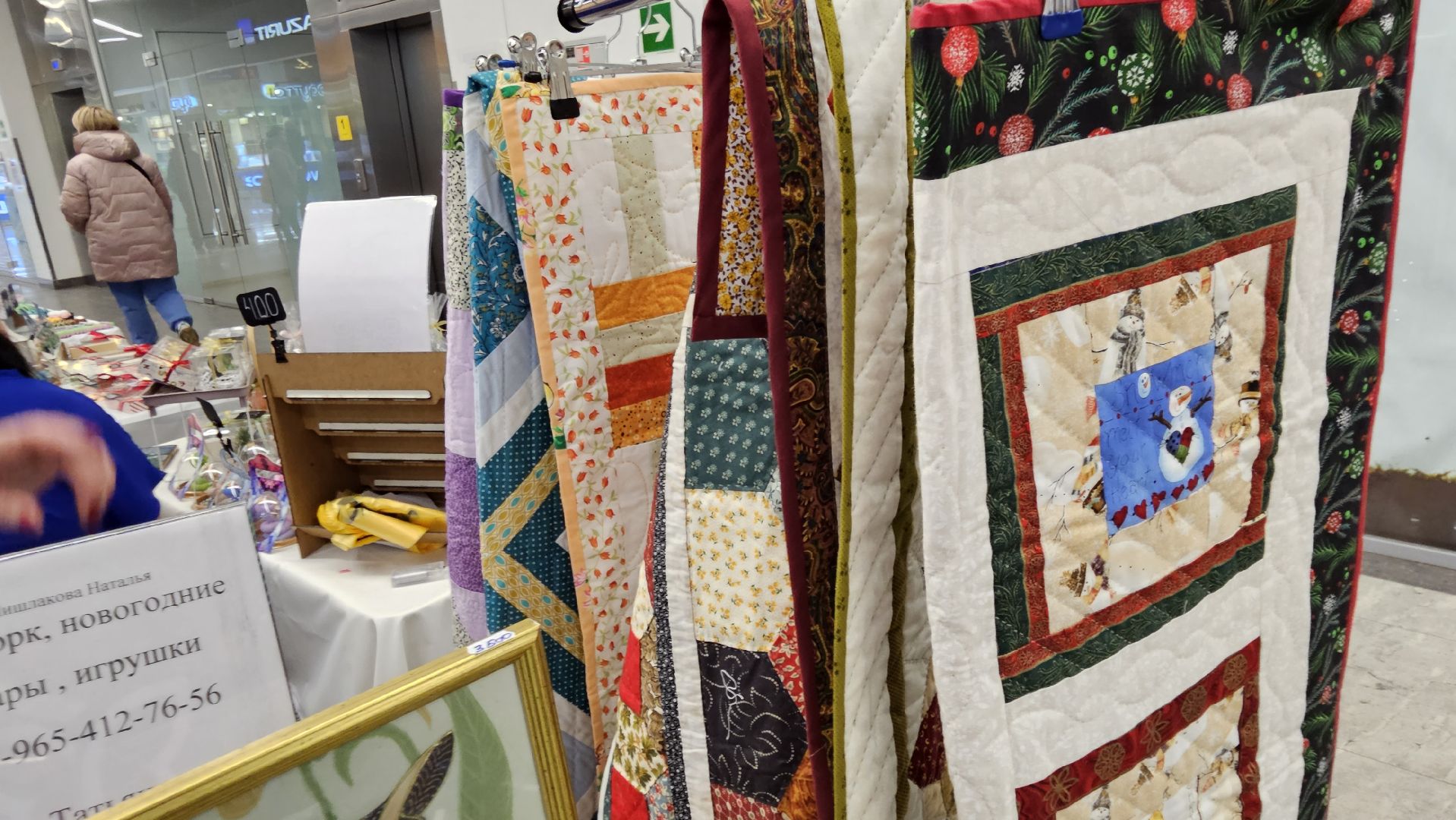 Наталья давно увлеклась шитьём и создаёт полотенца, скатерти, фартуки из водостойкой ткани. Сегодня она привезла изделия из своей новогодней коллекции.
