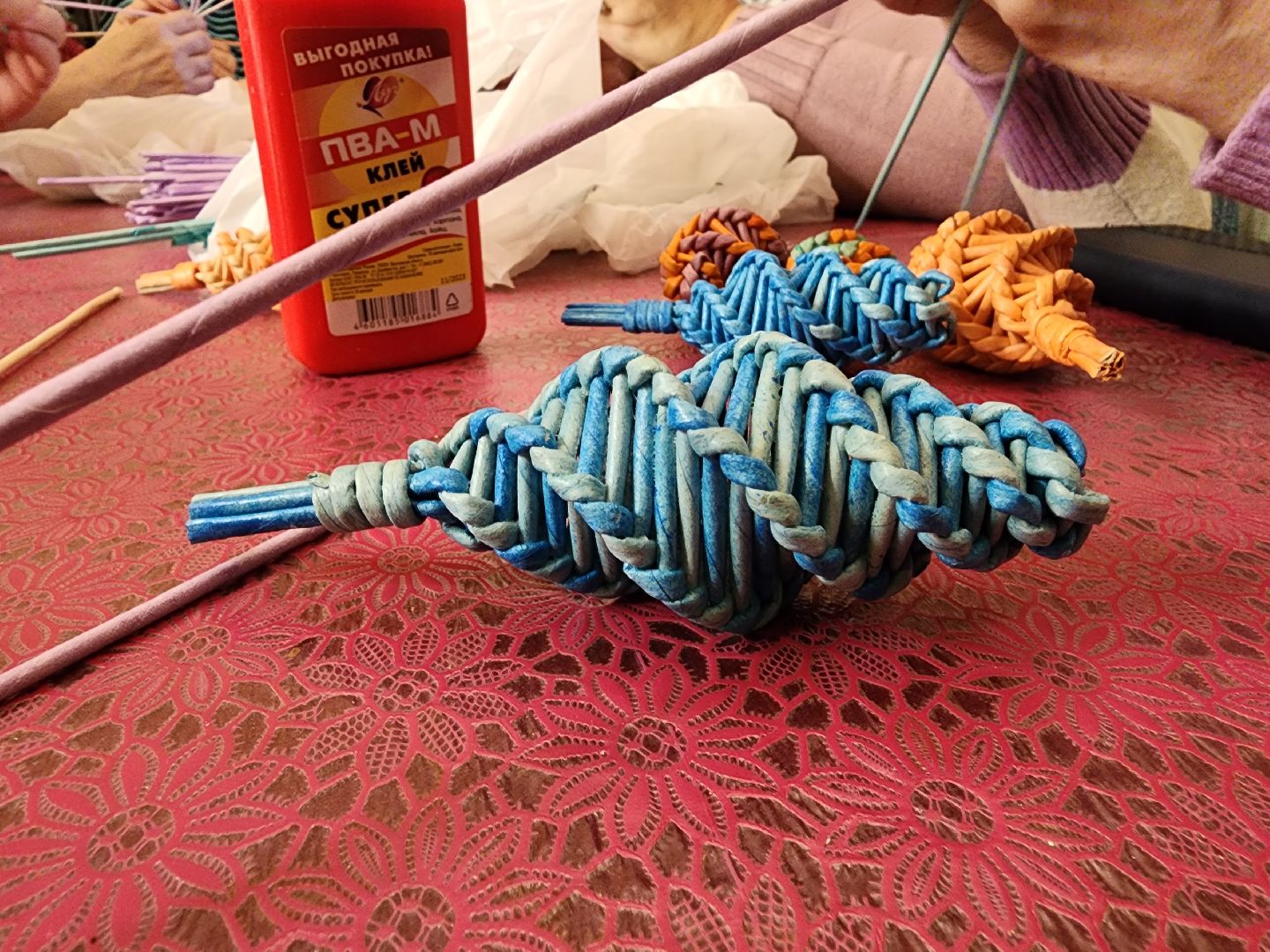Игрушки создавались под руководством местной мастерицы Ольги Бессоновой, которая делилась своими знаниями о технике плетения и помогала в процессе работы. Она рассказала, как сделать лозу из ненужной бумаги, как покрасить ее и в итоге сделать украшение. Плетение из такой лозы даёт бумаге новую жизнь. Для этого понадобятся простые материалы: клей, бумага или старая газета, тонкая спица и краска.