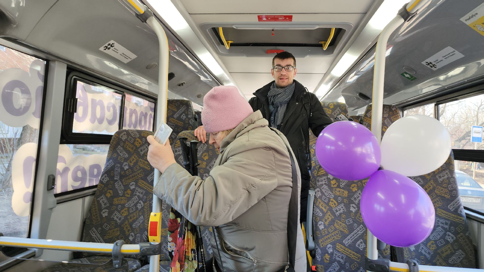 «Я так спешила, что не сразу обратила внимание на то, как красиво оформлен автобус. Теперь вижу. Даже у меня настроение поднялось. Хотя муж лежит в больнице, и все мысли сейчас — там», — признается жительница Люберец Екатерина Пузинова.
