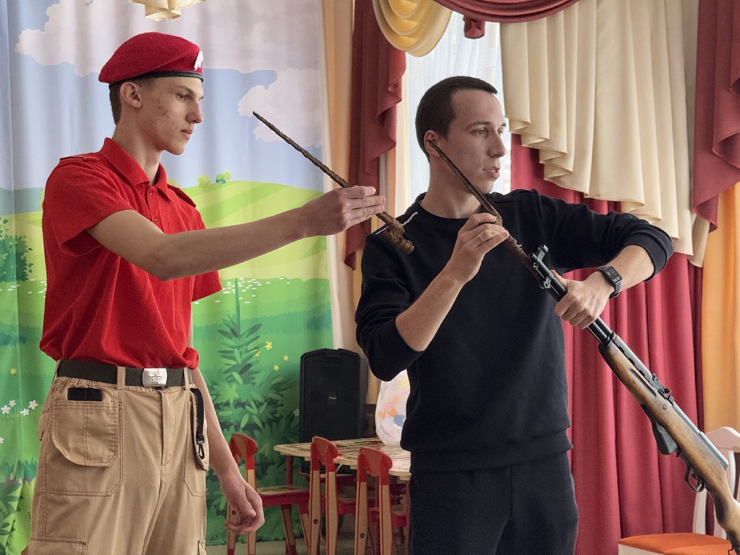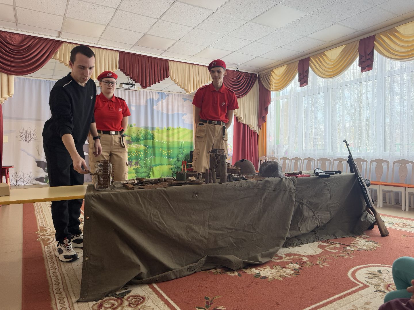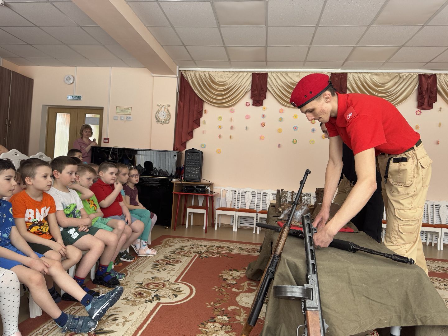 В детском саду «Теремок» провели интерактивную программу «Юнармейцы – малышам». Ребятам показали экспонаты Великой отечественной войны и рассказали как собирать и разбирать автомат Калашникова.
