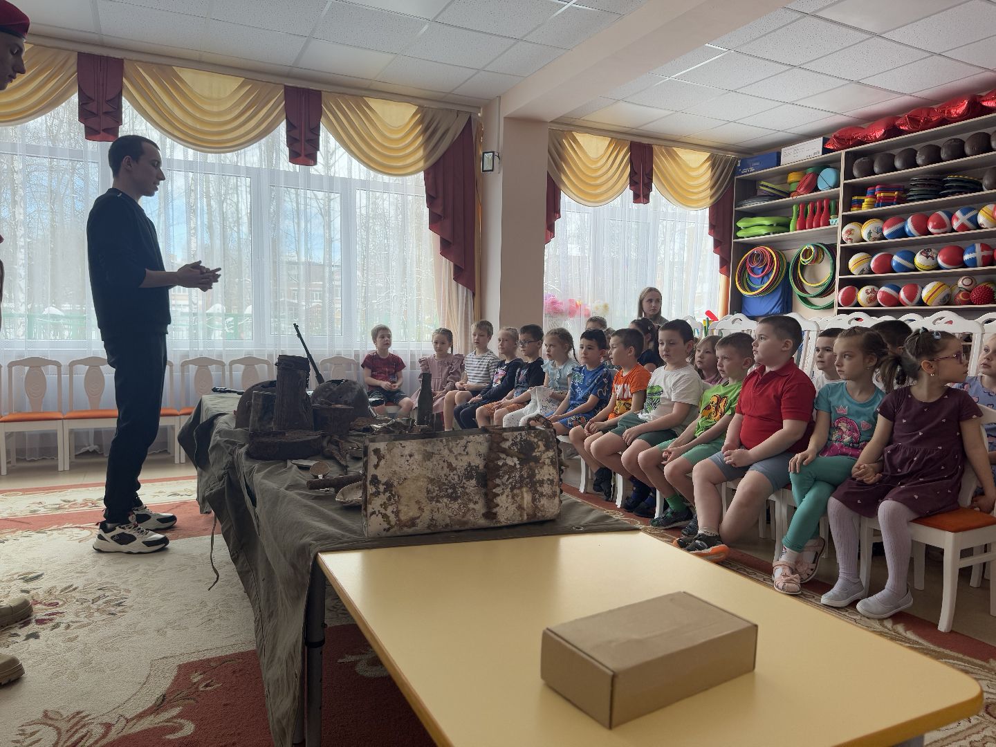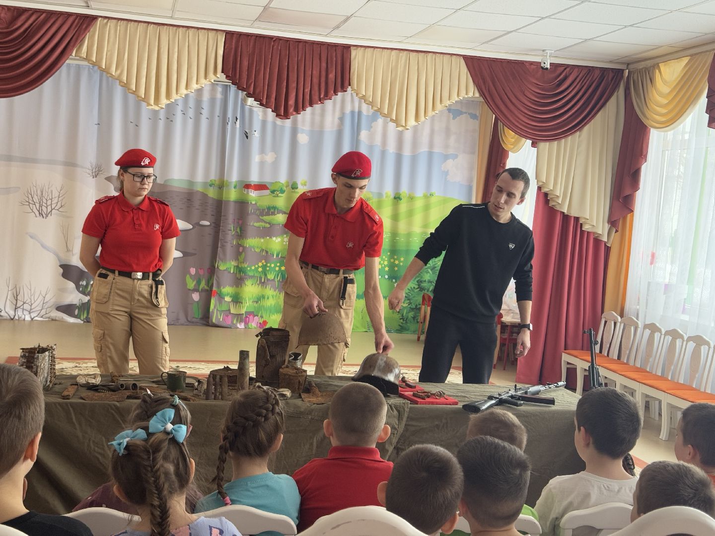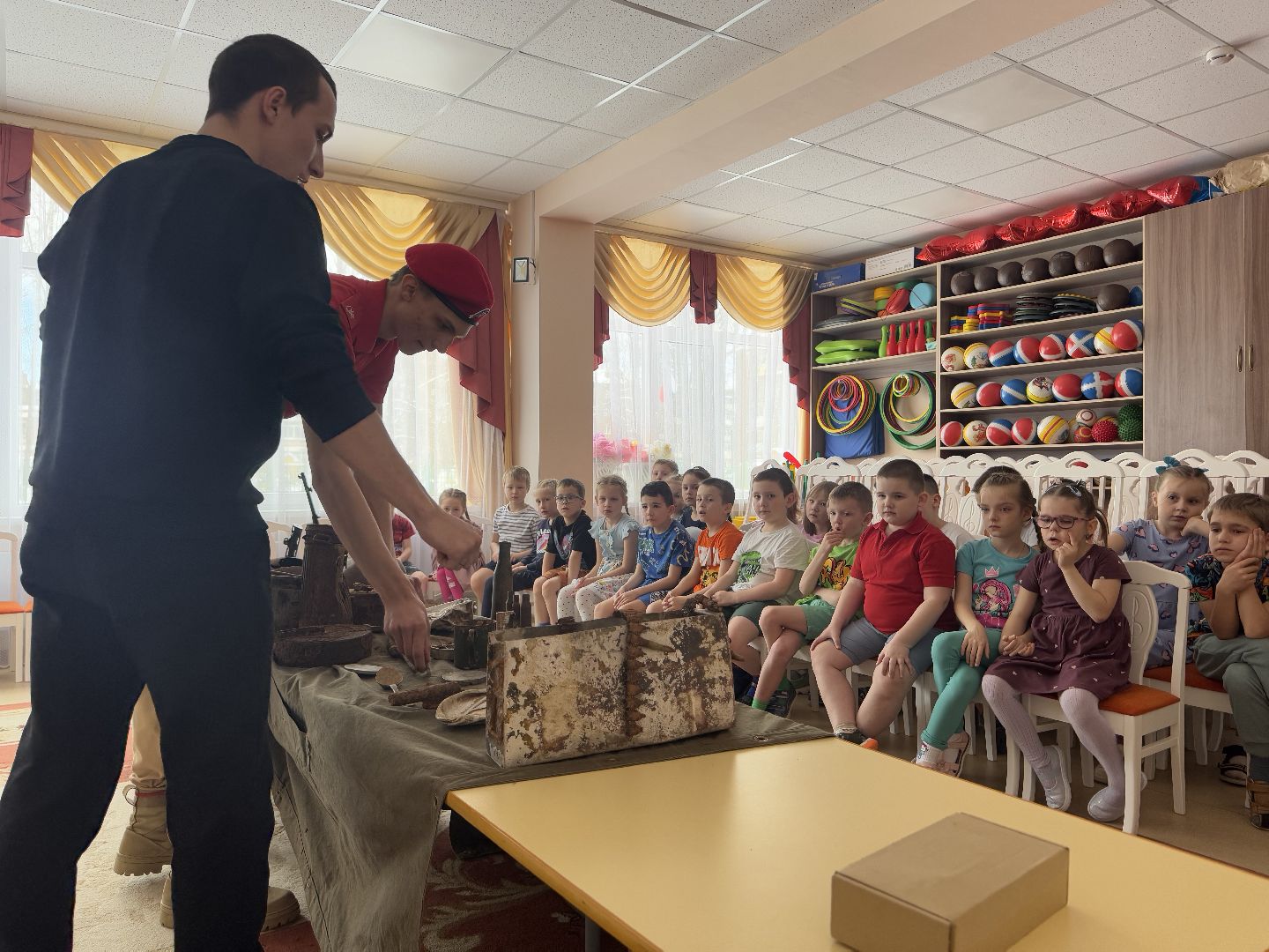 В детском саду «Теремок» провели интерактивную программу «Юнармейцы – малышам». Ребятам показали экспонаты Великой отечественной войны и рассказали как собирать и разбирать автомат Калашникова.