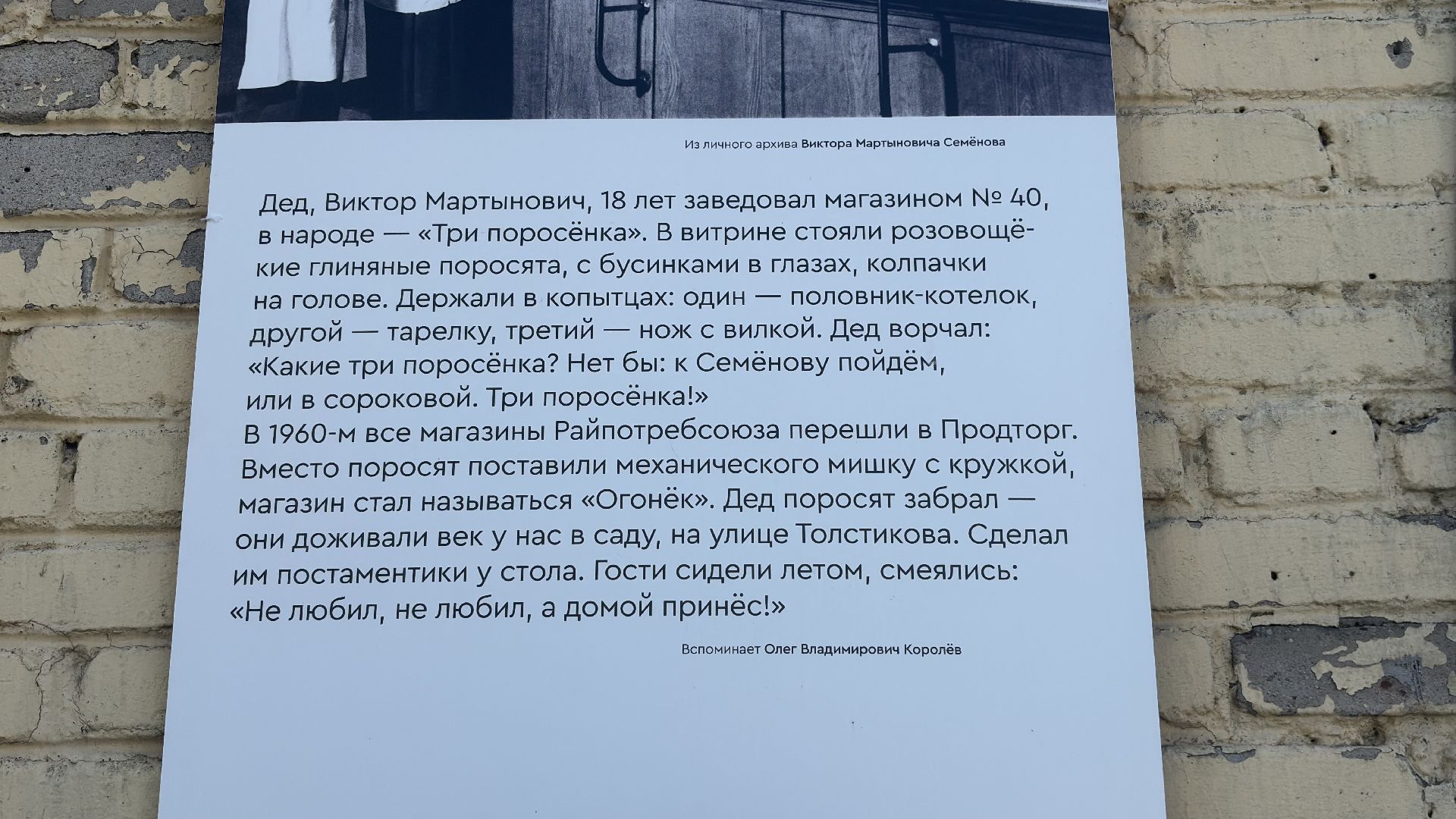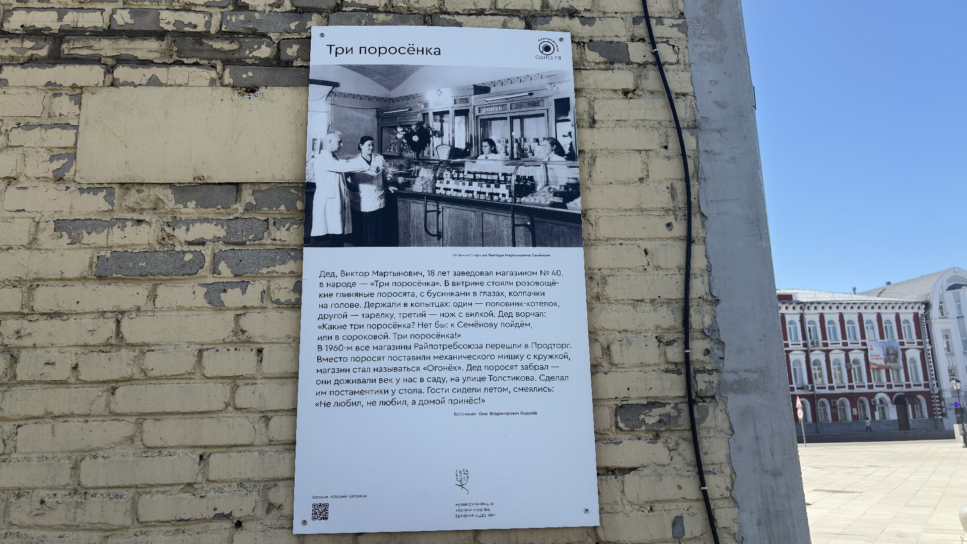 А вот совсем недалеко, у магазина «Спортмастер», можно найти стенд с информацией о трёх глиняных фигурках. Это знаменитые «Три поросёнка» — маленькая городская легенда. В советское время их поставили как декоративный элемент в витрину магазина, и за годы они стали почти мифологическими персонажами. Так до конца и не известно из чего они были сделаны. Фотографии не сохранились до наших дней. Сейчас история «трёх поросят» оформлена на специальной доске, которая висит на доме, где находился этот магазин.