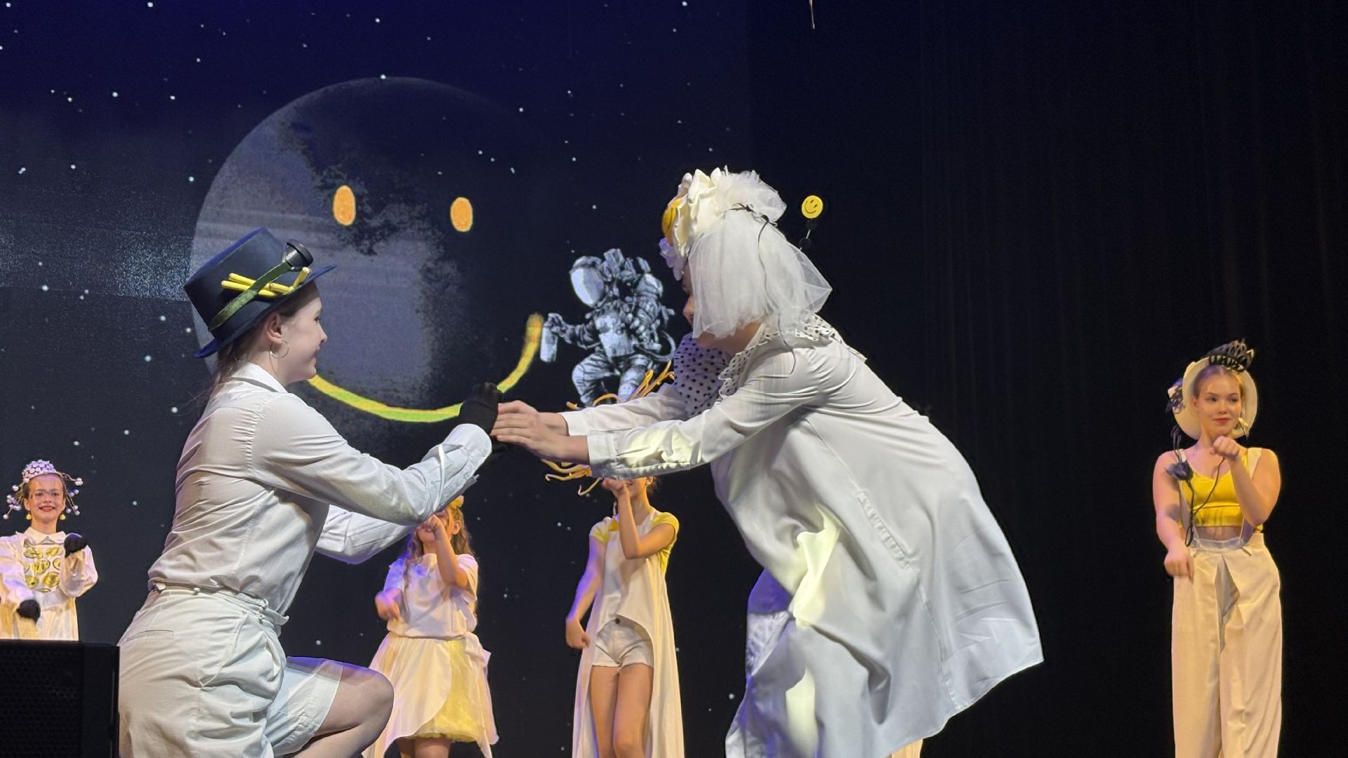 На сцену выходили воспитанницы всех возрастов — от самых маленьких до выпускниц. Танцы, вдохновлённые буги-вуги и современными K-pop ритмами, оживляли зал и задавали настроение всему вечеру. Финал концерта — общая фотография на сцене — стал красивой точкой, в которой сошлись гордость, радость и чуть-чуть грусти по уходящему творческому году.