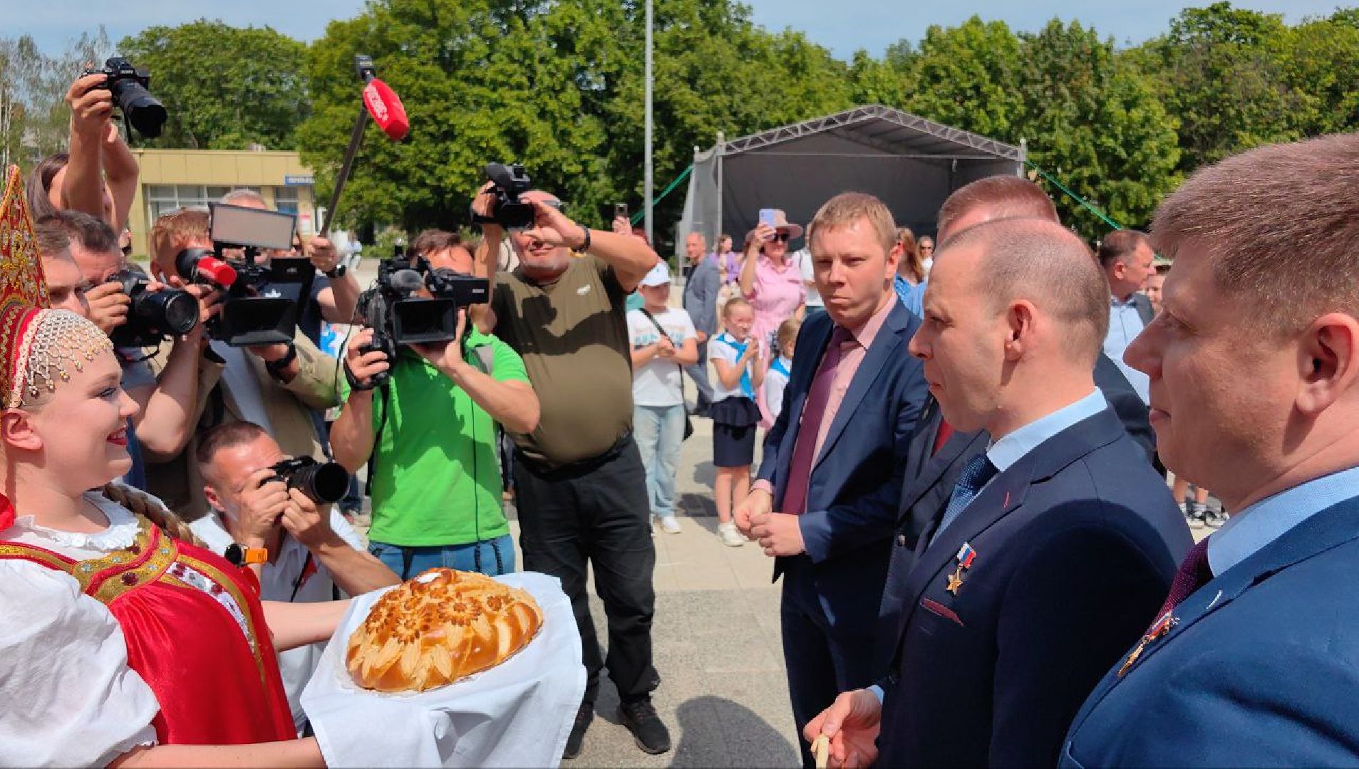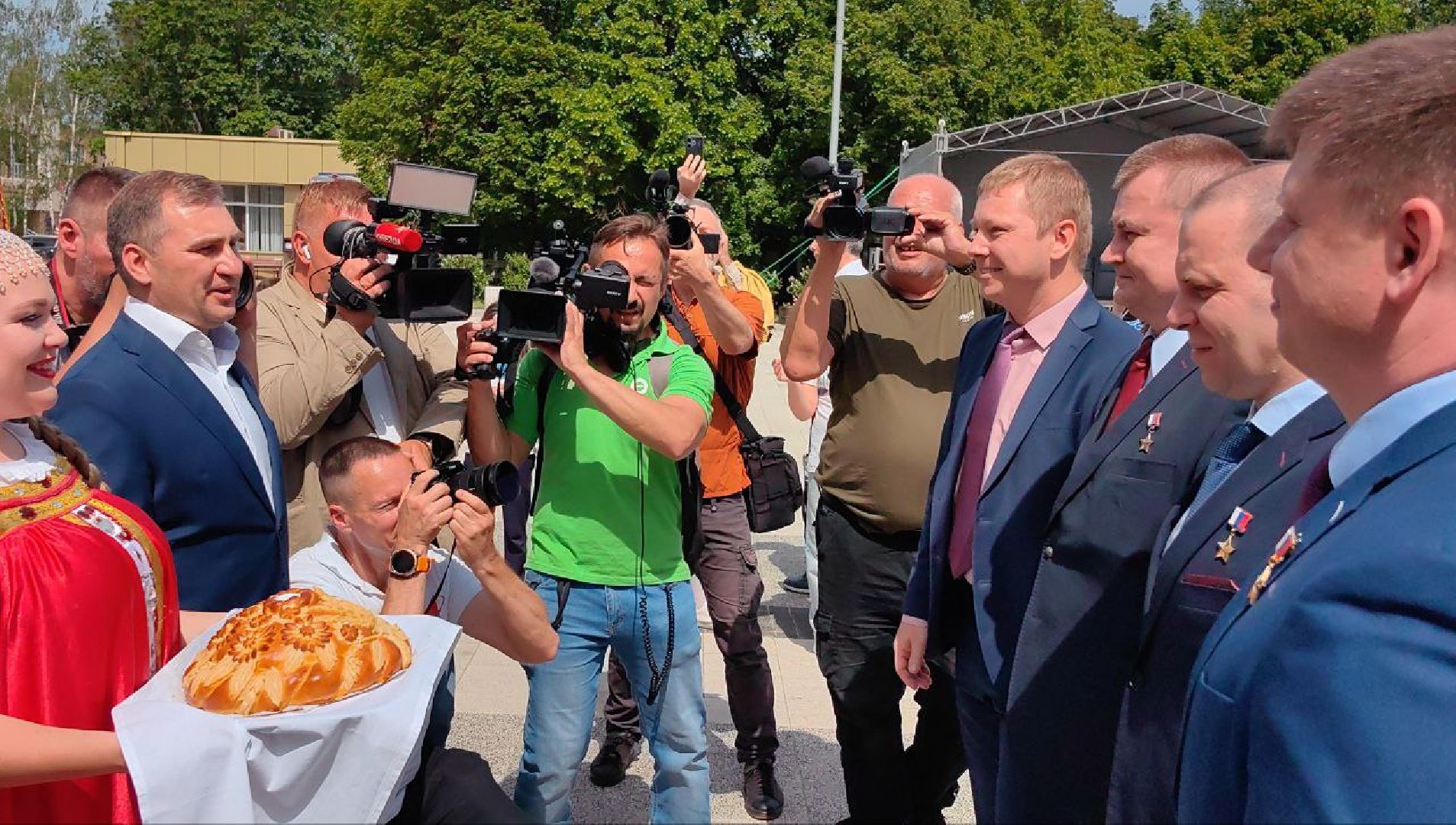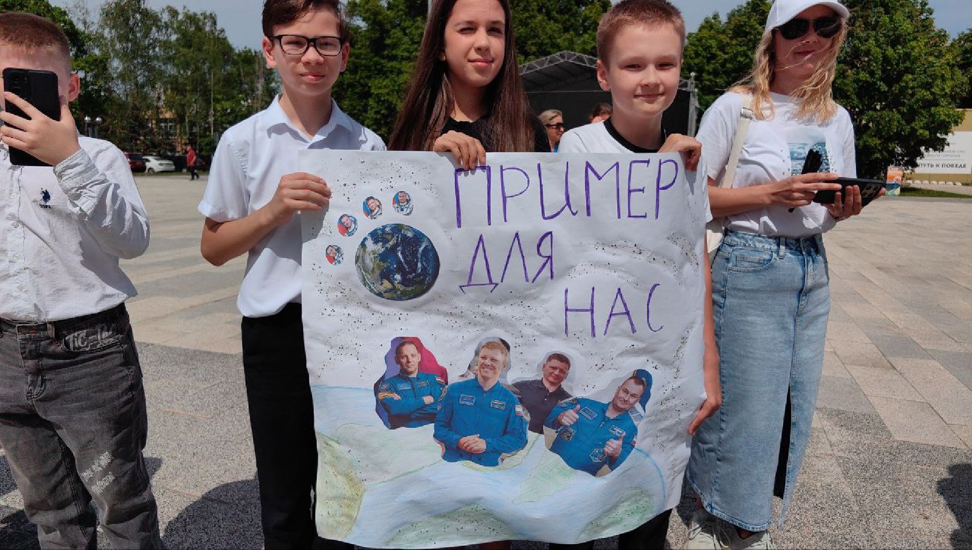 К ним присоединились космонавты предыдущей экспедиции — Александр Гребёнкин и Александр Горбунов. После прибытия к памятнику Гагарину они торжественно, по традиции, возложили цветы и дали небольшую пресс-конференцию.