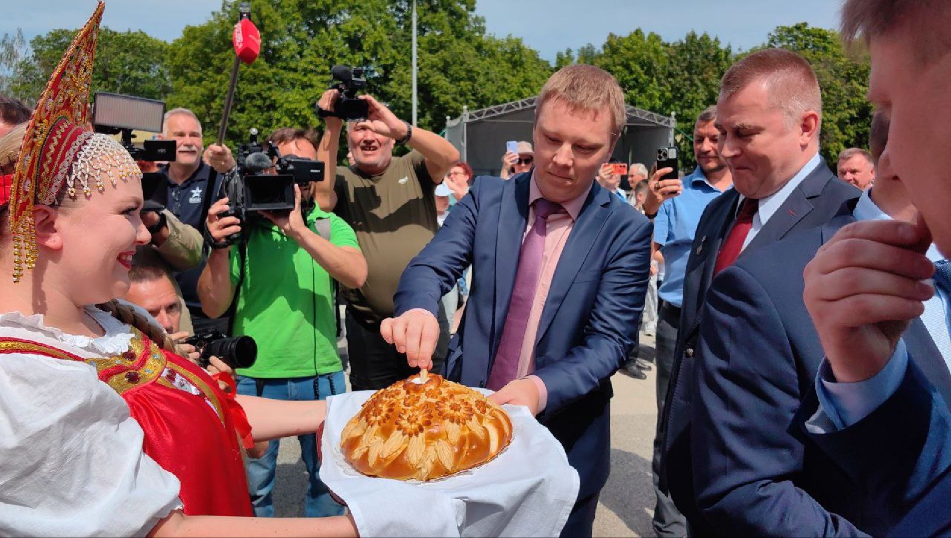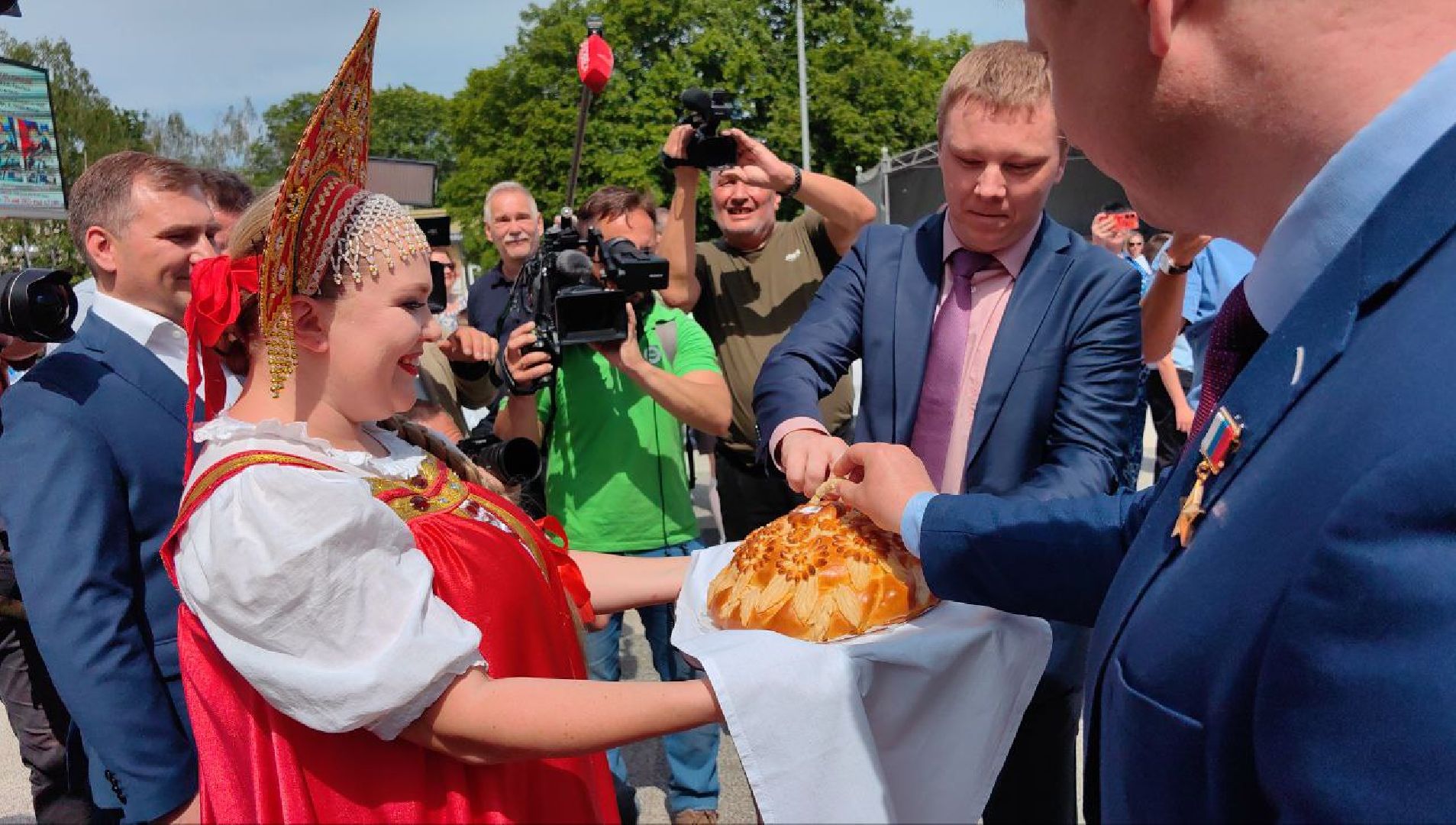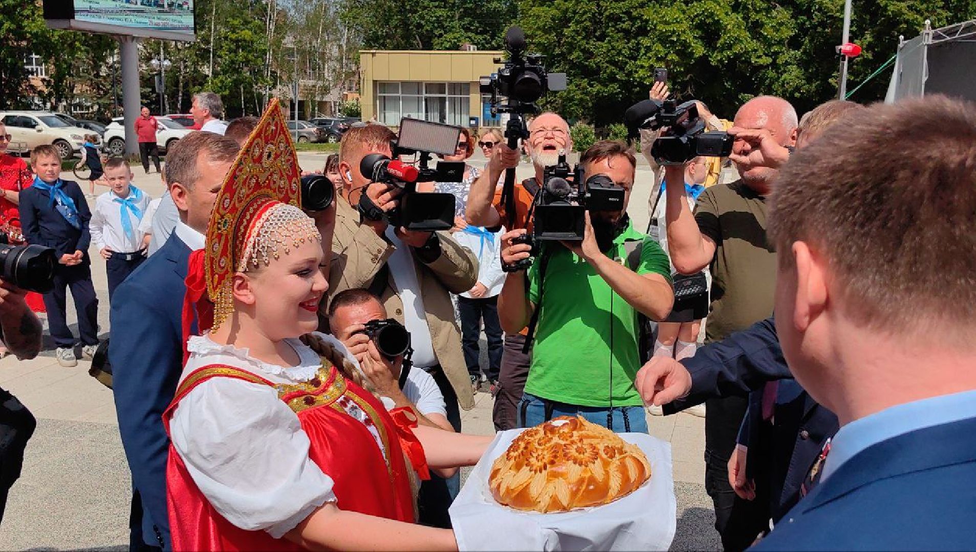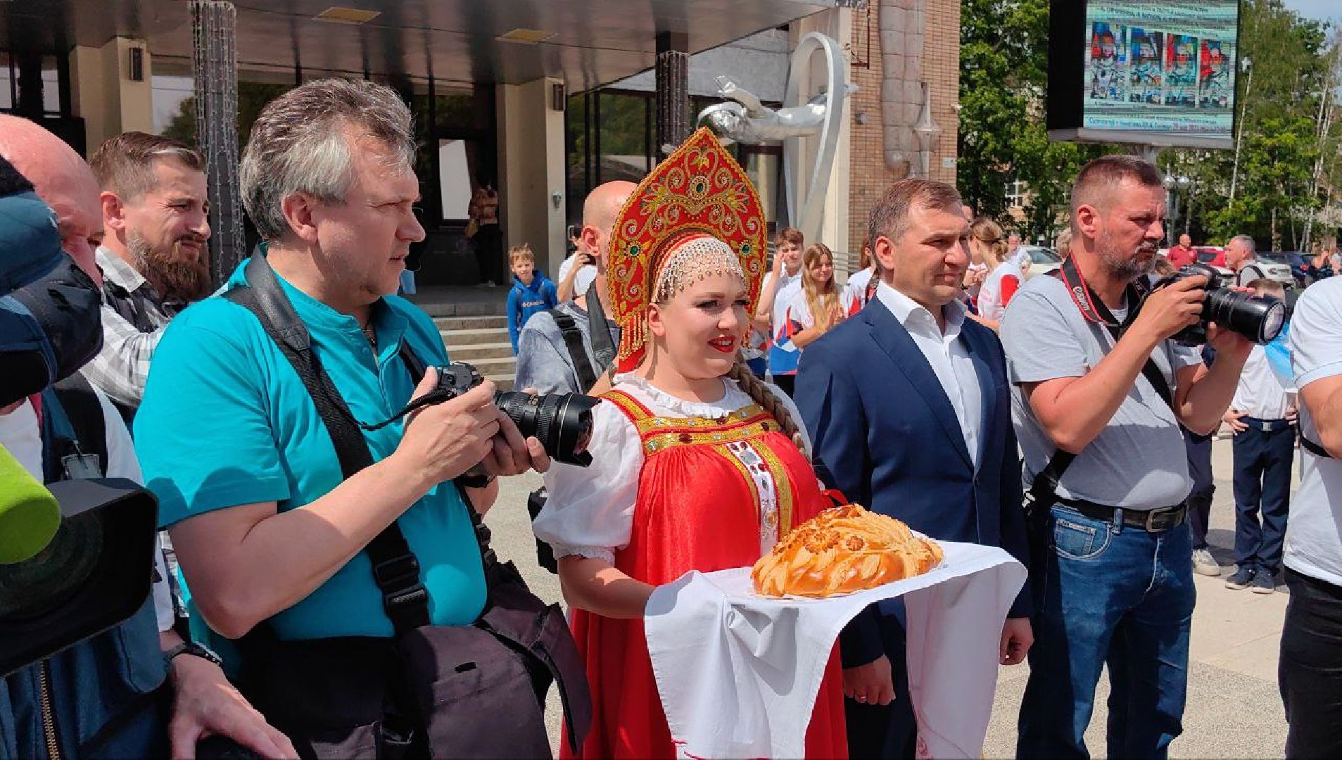 К ним присоединились космонавты предыдущей экспедиции — Александр Гребёнкин и Александр Горбунов. После прибытия к памятнику Гагарину они торжественно, по традиции, возложили цветы и дали небольшую пресс-конференцию.
