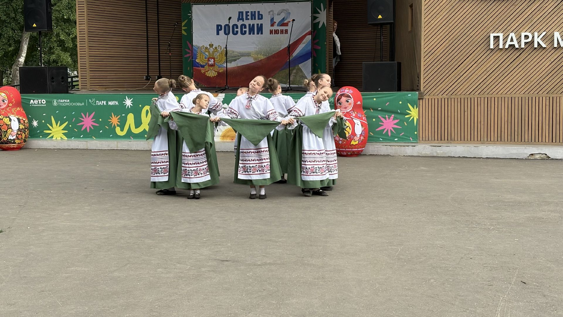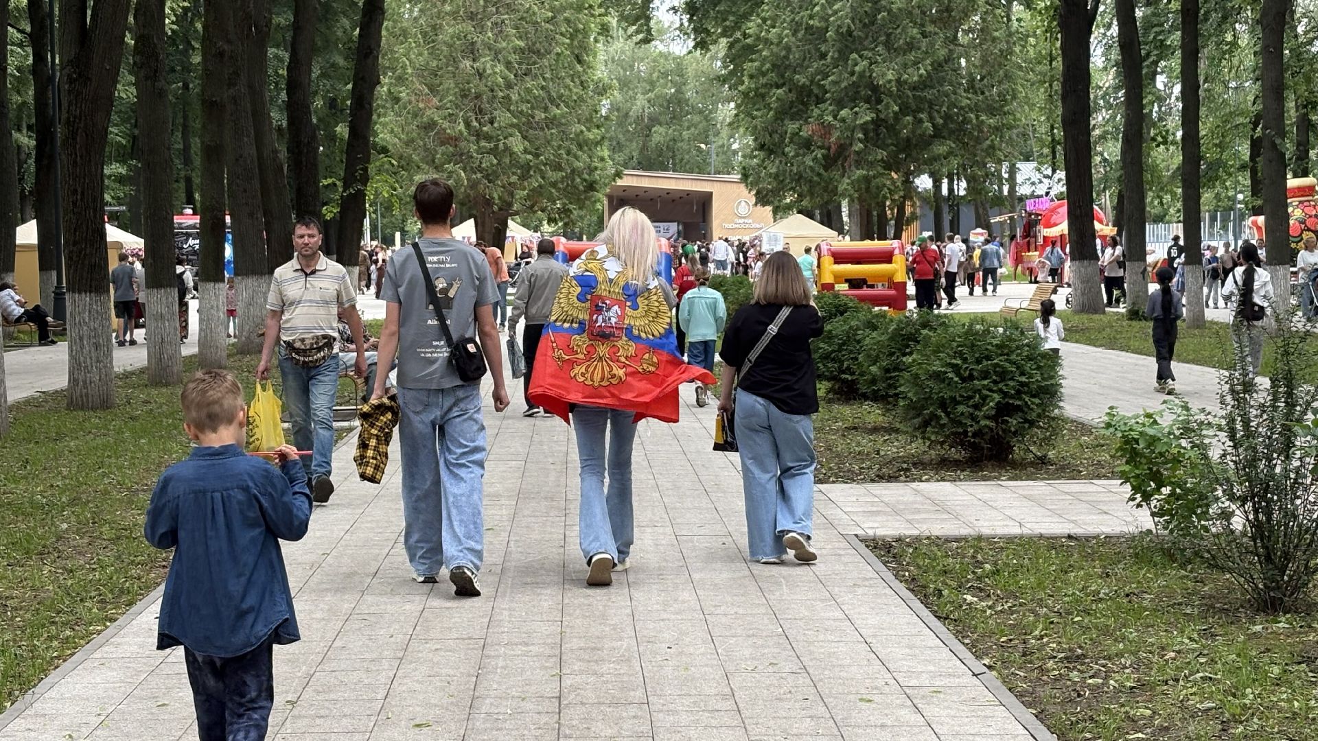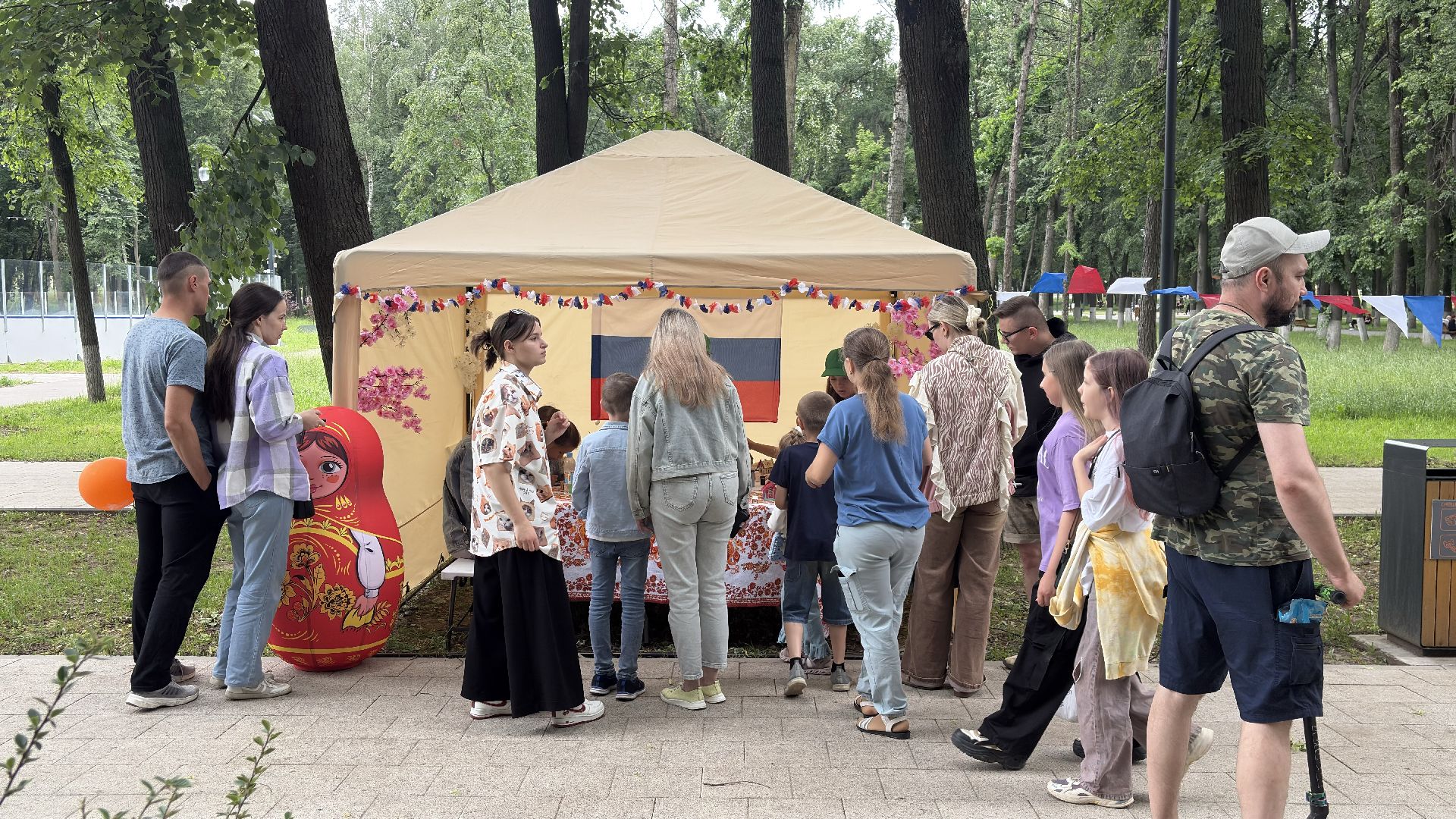 Сегодня Парк Мира наполнен музыкой. Коломенцы празднуют День России. Люди приходят с семьями, с друзьями, кто-то просто гуляет, а кто-то задерживается у палаток с народными ремёслами — здесь дают попробовать расписать сувенир своими руками или собрать открытку из цветного песка. Всё это — не просто развлечение, а возможность прикоснуться к живой традиции.