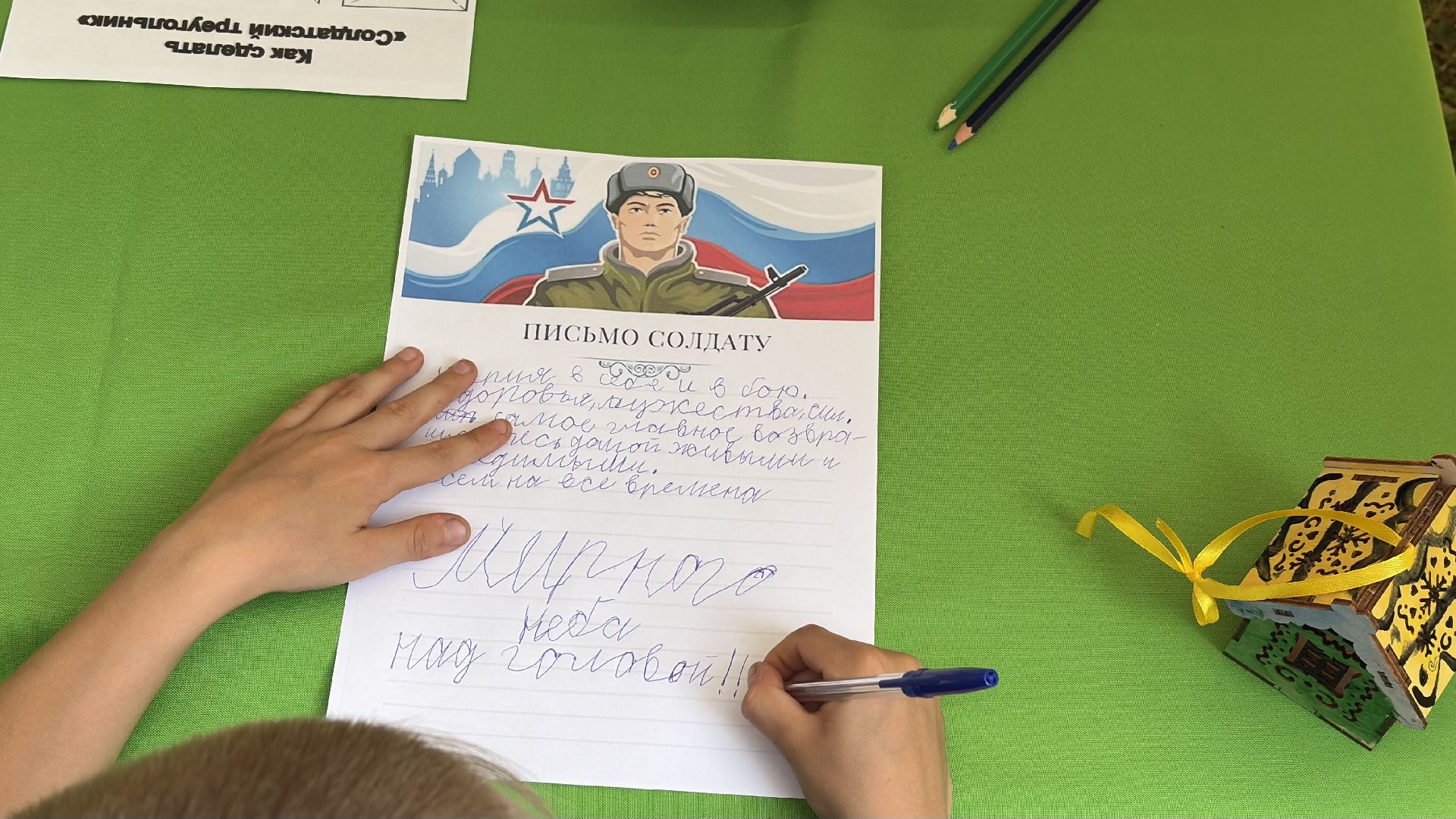 Но, пожалуй, самая тихая и важная точка сегодня — там, где пишут письма. Бумага. Ручка. Человек напротив думает, что написать солдату. Просто пару слов. Без пафоса. С теплотой. Кто-то пишет «Спасибо». Кто-то — «Мы вас ждём» или «Вы не одни». Эти письма уедут к тем, кто сейчас далеко. К тем, кому важно почувствовать: о них помнят, они не одни. Каждое письмо — как рука на плече. Тихая, но очень настоящая поддержка.
