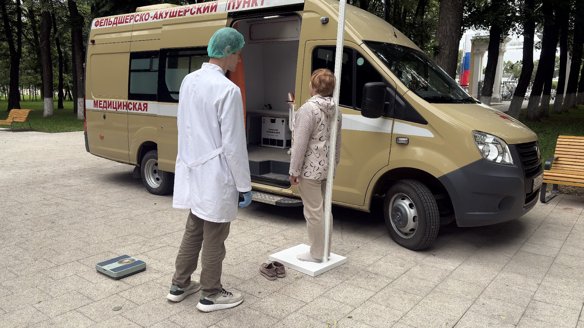 В Парке Мира стояла передвижная медицинская точка — автомобиль с узнаваемой медицинской символикой. Медики работали с 9:00 до 13:00. За это время они успели принять около десяти человек, так как на каждого уходит примерно полчаса. Работали спокойно и внимательно, без спешки. Чтобы попасть внутрь, нужно просто прийти и дождаться своей очереди, никакой предварительной записи не требуется.
