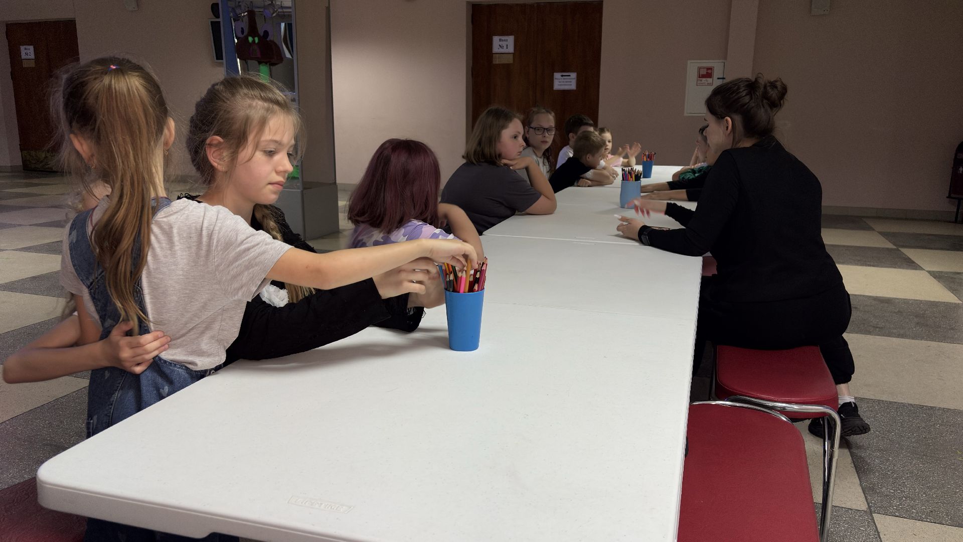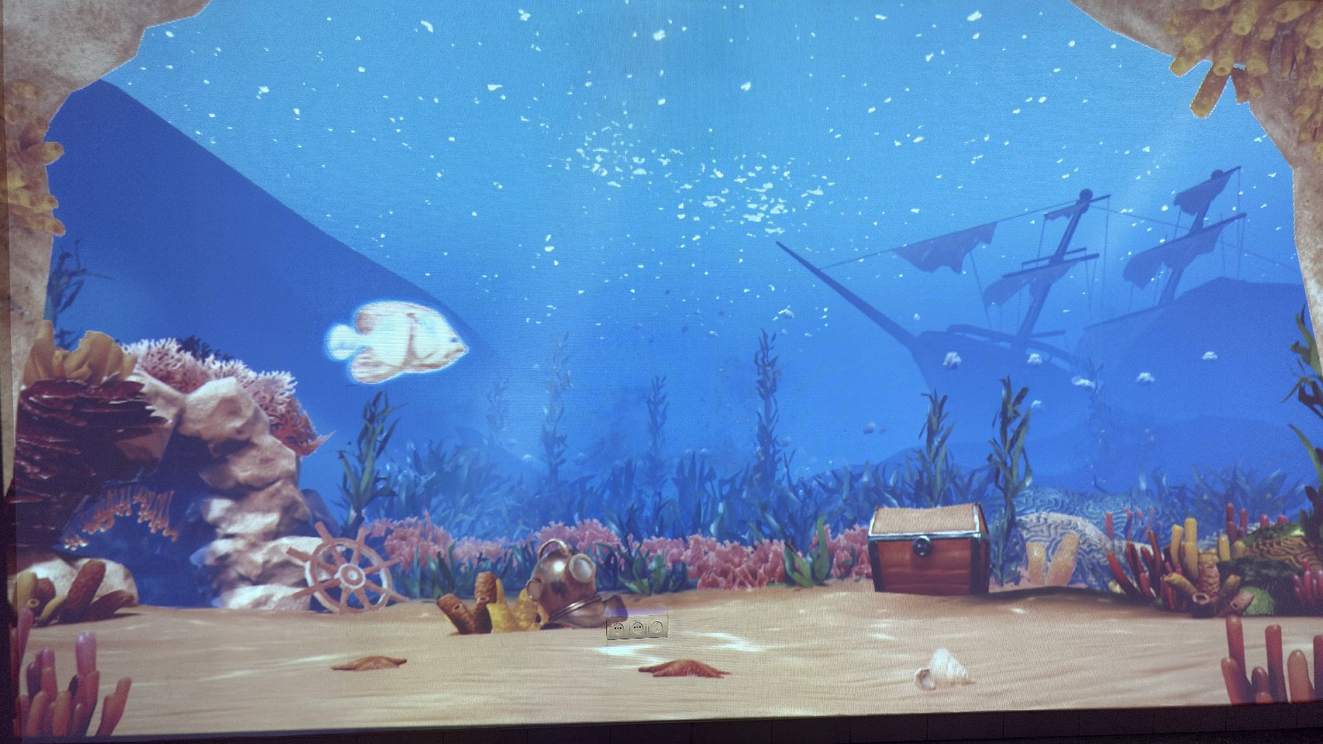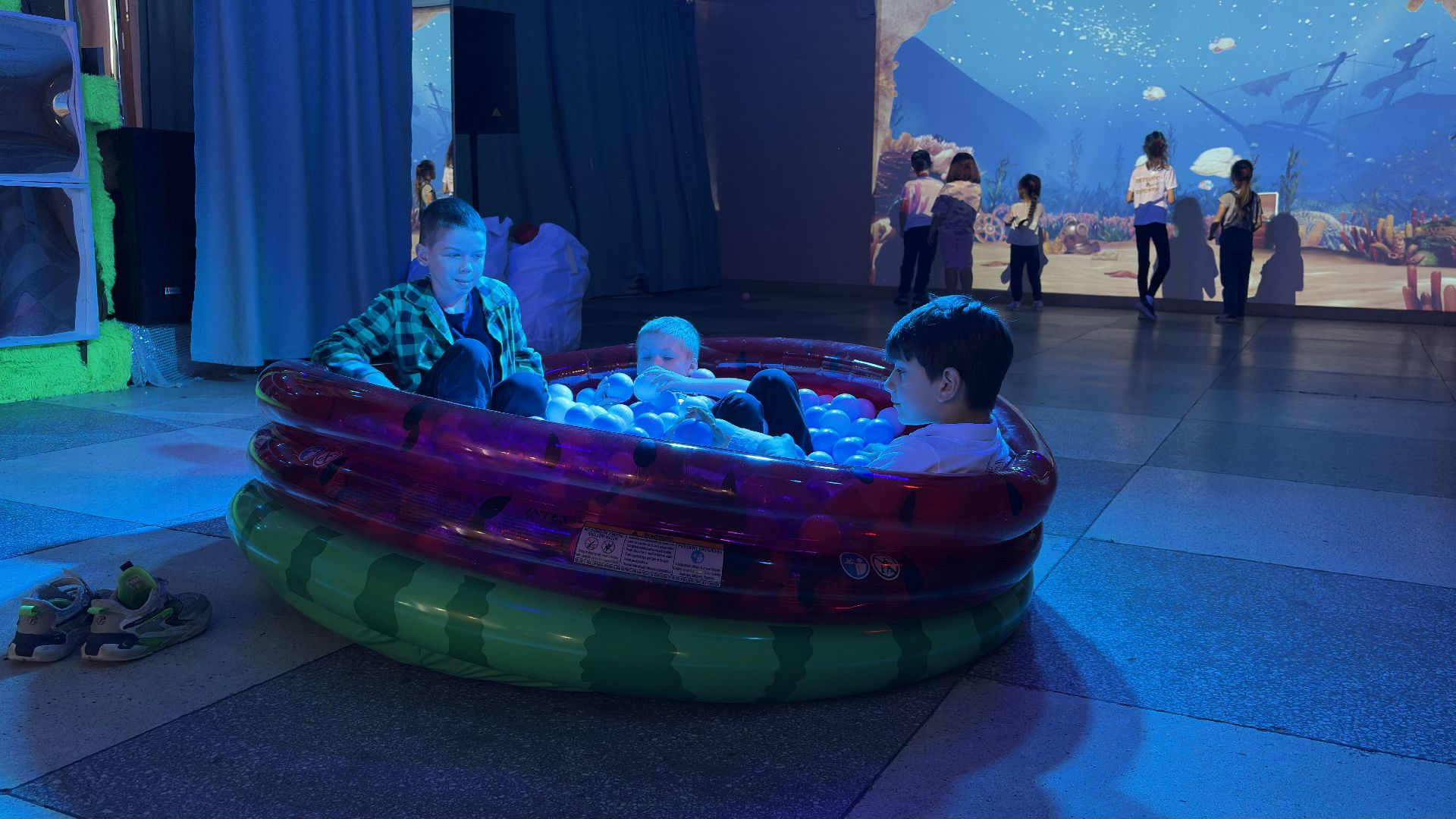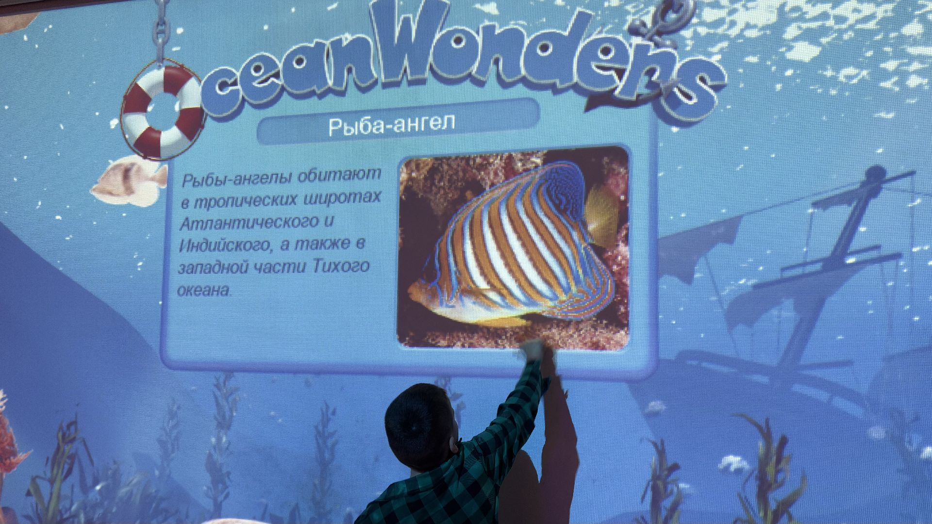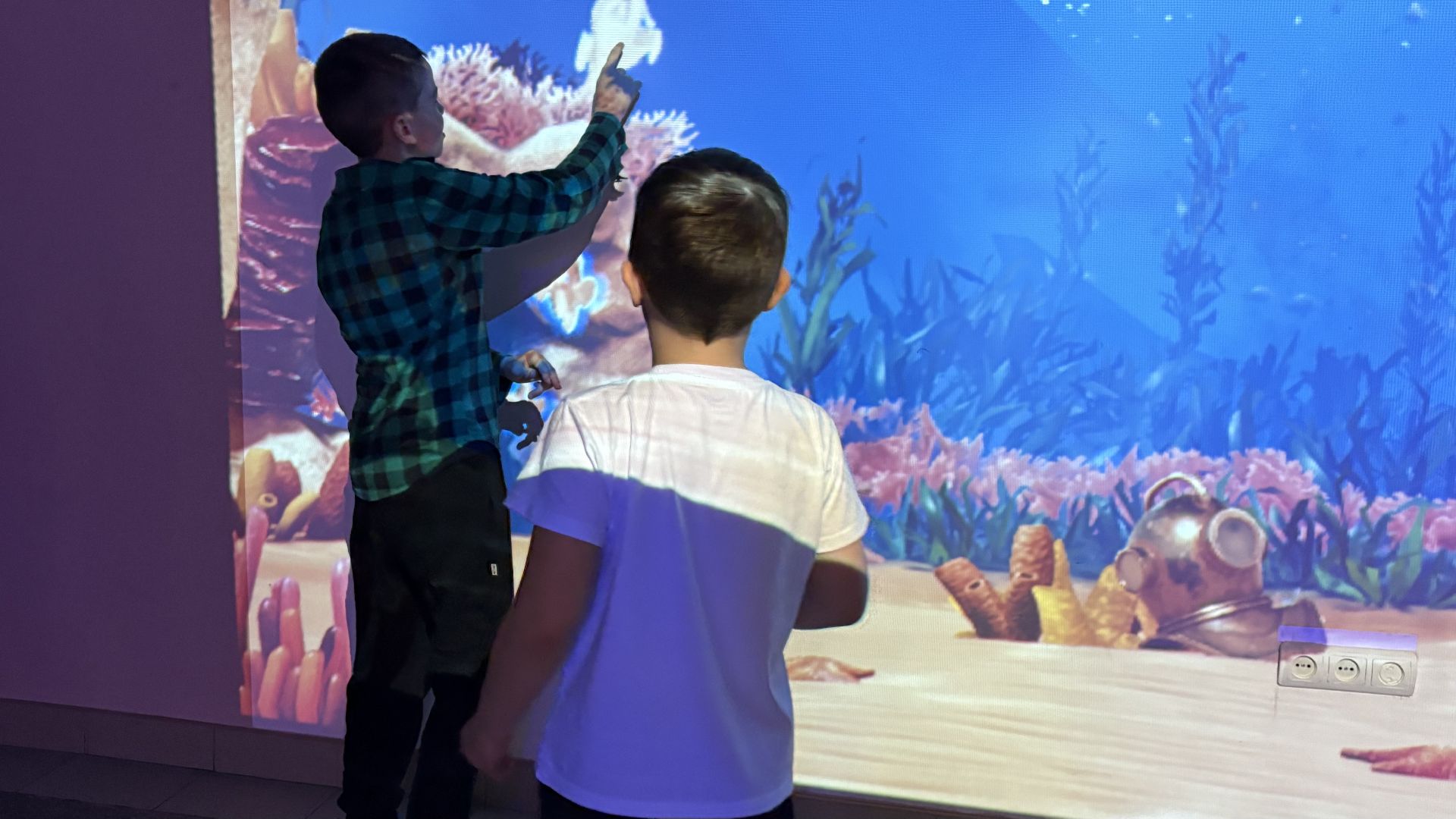 Для детей специально подготовили помещение с интерактивным оборудованием. В фойе второго этажа установлена доска, которая помогает нарисованным рыбкам оживать. Ребята раскрашивают заранее подготовленные рисунки, после чего те сканируются и появляются на экране интерактивной доски.