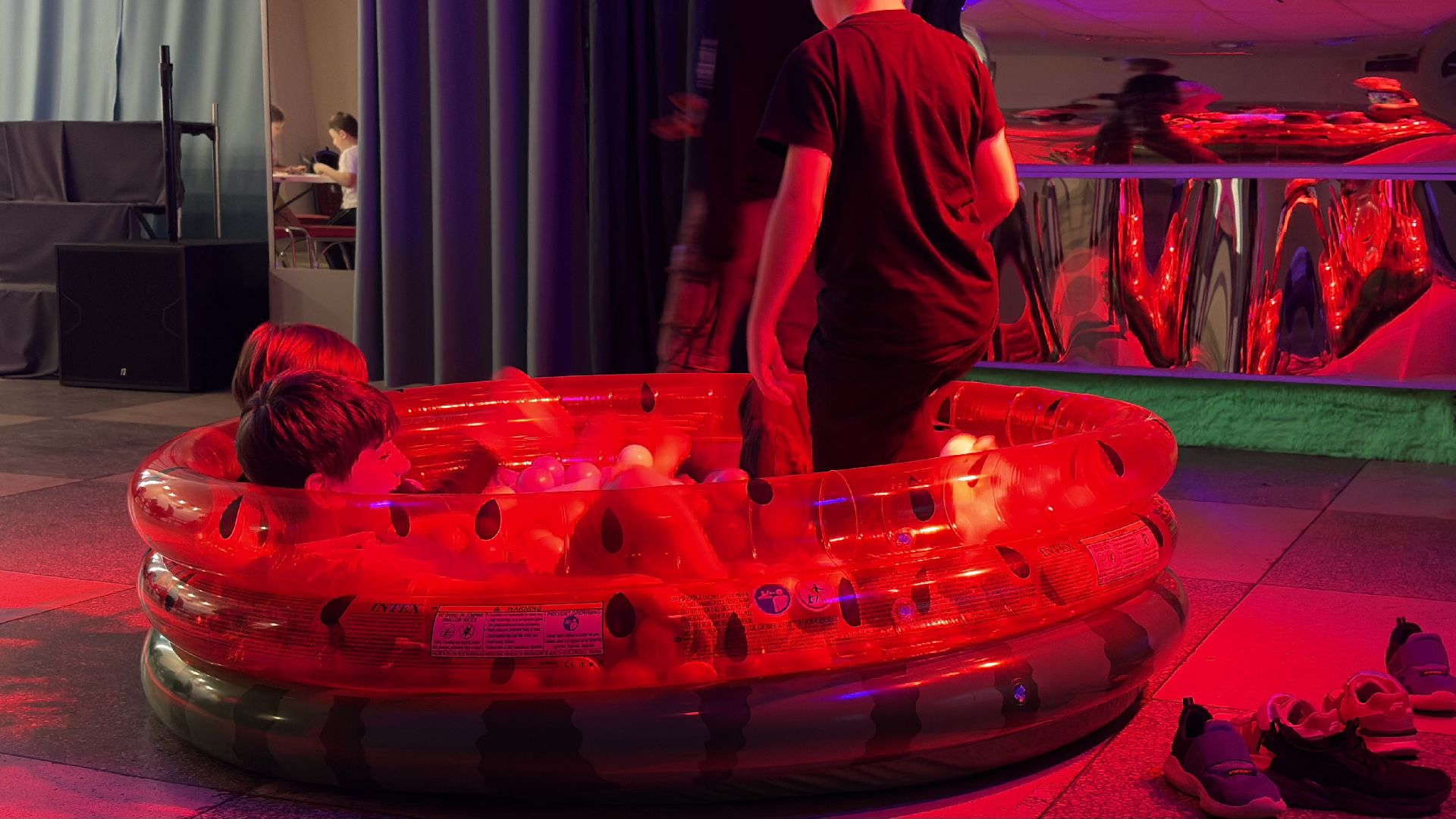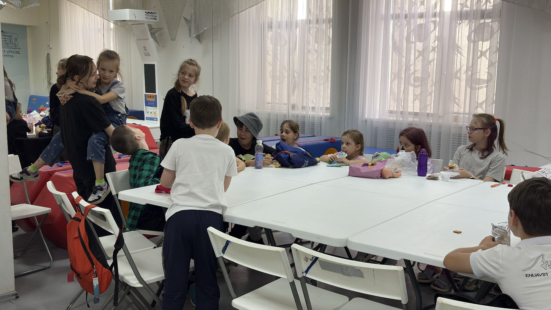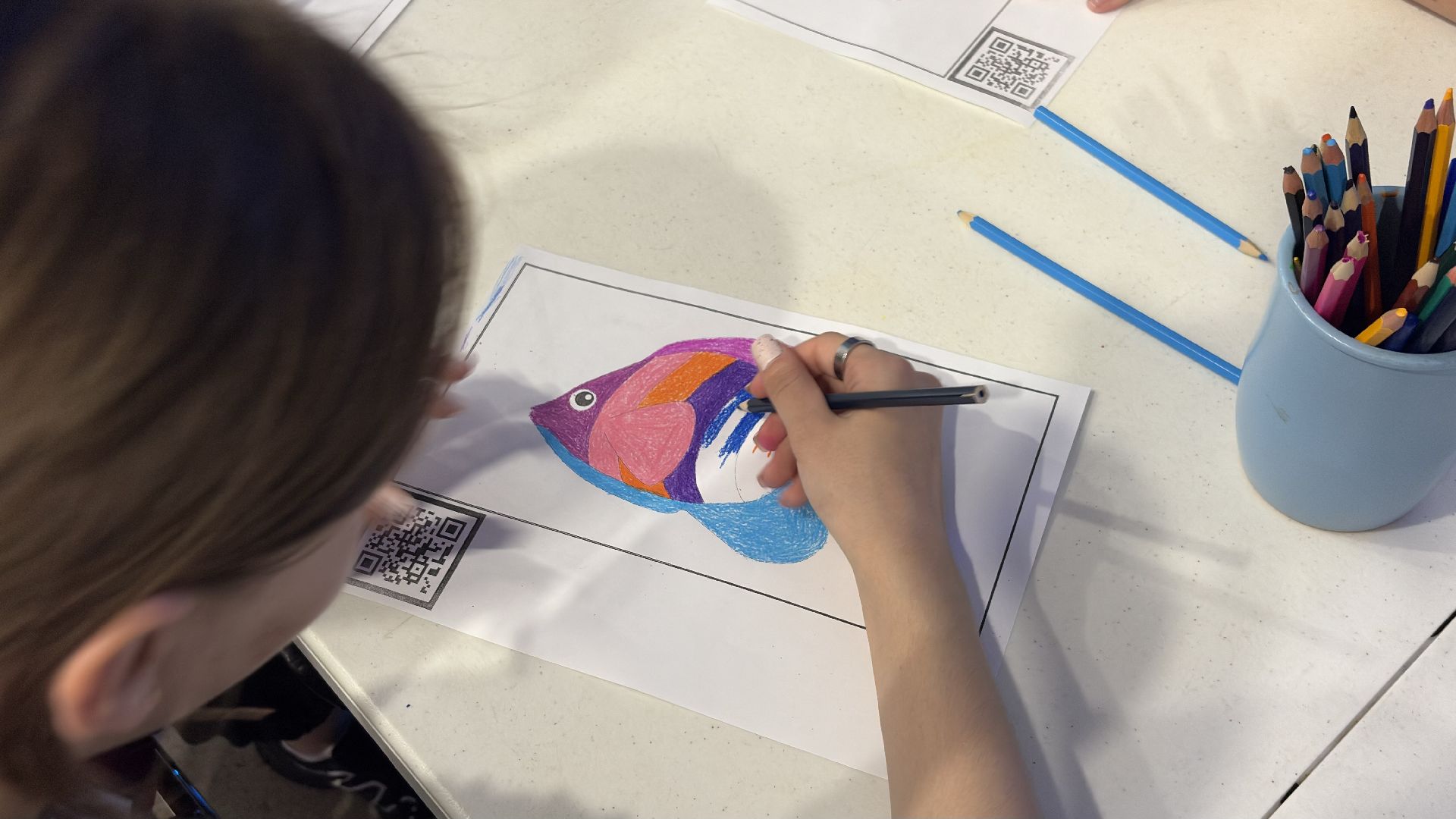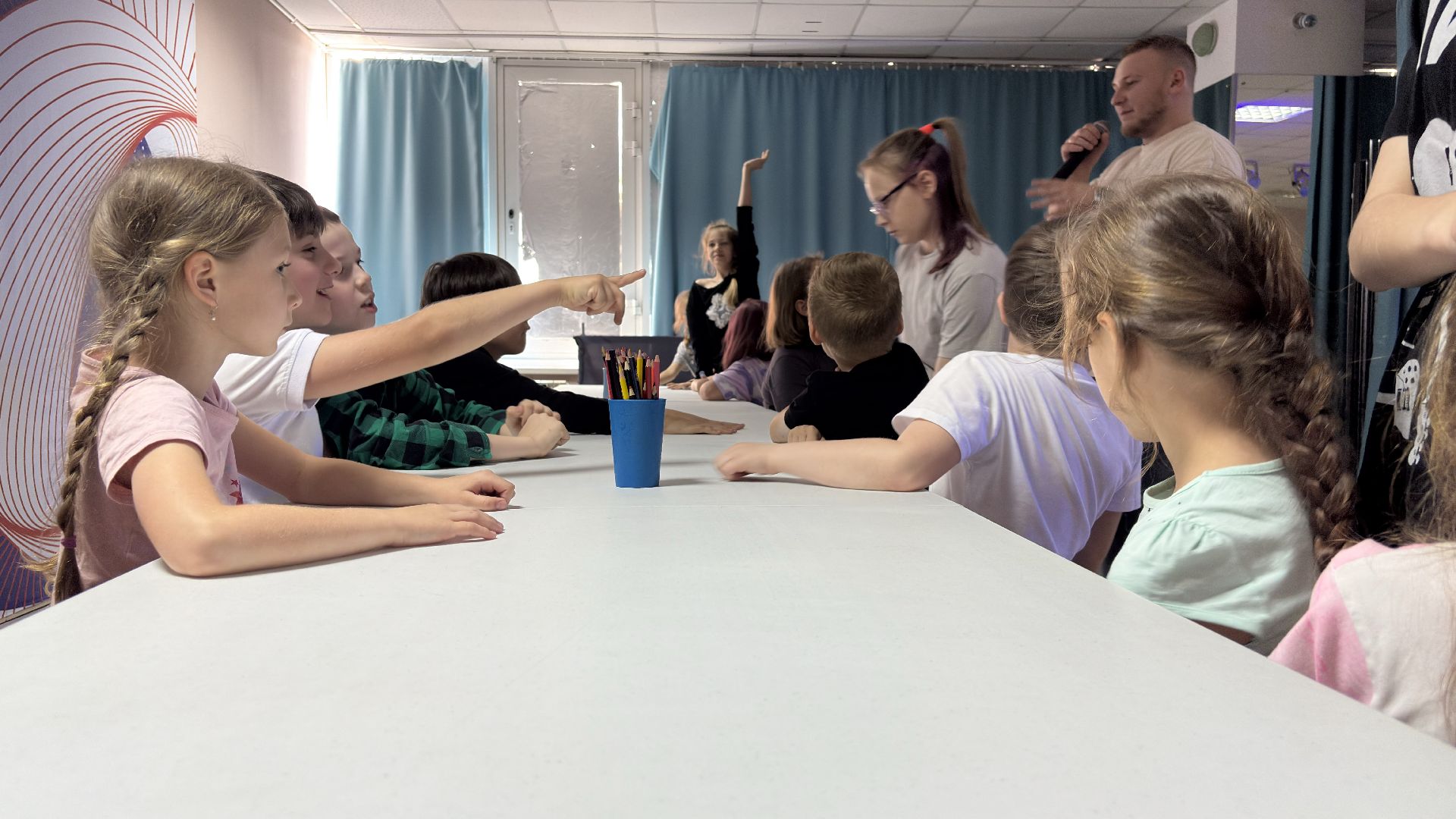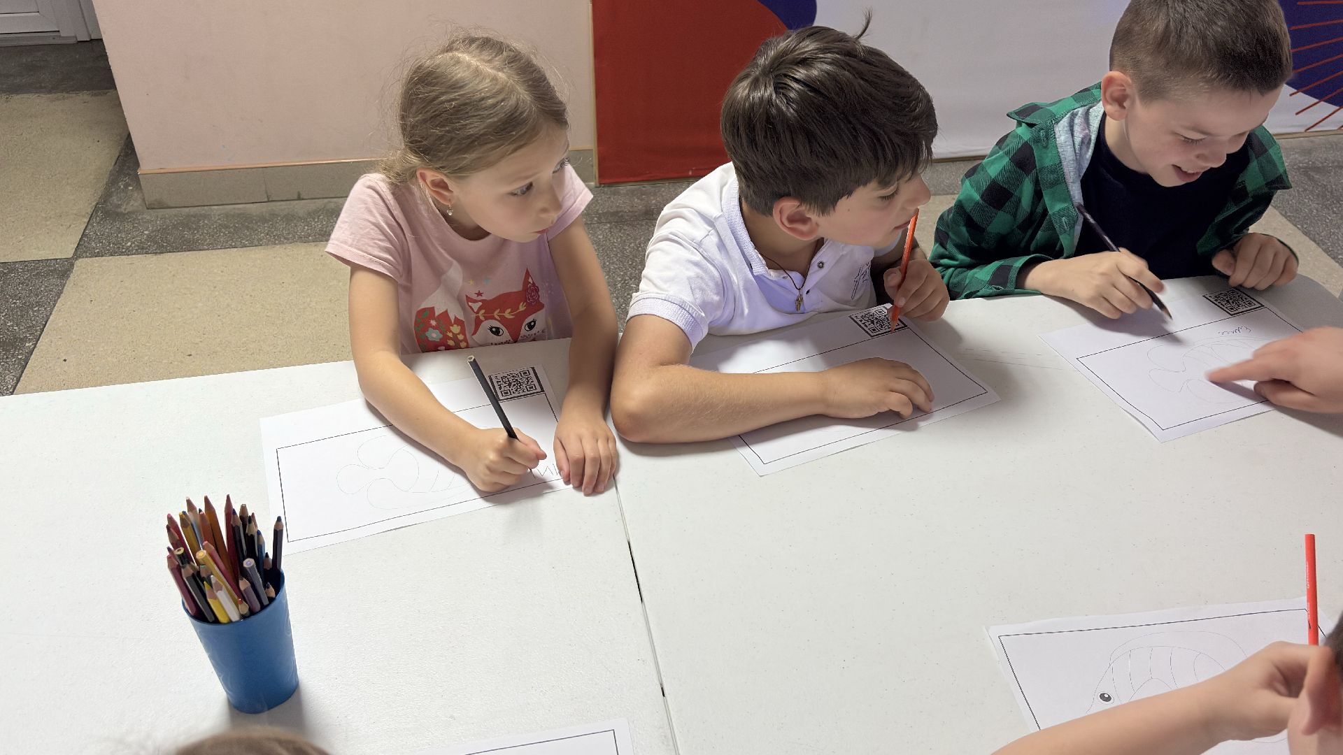 Для детей специально подготовили помещение с интерактивным оборудованием. В фойе второго этажа установлена доска, которая помогает нарисованным рыбкам оживать. Ребята раскрашивают заранее подготовленные рисунки, после чего те сканируются и появляются на экране интерактивной доски.