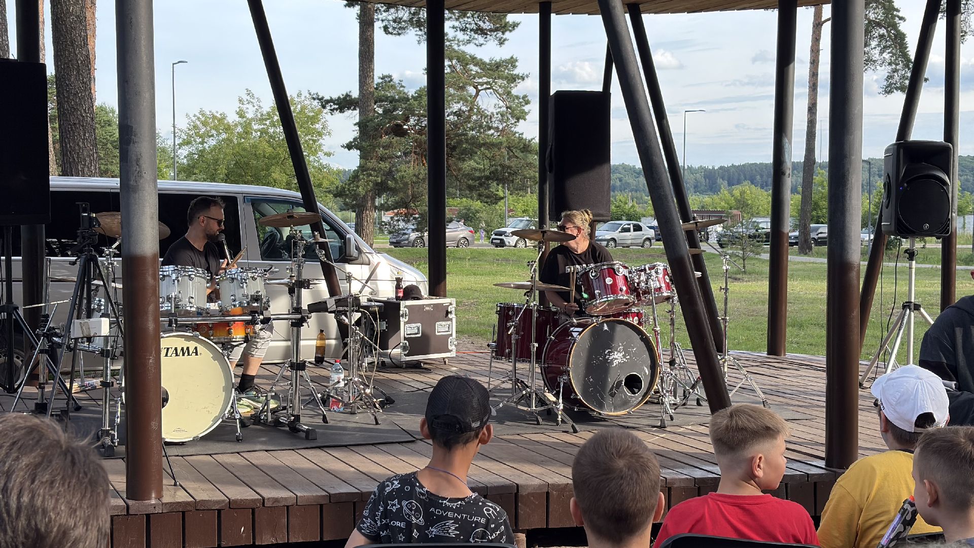 С другой стороны раздавался ритмичный звук барабанов. Там собрались любители живой музыки: на небольшой сцене проходила открытая джем-сессия с музыкантами рок-группы «Оз студио». Два барабанщика играли в унисон, приглашая к участию всех желающих — как новичков, так и опытных музыкантов. Среди участников были даже гости из других городов: например, одна из девушек приехала из Шатуры специально, чтобы сыграть на этой сцене.