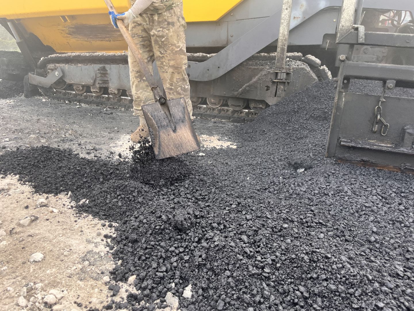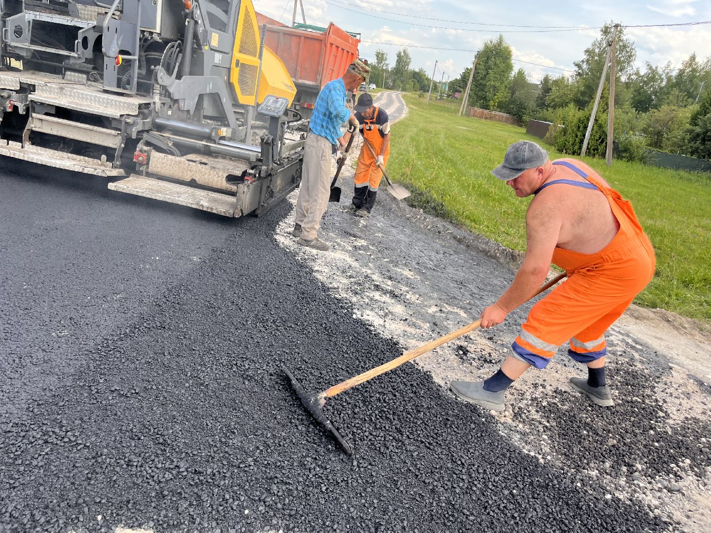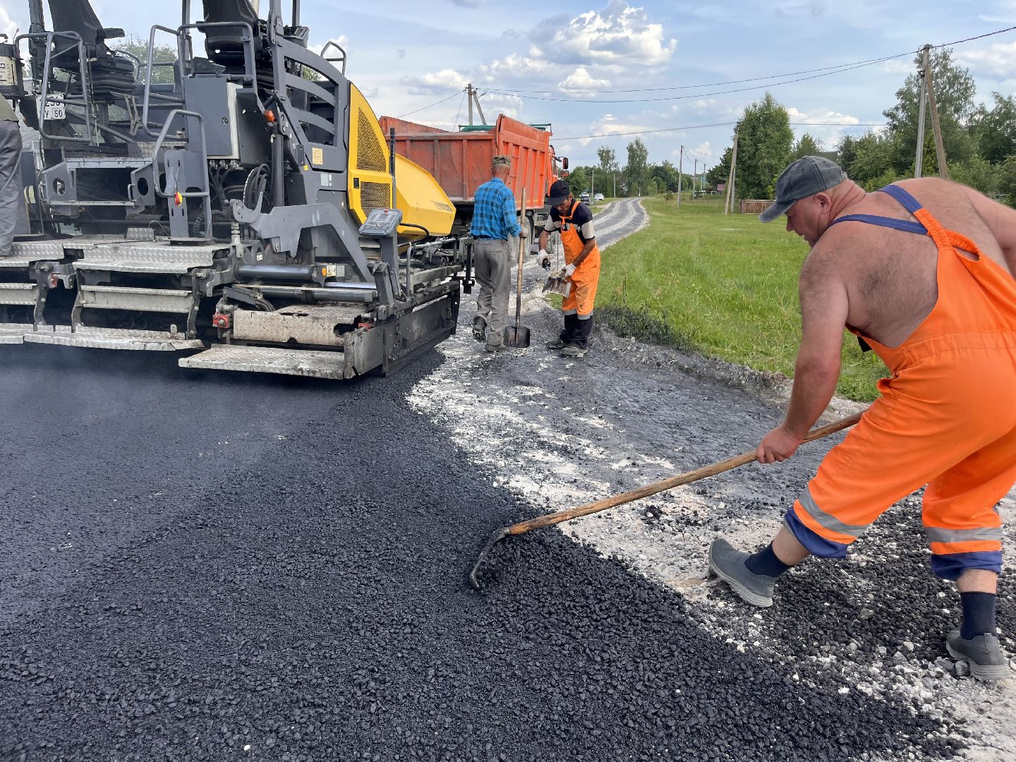 Укладка асфальта ведётся стремительно. В работе задействованы бригада из четырёх человек, шесть самосвалов, два катка и асфальтоукладчик.