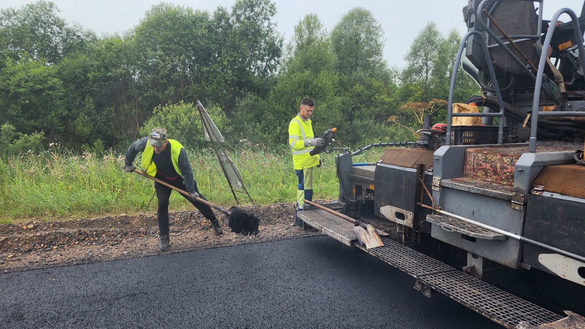 Дорожники отфрезеровали дорожное полотно, расчистили обочины на участке ремонта и начали укладку нового асфальта. На дорожное полотно длиной 850 и шириной 4 метра уходит около 600 тонн асфальтово-битумной смеси. После асфальтоукладчика следует бригада из трёх катков, которые трамбуют и само покрытие, и его кромку. Контролируют дорожники и толщину нового асфальта, и уклон, чтобы обеспечить сток воды с дороги во время дождя. После завершения основного этапа ремонта здесь укрепят обочину и нанесут дорожную разметку.