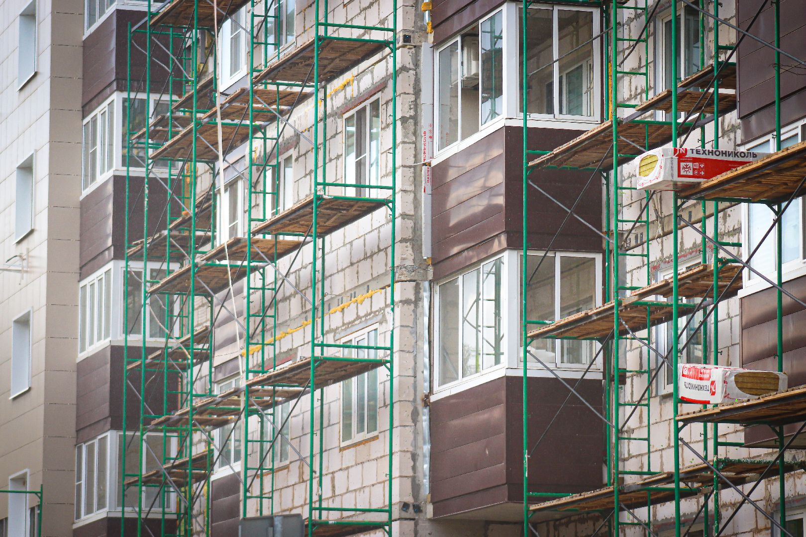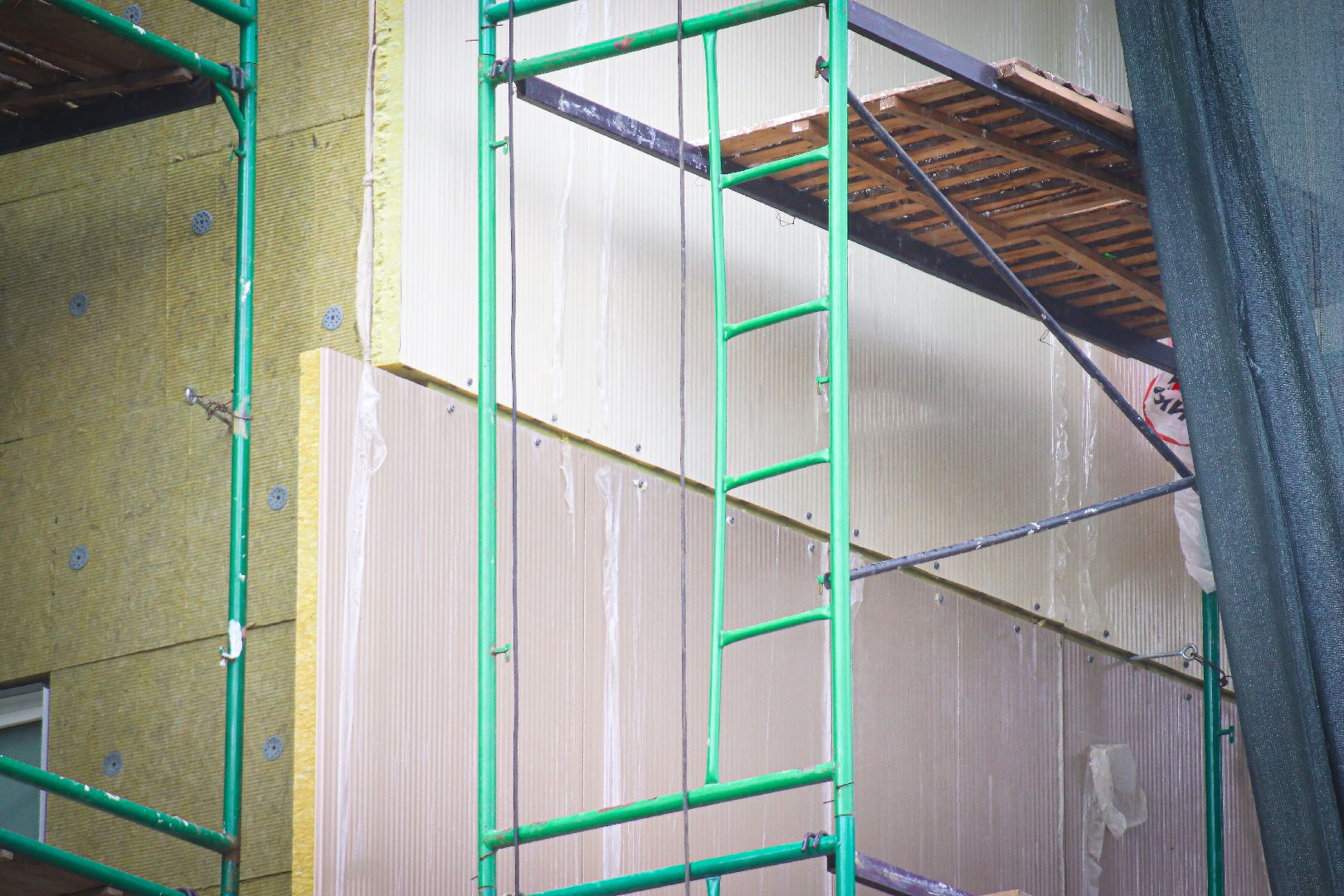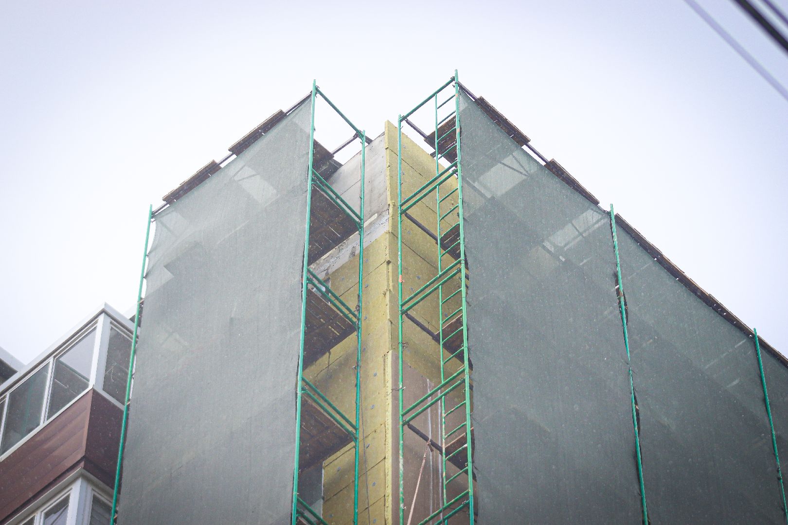 Коммунальщики начали масштабные работы по утеплению многоквартирного дома №4, корпус 1. На правой стороне девятиэтажки рабочие уже собрали леса, демонтируют старый слой утеплителя толщиной 150 мм и обшивки из керамогранитной плитки. Главная причина ремонта — некачественное утепление фасада, которое проявилось спустя годы и привело к промерзанию квартир зимой, образованию плесени и грибка.