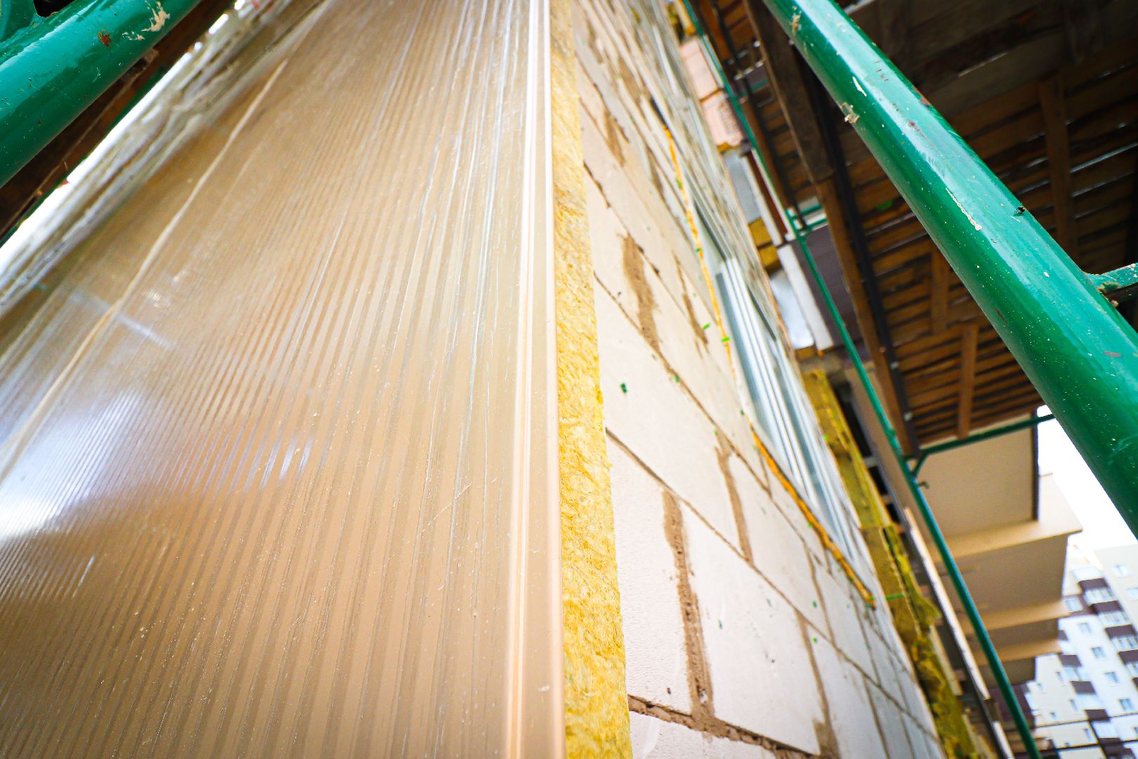 В местах, где 10 рабочих зачистили поверхность, утепляют швы вилотермом и гермобутилом. Затем монтируют дополнительный слой минеральной ваты толщиной 50 мм. Финальным этапом станет обшивка дома площадью 7,5 тыс. кв. м инновационной системой отечественного производства СУФ «Термоленд». Его толщина 80 мм, а срок службы — минимум 30 лет. Цвет приятный — бежево-серый.