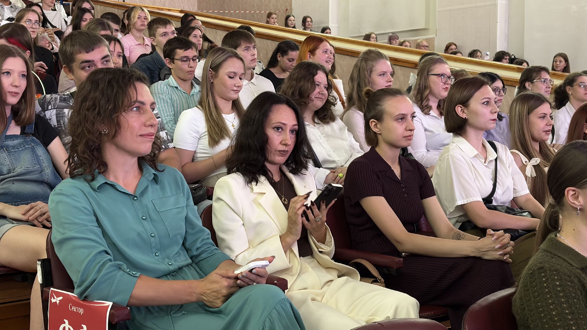 Праздничная программа в актовом зале оказалась неформальной и живой: ведущие вовлекали ребят в интерактивы, а кульминацией стал запуск бумажных самолётиков, которые каждый студент сделал своими руками. Этот момент символизировал новый старт и первый шаг в студенческую жизнь.