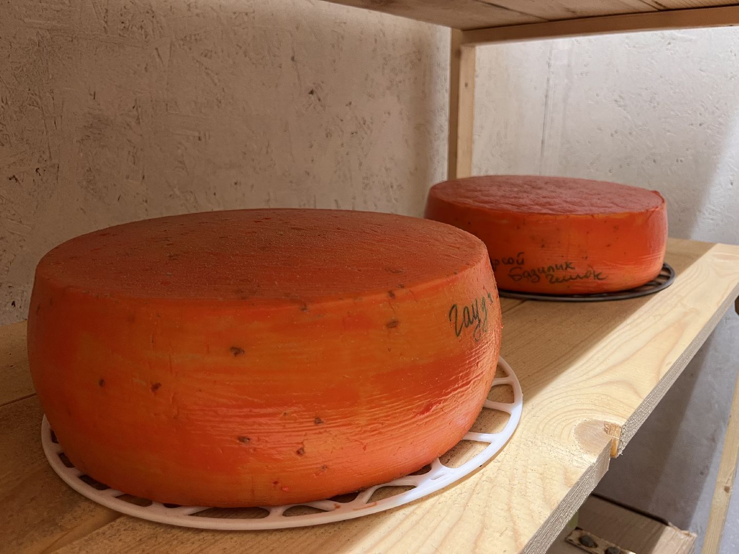 За сырными головками ежедневно ухаживают: следят за формированием красивой корочки, переворачивают и омывают их. Вес каждой головки — от семи с половиной до восьми килограммов.