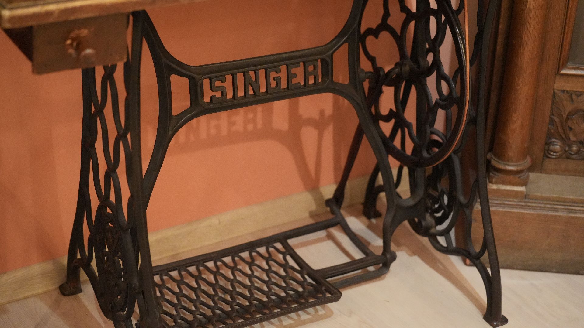 Второй экспонат — машинка 1889 года выпуска — строгие линии, массивная конструкция и качественные материалы делают машинку не только практичным инструментом, но и предметом гордости хозяйки, которым можно пользоваться до сих пор.