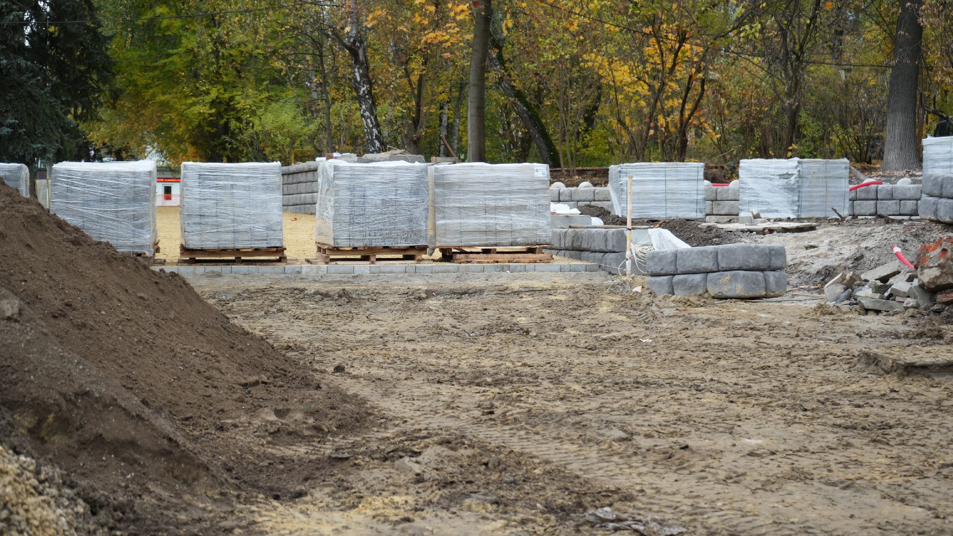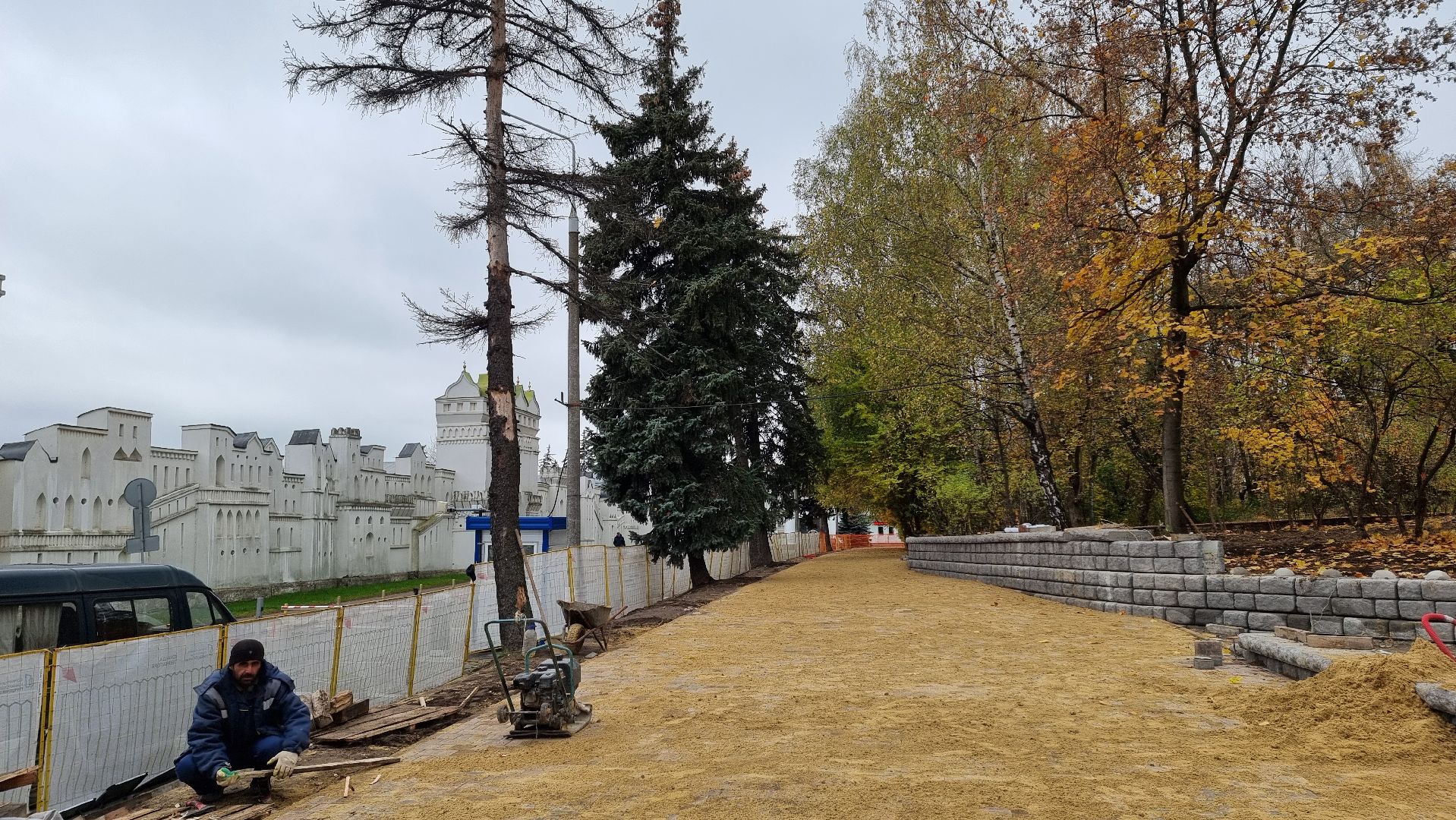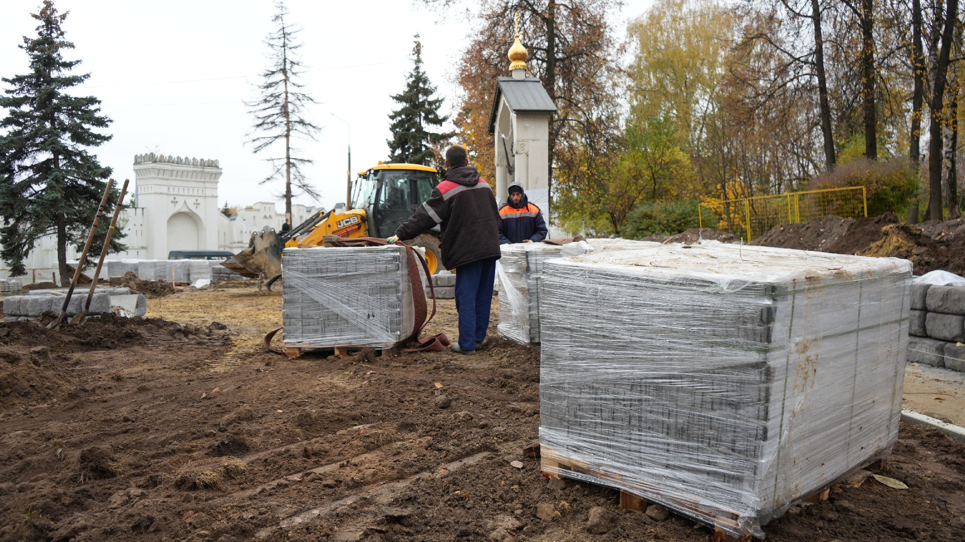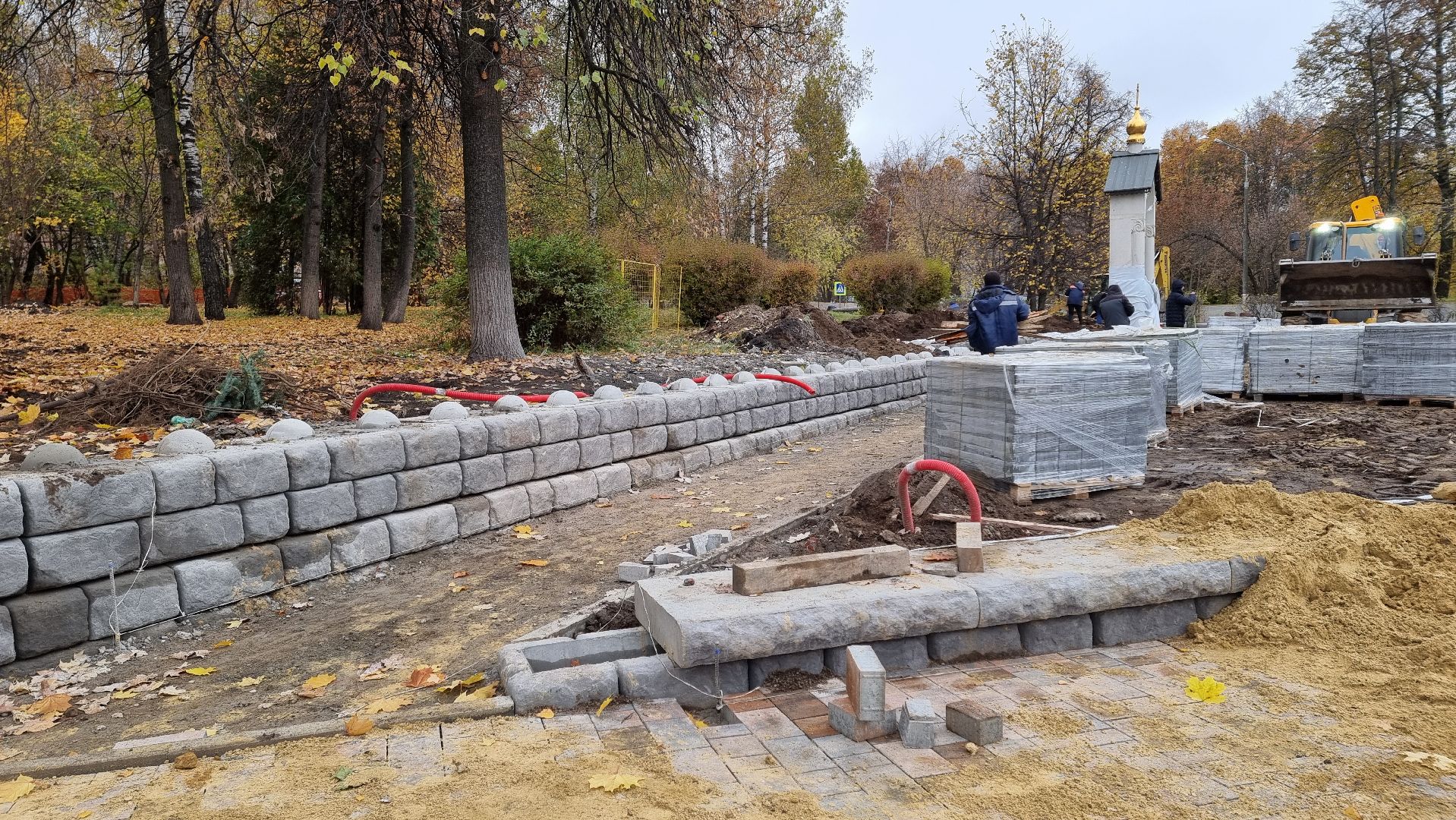 Старая опорная стена и тротуар полностью разобраны. Рабочие проложили около 45 кв. м дорожек, которые соединят сквер с соседним МФЦ в Дзержинском г. о. Люберцы. Сейчас они обустраивают больше 1000 кв. м пространства возле памятника Святителю Николаю и 220 кв. м тропинок, ведущих к проходной Федерального центра двойных технологий «Союз».