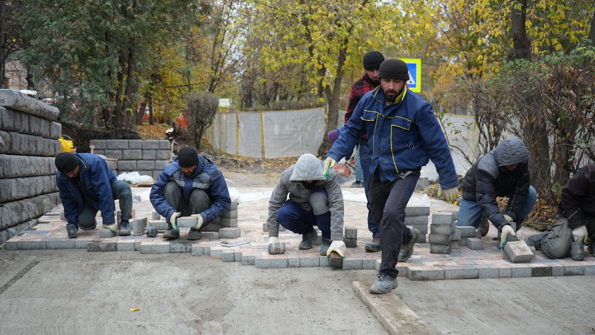 На стройке сейчас заняты больше 20 человек. Они выкладывают плитку, монтируют подпорные стенки и занимаются отделкой. Работу облегчают три погрузочные машины и КамАЗы — они регулярно подвозят материалы и оборудование.