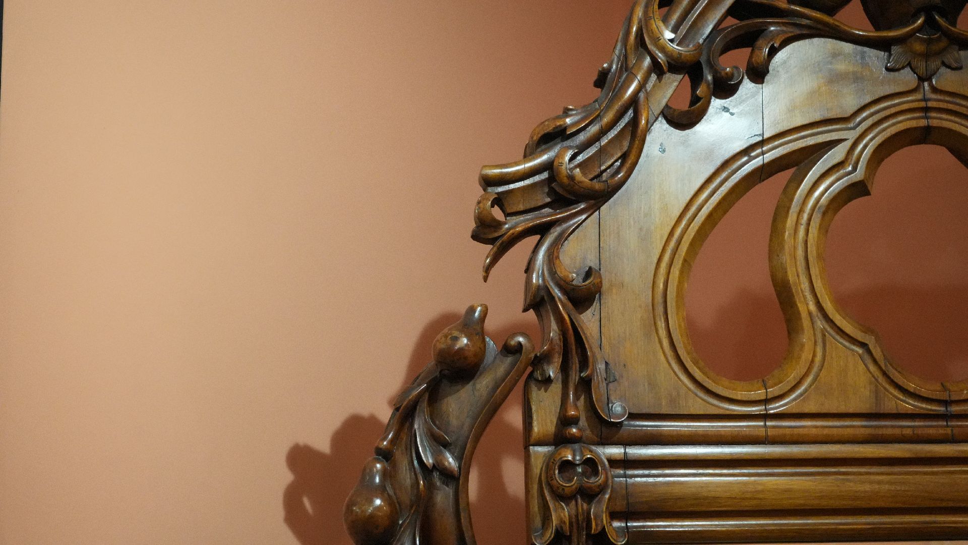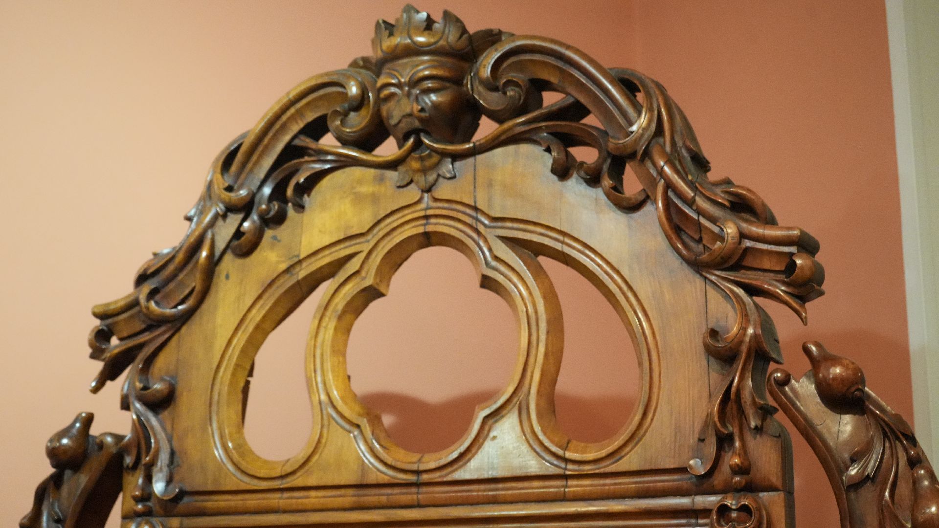 Габариты зеркала весомые: высота — 2,3 метра, ширина — 1,15. Тонкая резьба изображает груши, листья и загадочную маску из растительных мотивов. Но главное — его конструкция: зеркало поворотное, а в нижних нишах рамы, вероятно, когда‑то размещались резные дверцы, закрывающие маленькие полочки, а в верхних были дополнительные зеркала — они отражали свет канделябров, создавая причудливую игру бликов.