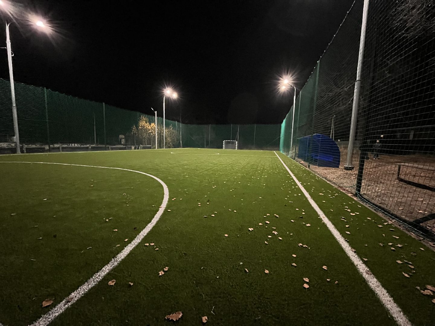 На площадке создали качественную основу, на которую уложили искусственный газон, установили осветительные опоры с защитной сеткой и футбольные ворота. Также предусмотрели скамьи для запасных игроков с навесом.