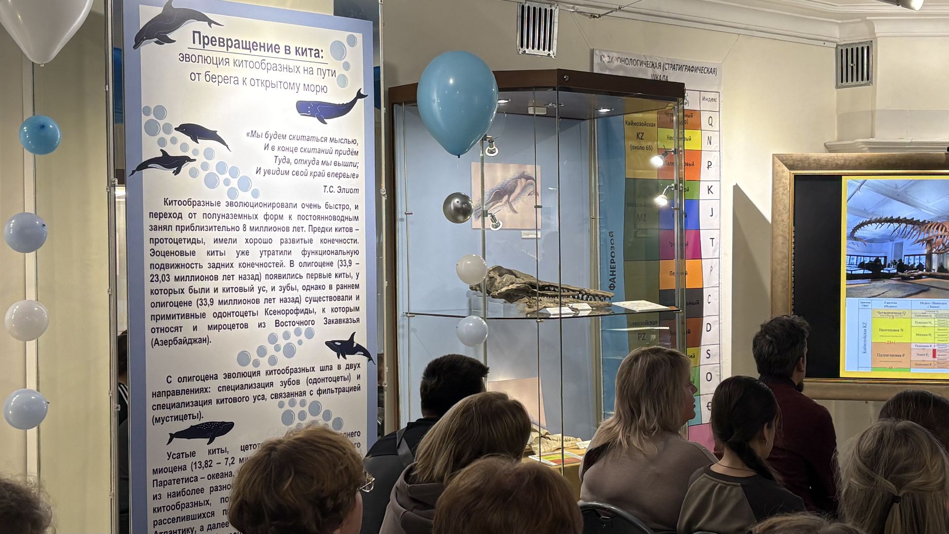 Экскурсию и лекцию провёл главный хранитель фондов Палеонтологического музея им. Ю.А. Орлова, кандидат биологических наук Константин Константинович Тарасенко. Учёный рассказал о ключевых этапах превращения китообразных, о том, как на их развитие влияли изменения климата и среды обитания, и почему именно эти животные стали одними из самых успешных в истории эволюции.