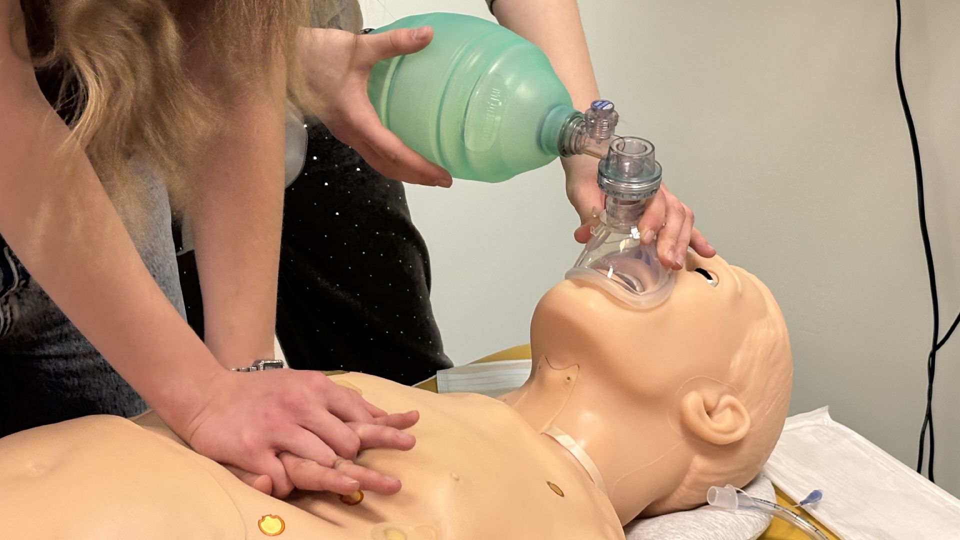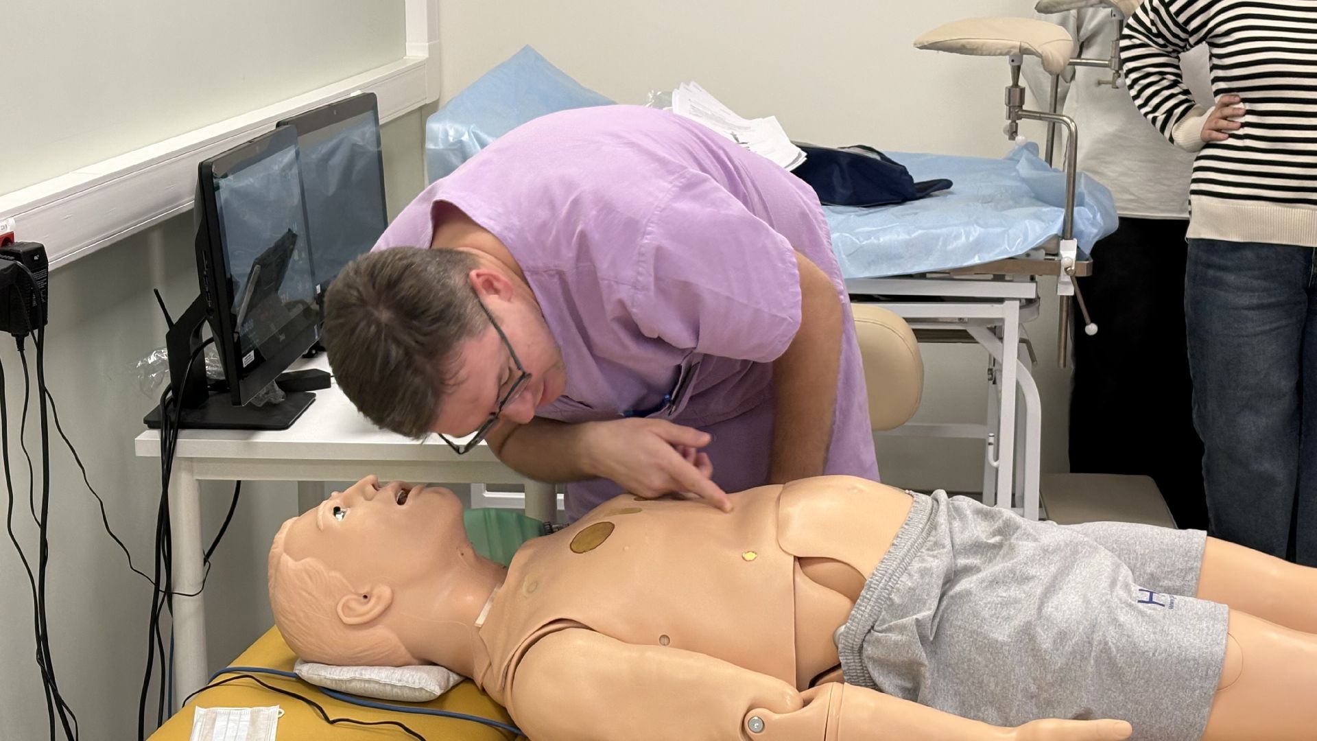 Сегодня в перинатальном центре особенно много молодёжи. Студентки Коломенского филиала Московского областного медицинского колледжа учились проводить сердечно-лёгочную реанимацию. Посещение будущими медиками родильного отделения стало доступным благодаря проекту «Пора всё знать», к которому центр присоединился весной 2025 года. Его задача — показать и рассказать подросткам и студентам медколледжа о здоровом образе жизни.