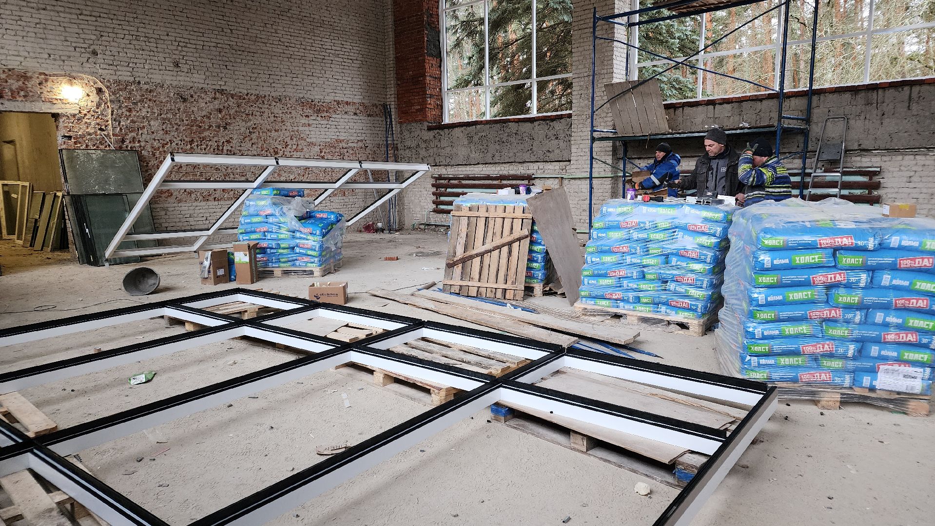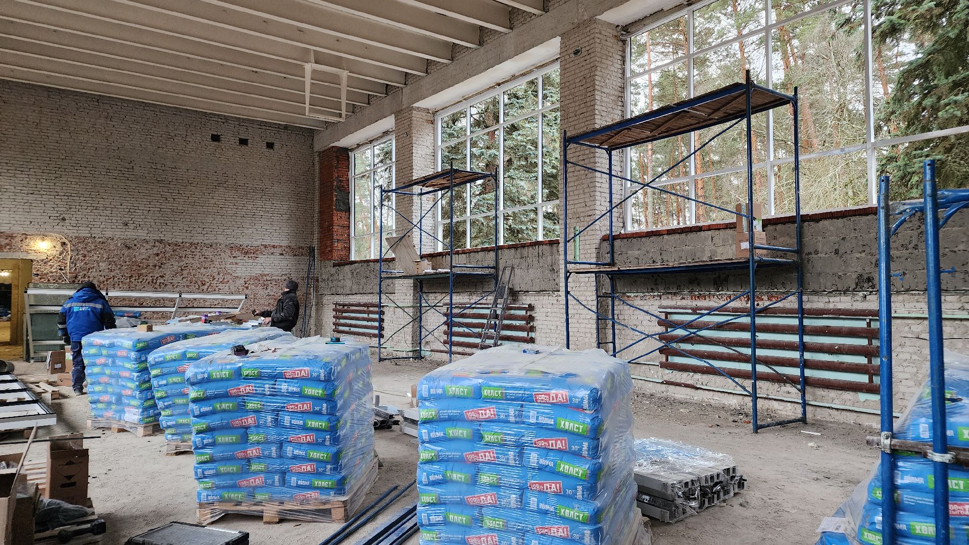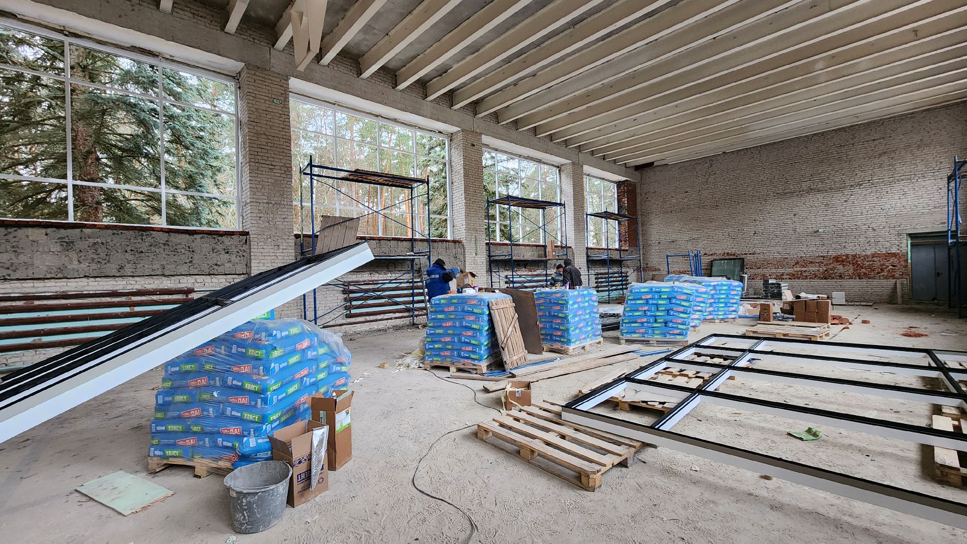 Прямо сейчас идёт установка больших нестандартных окон — так называемых витражей — в спортивном и актовом залах, а также на лестничных маршах.