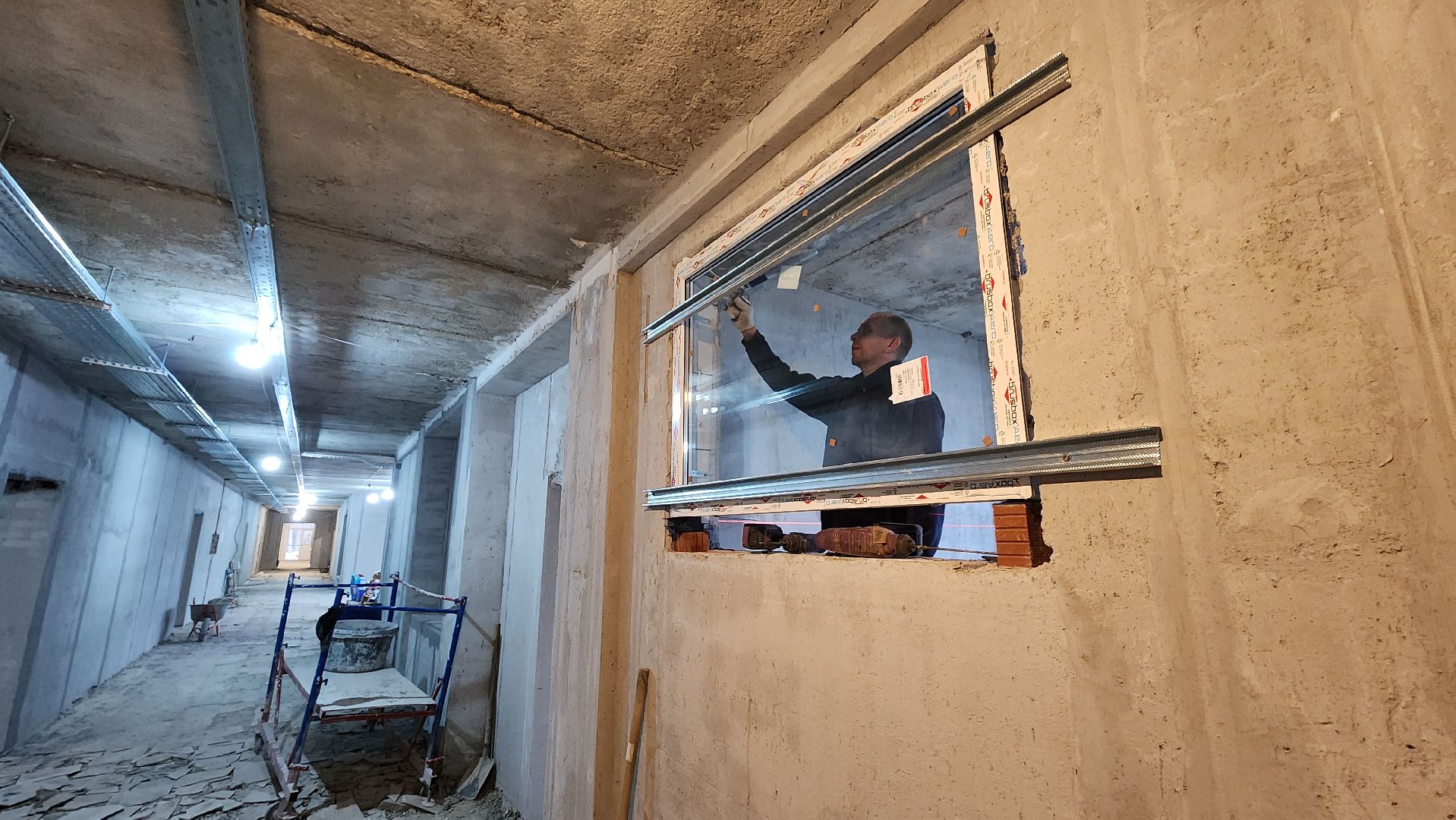 Помимо остекления, в здании активно ведутся другие работы. Прокладываются электрические и слаботочные кабели, идёт штробление стен под розетки и выключатели. Завершается устройство полусухой стяжки полов в младшем корпусе. По словам строителей, штукатурные работы на объектах выполнены уже на 82%, и вскоре начнётся этап чистовой отделки.